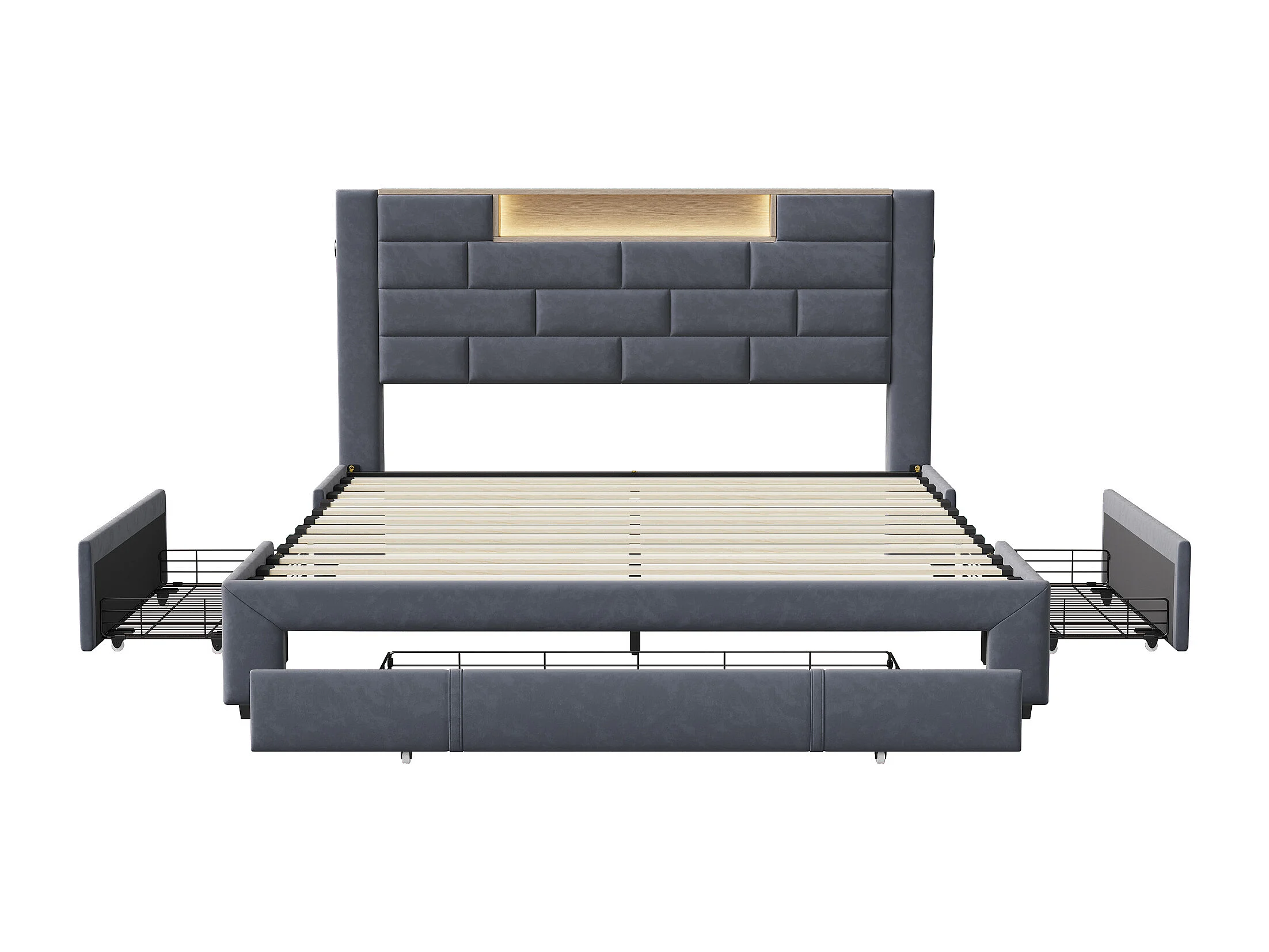 Lit 160x200 cm avec sommier à lattes - NEXU lit double 160x200 cm avec rangement en tête de lit - LED - USB - lit tiroir 160 x 200 cm - tissu en velours - gris