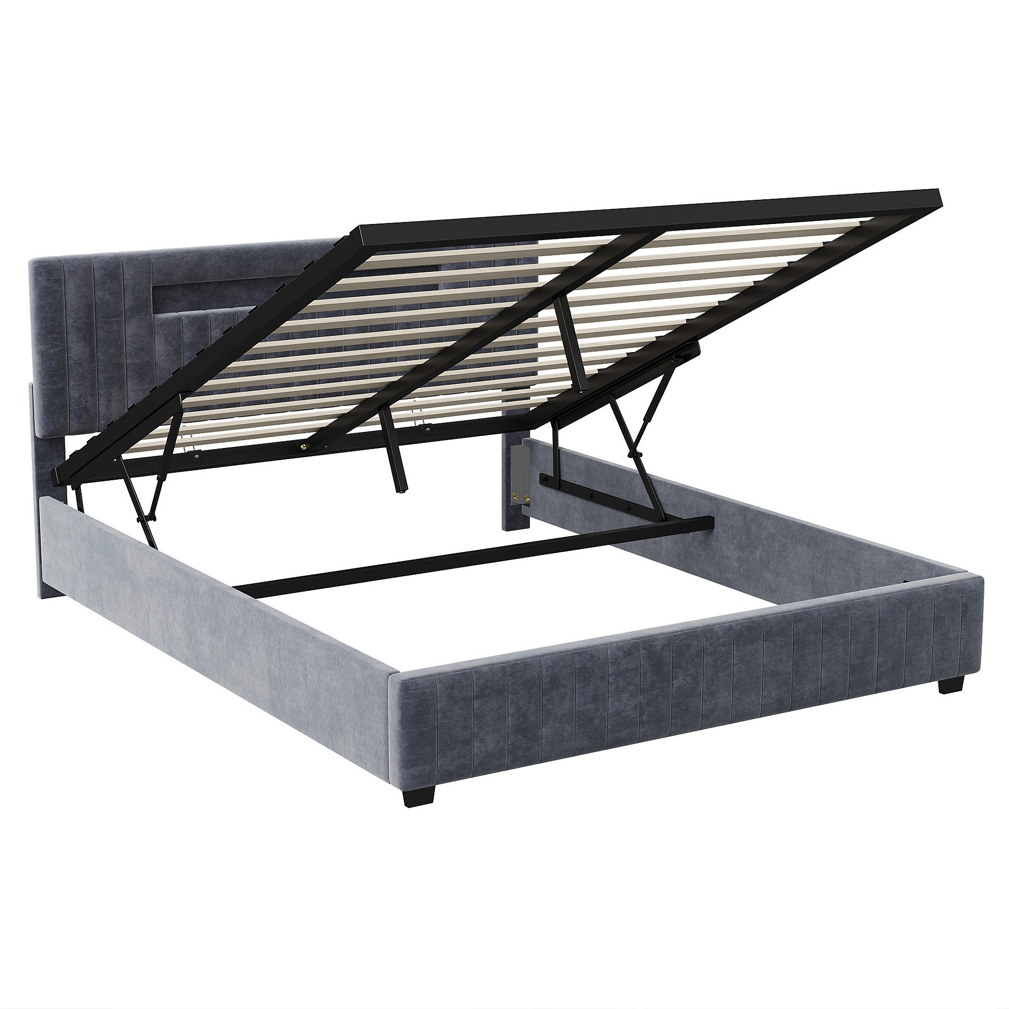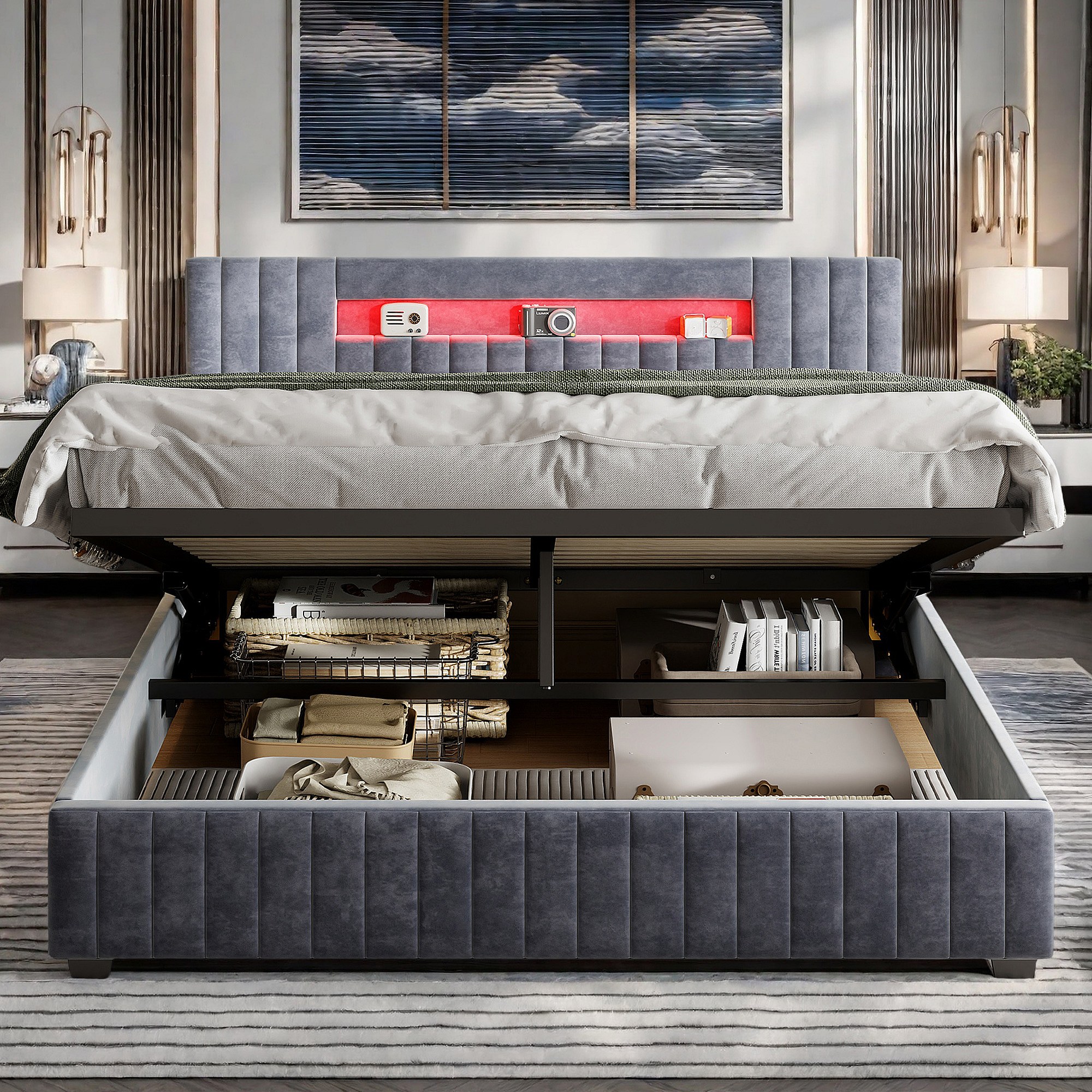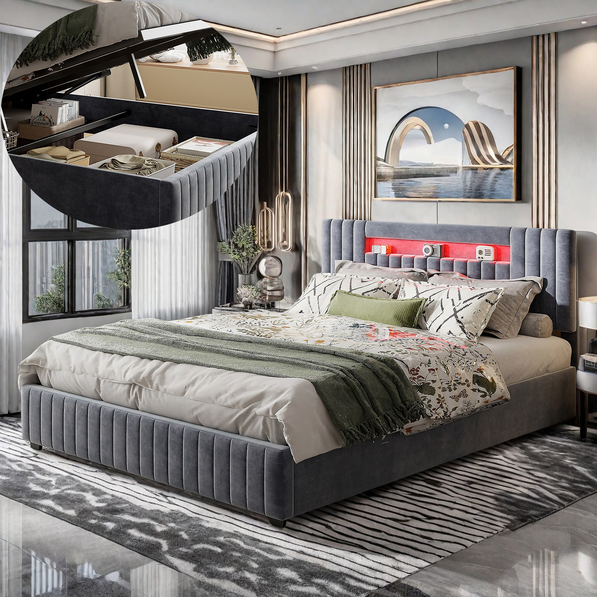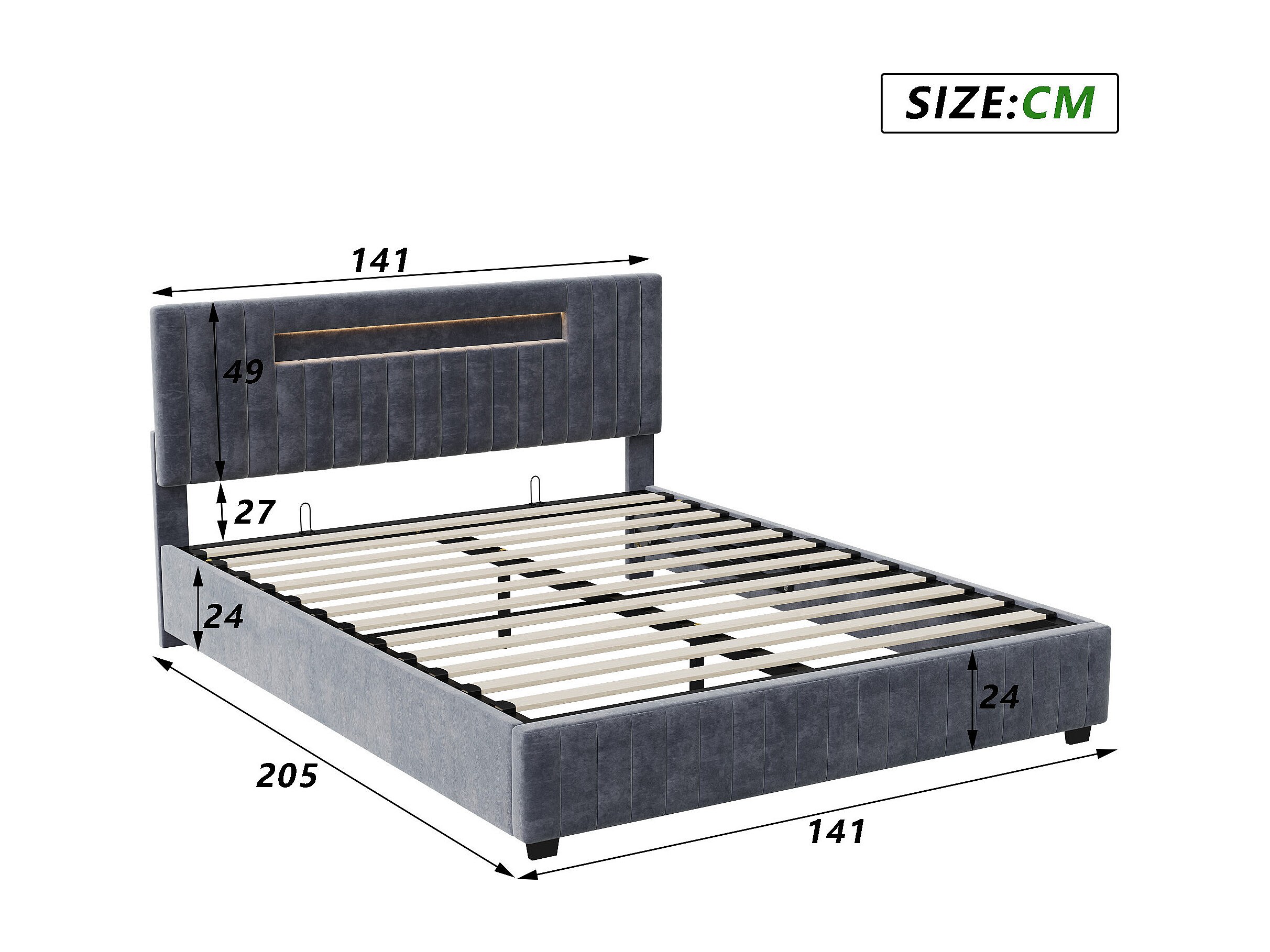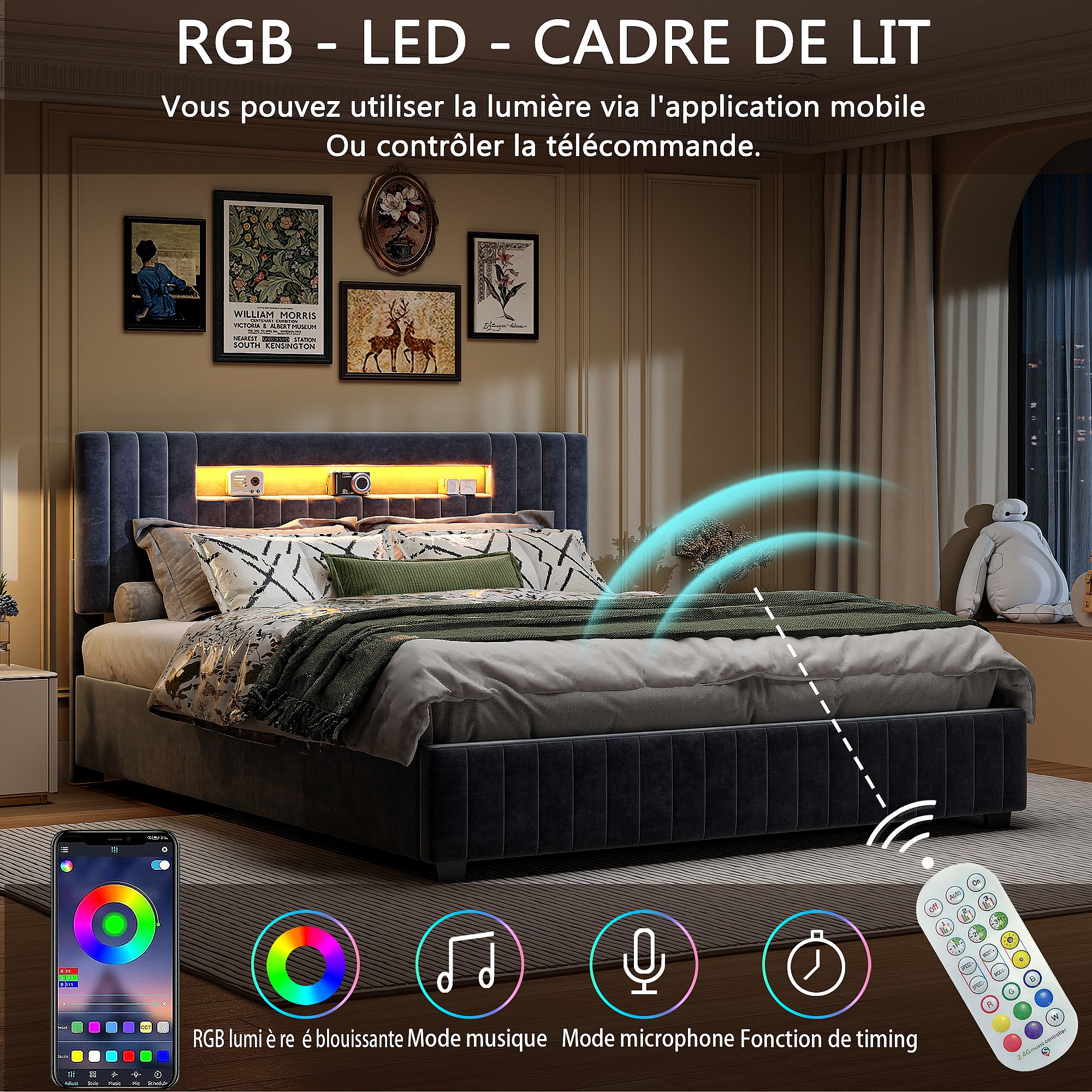 Lit 140x200 cm - NEXU - lit 140x200 cm Capitonné avec LED RGB et coffre - lit 140x200 cm tissu en velours - gris