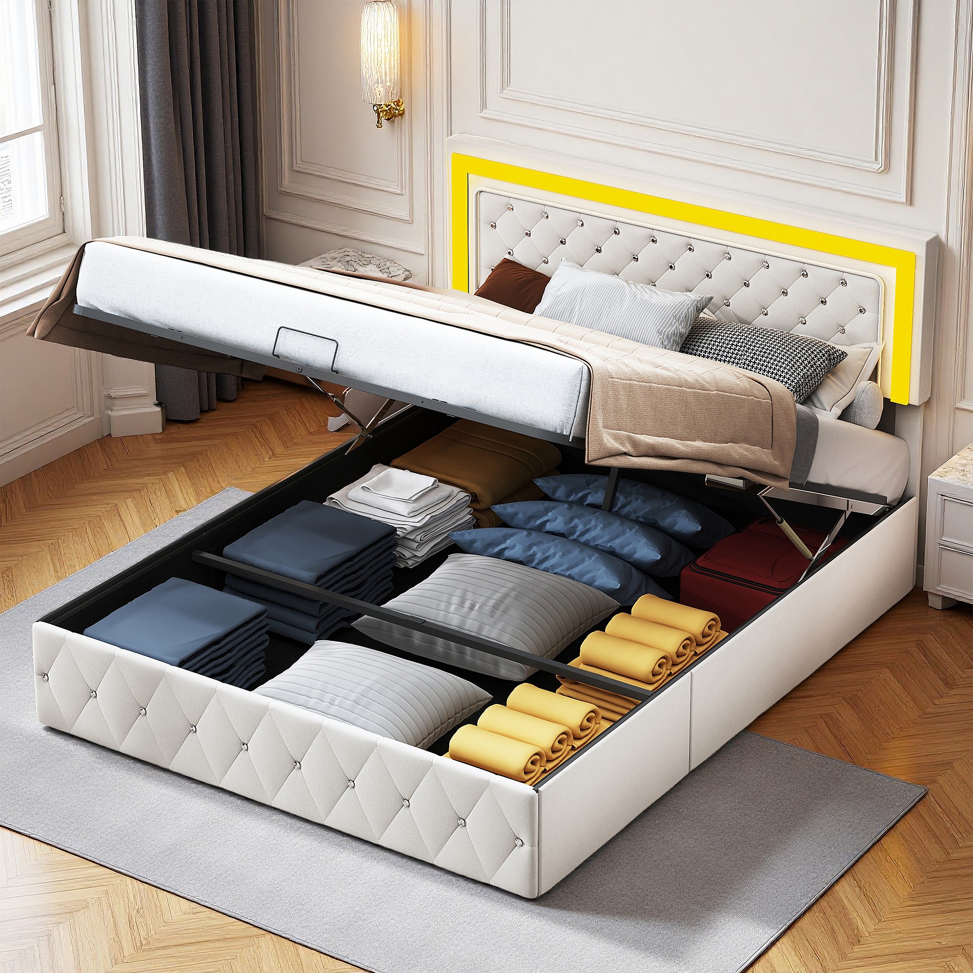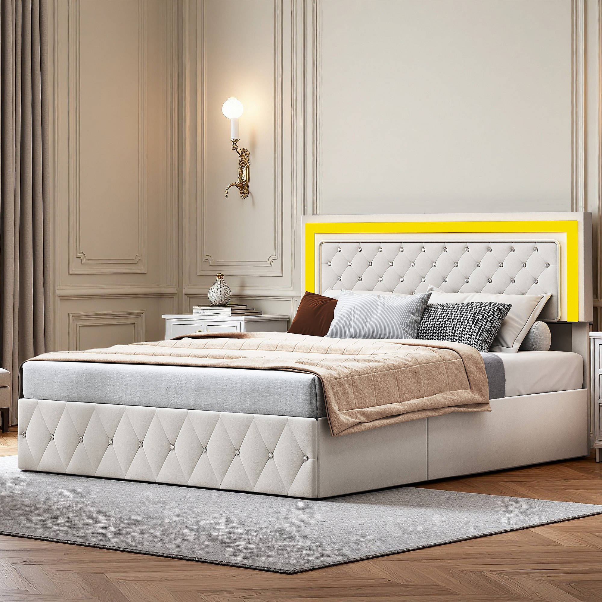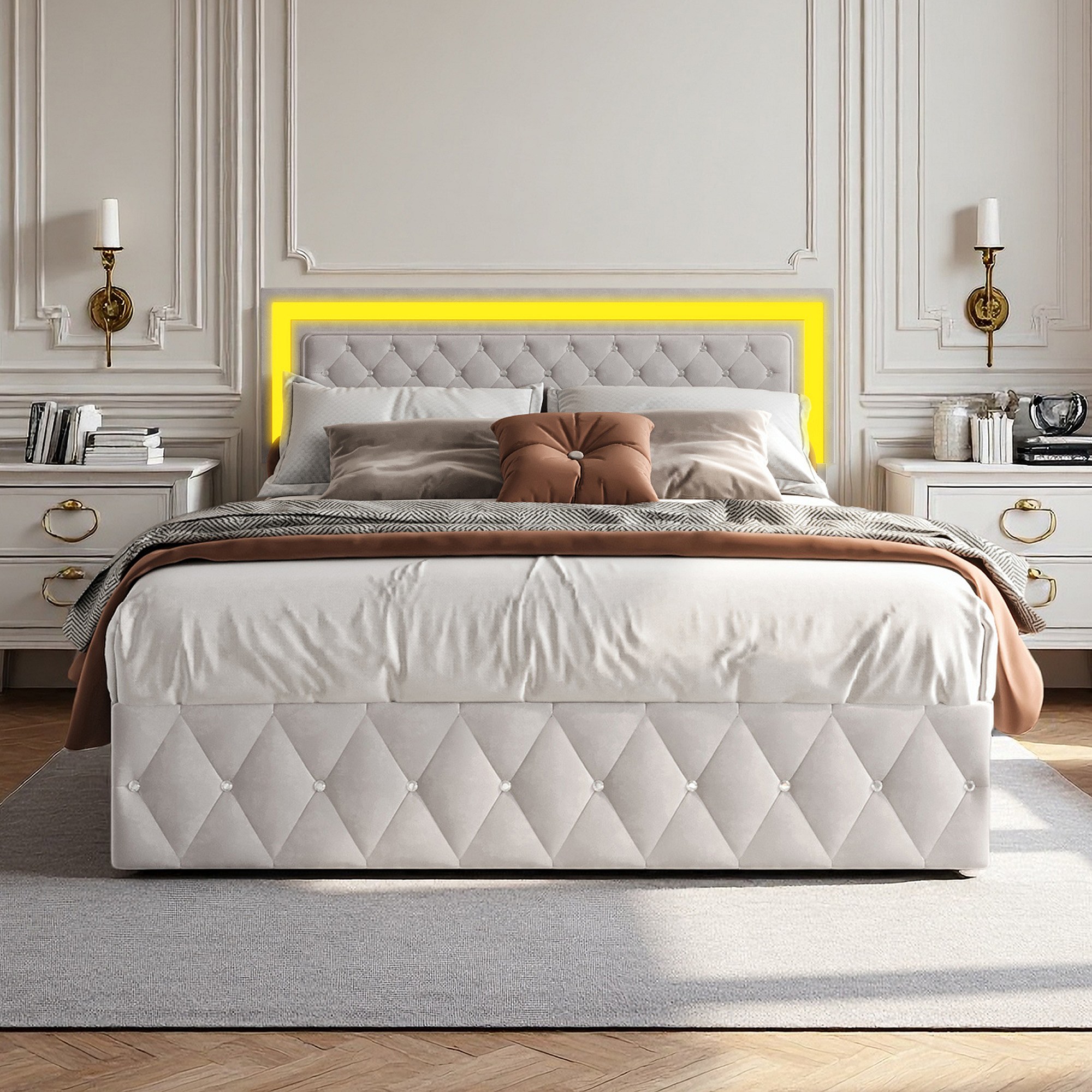 Lit 140x200 cm - NEXU - lit coffre 140x200 cm avec LED - cadre de lit double 140x200 cm avec sommier à lattes - tissu en velours - beige