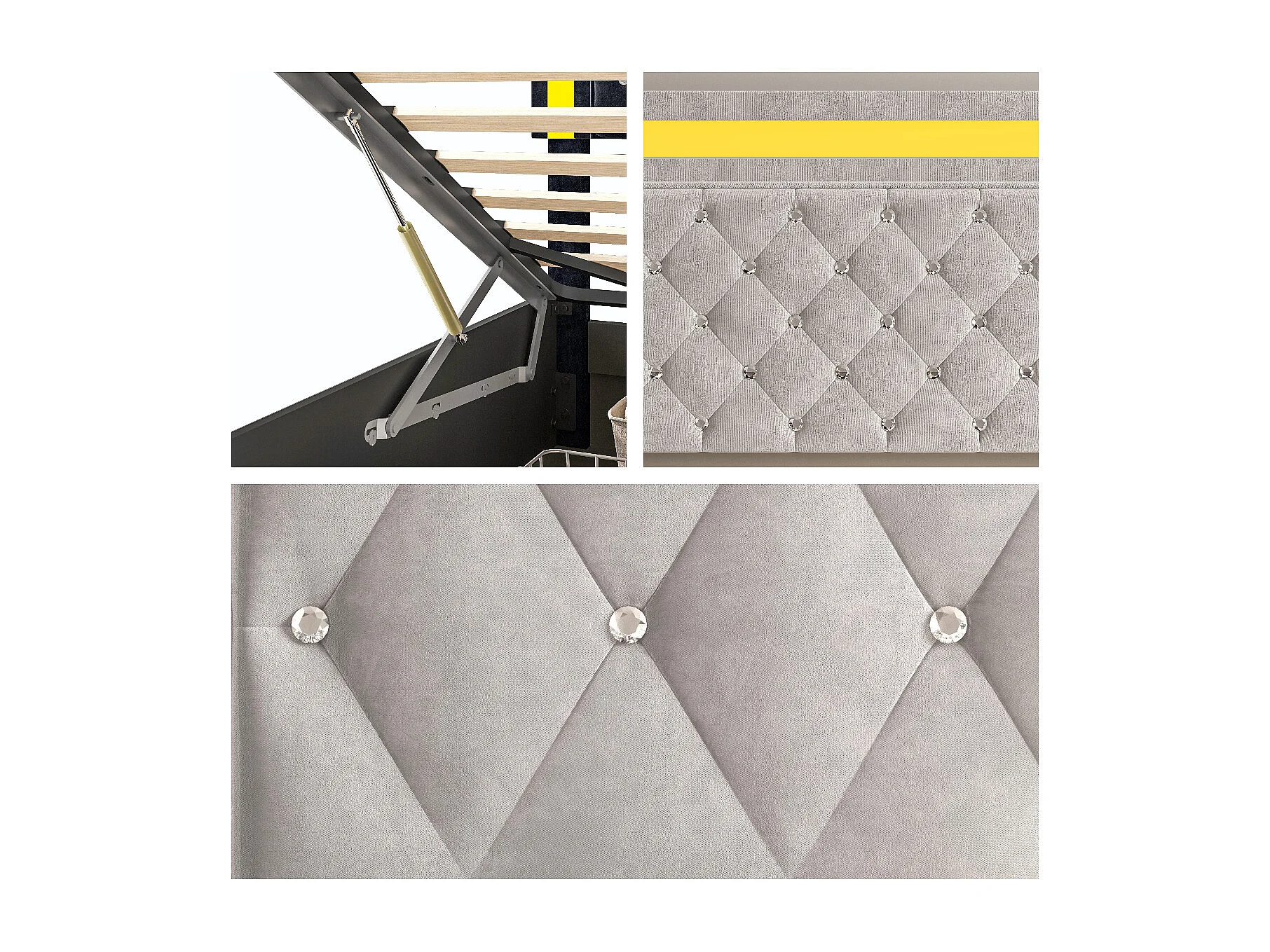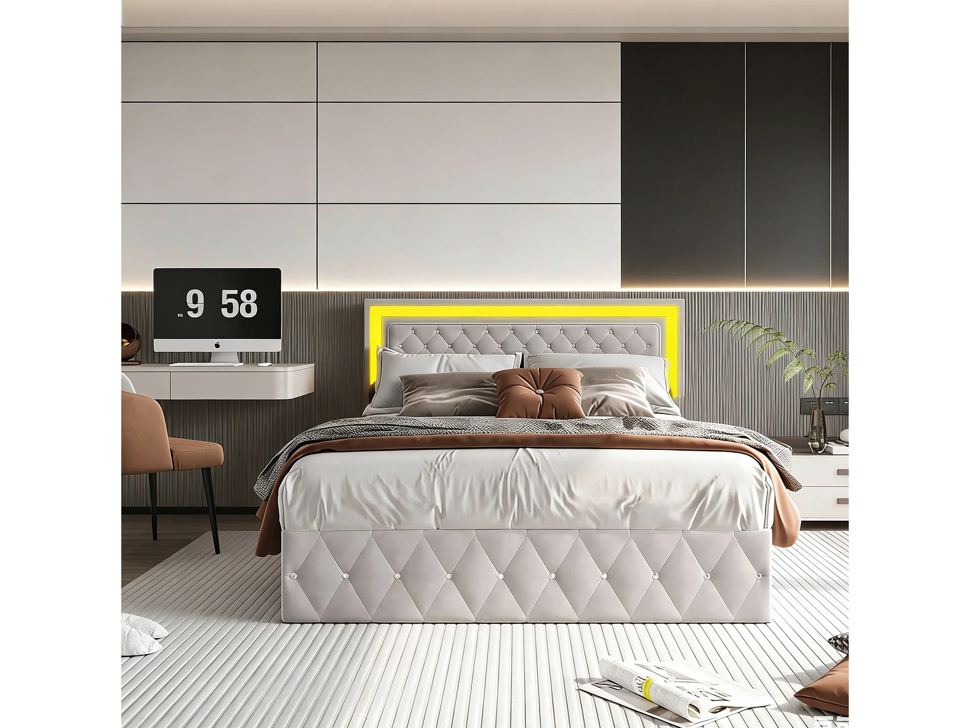 Lit coffre 140x200 cm en velours avec sommier à lattes - tête de lit LED - lit adulte 140x200 cm capitonné - beige