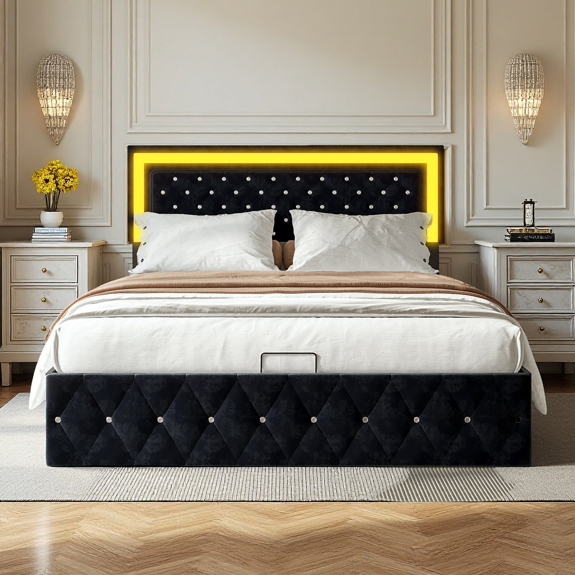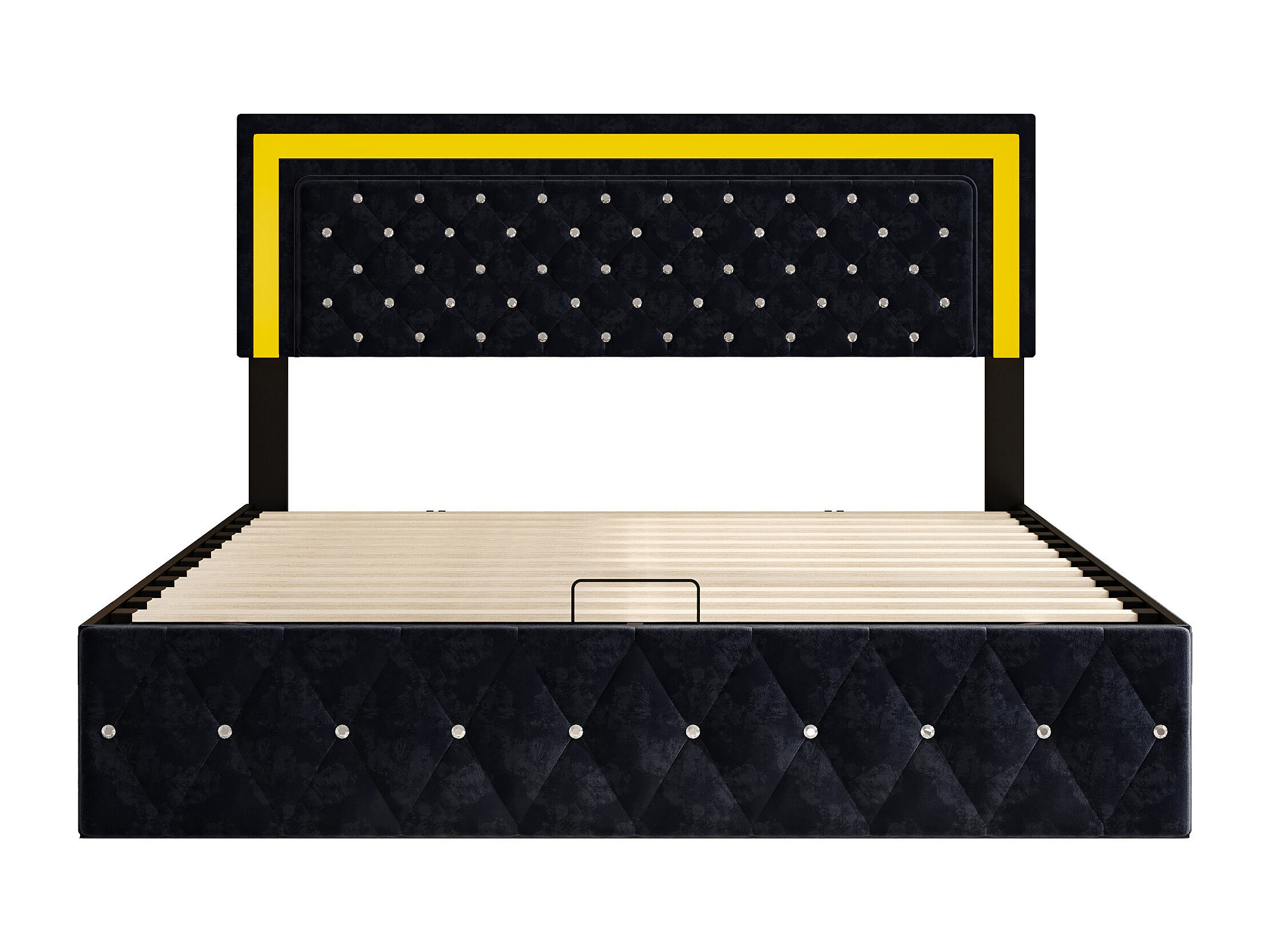 Lit 140x200 cm - NEXU - lit coffre 140x200 cm avec LED - cadre de lit double 140x200 cm avec sommier à lattes - tissu en velours - noir