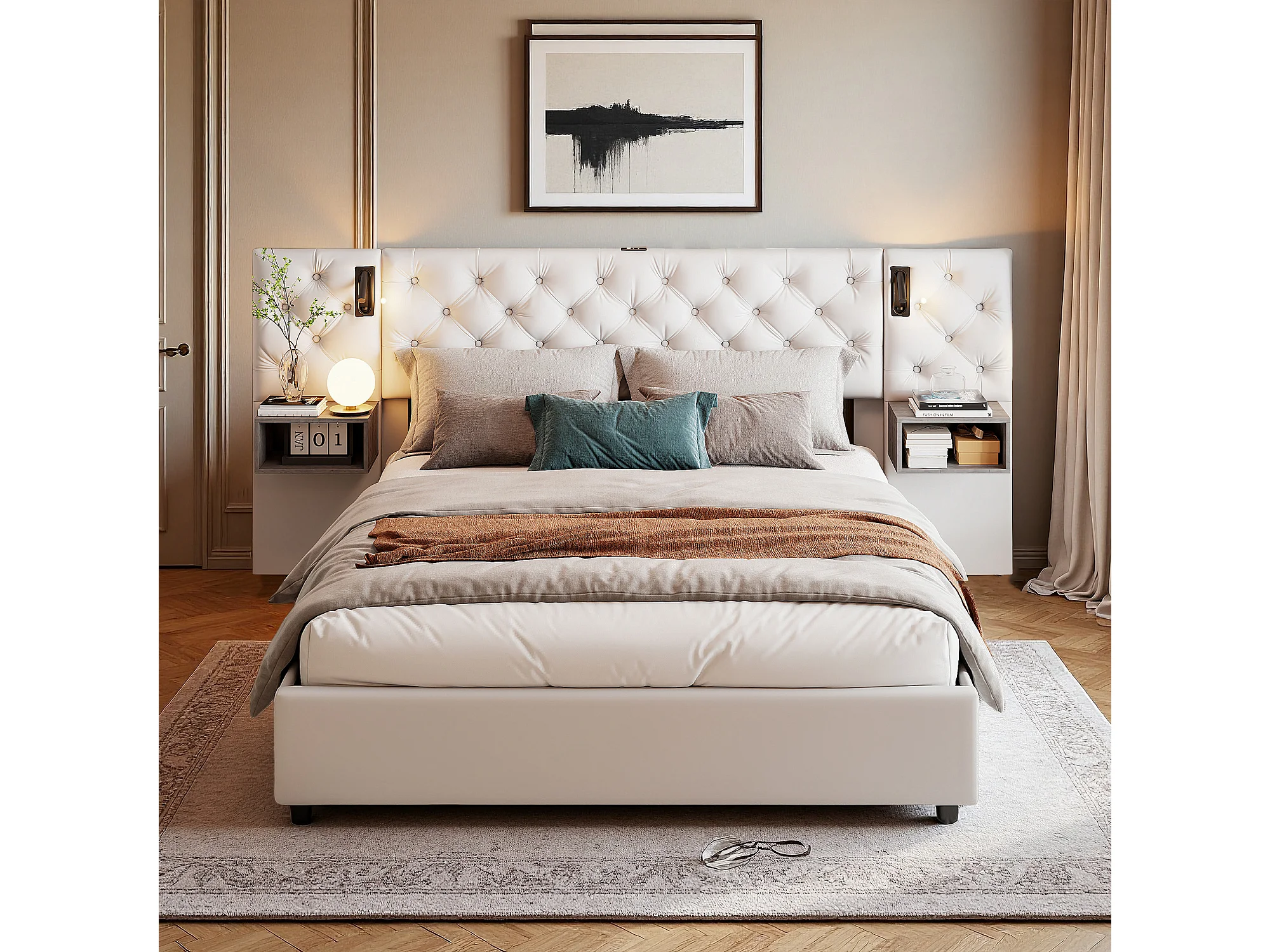 Lit coffre adulte 140x200cm, rembourré tête de lit avec liseuse et prises chargement, 2 tables de chevet, sommier en lattes, en velours, blanc cassé