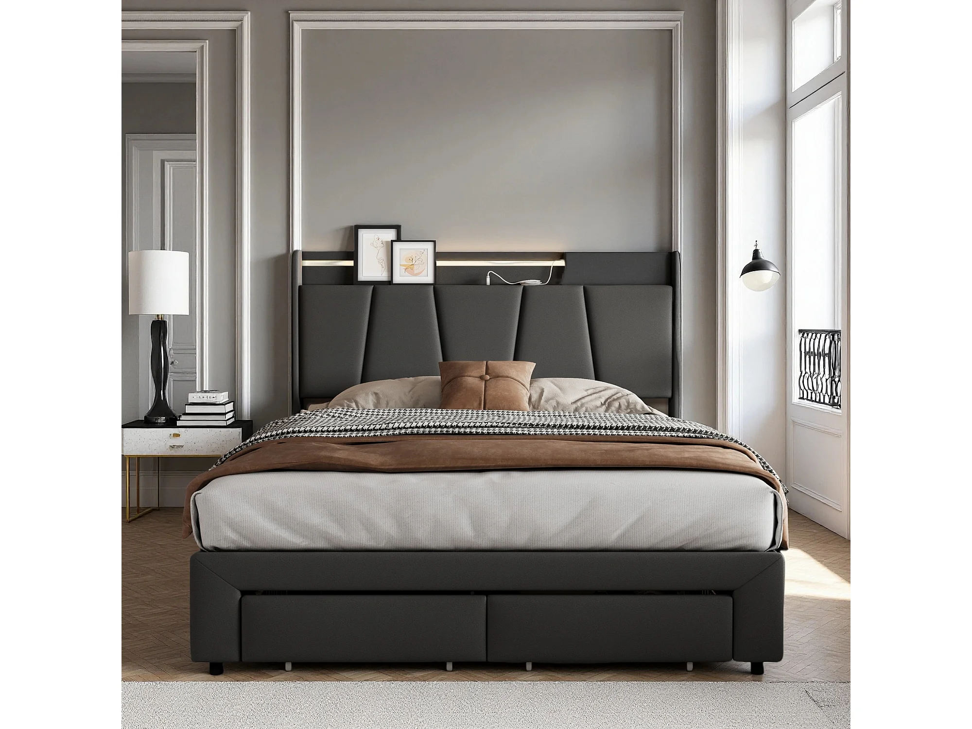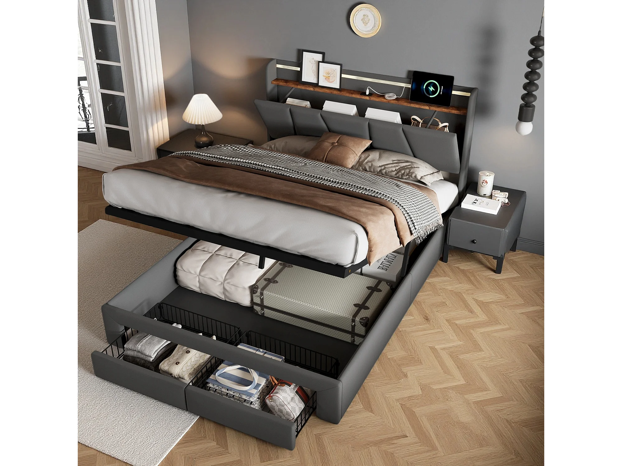 Lit coffre 140x200 cm - sommier à lattes - grand rangement - tiroirs - lit adulte avec LED RGB et USB - lin - gris