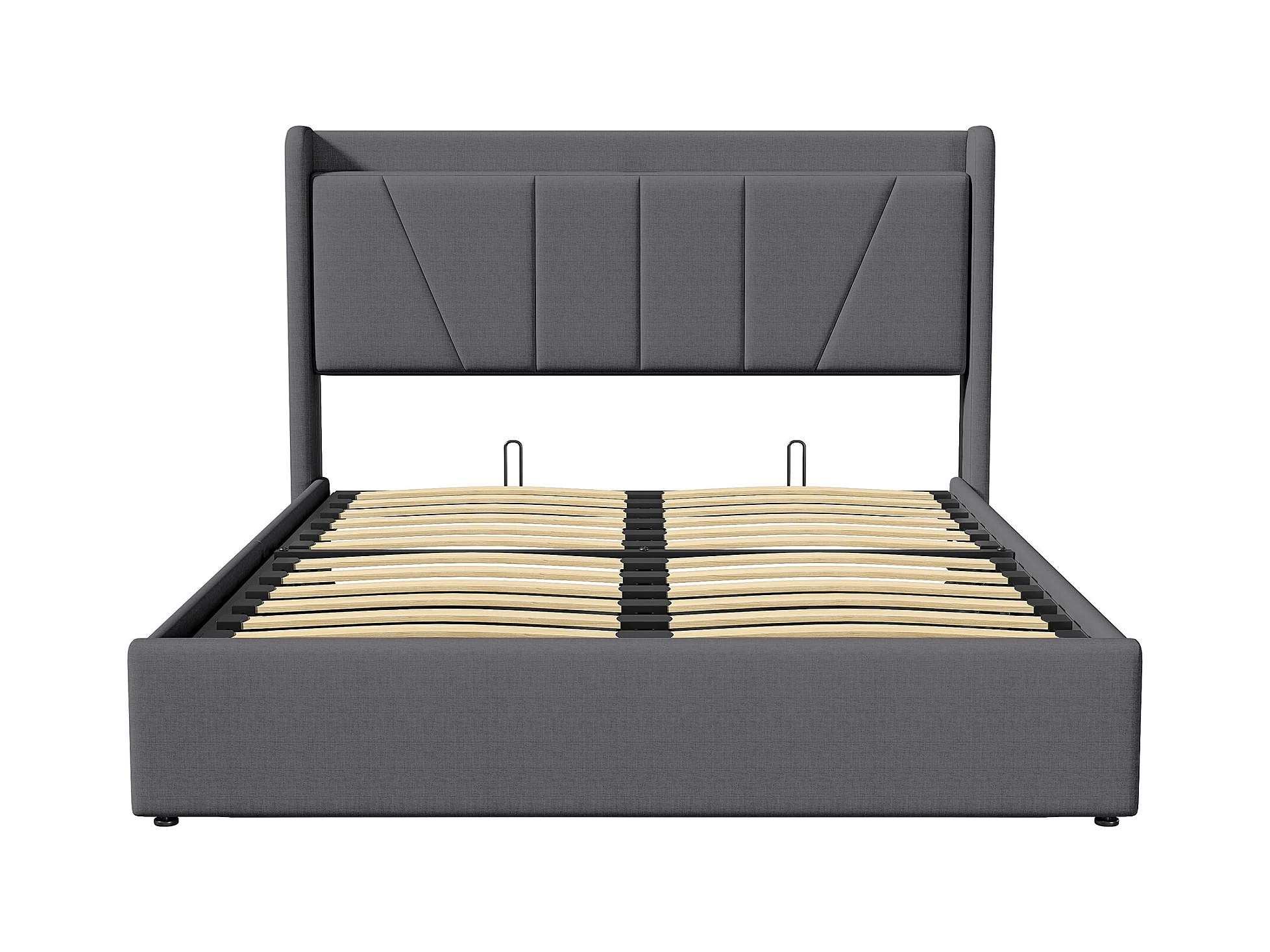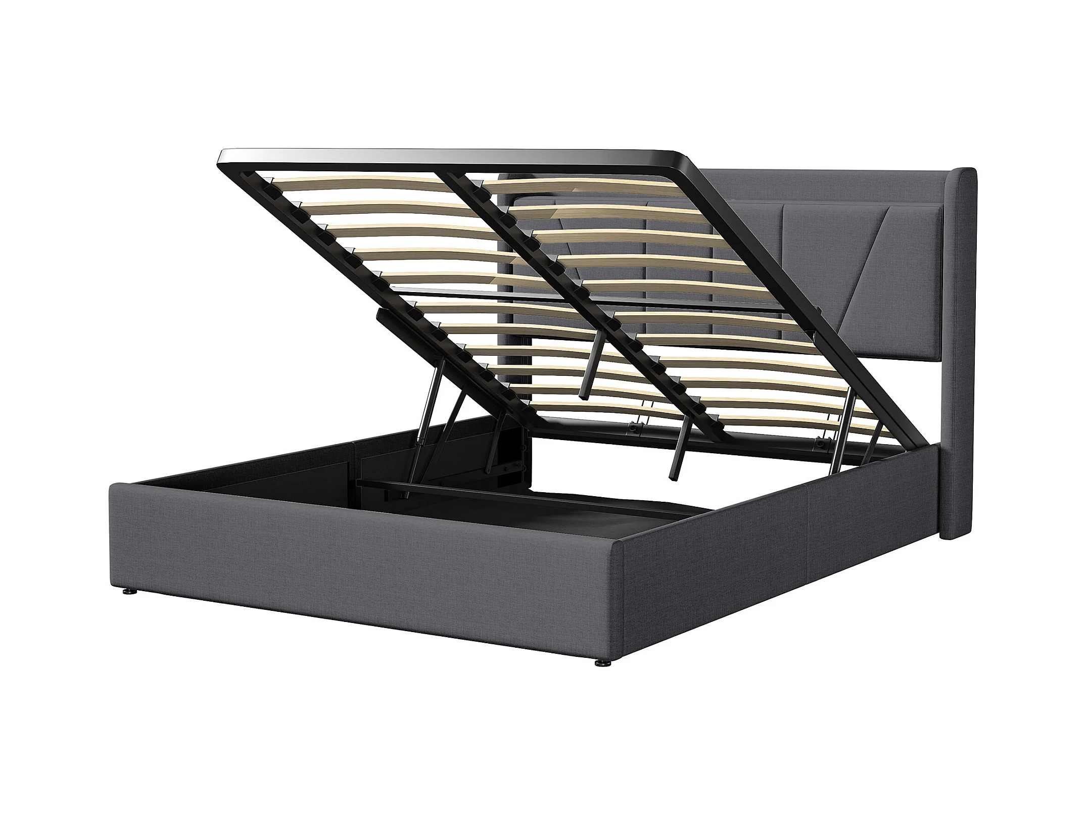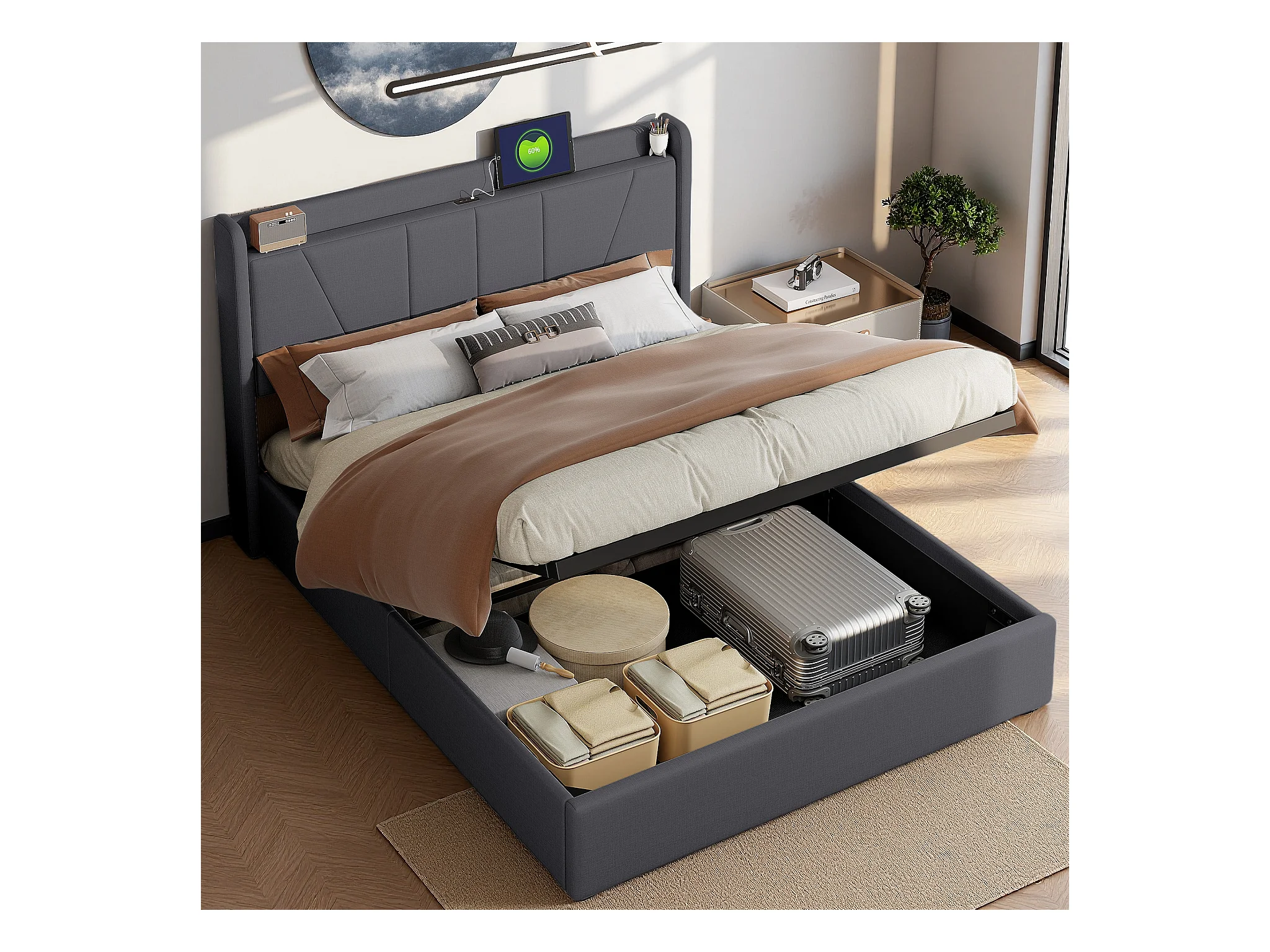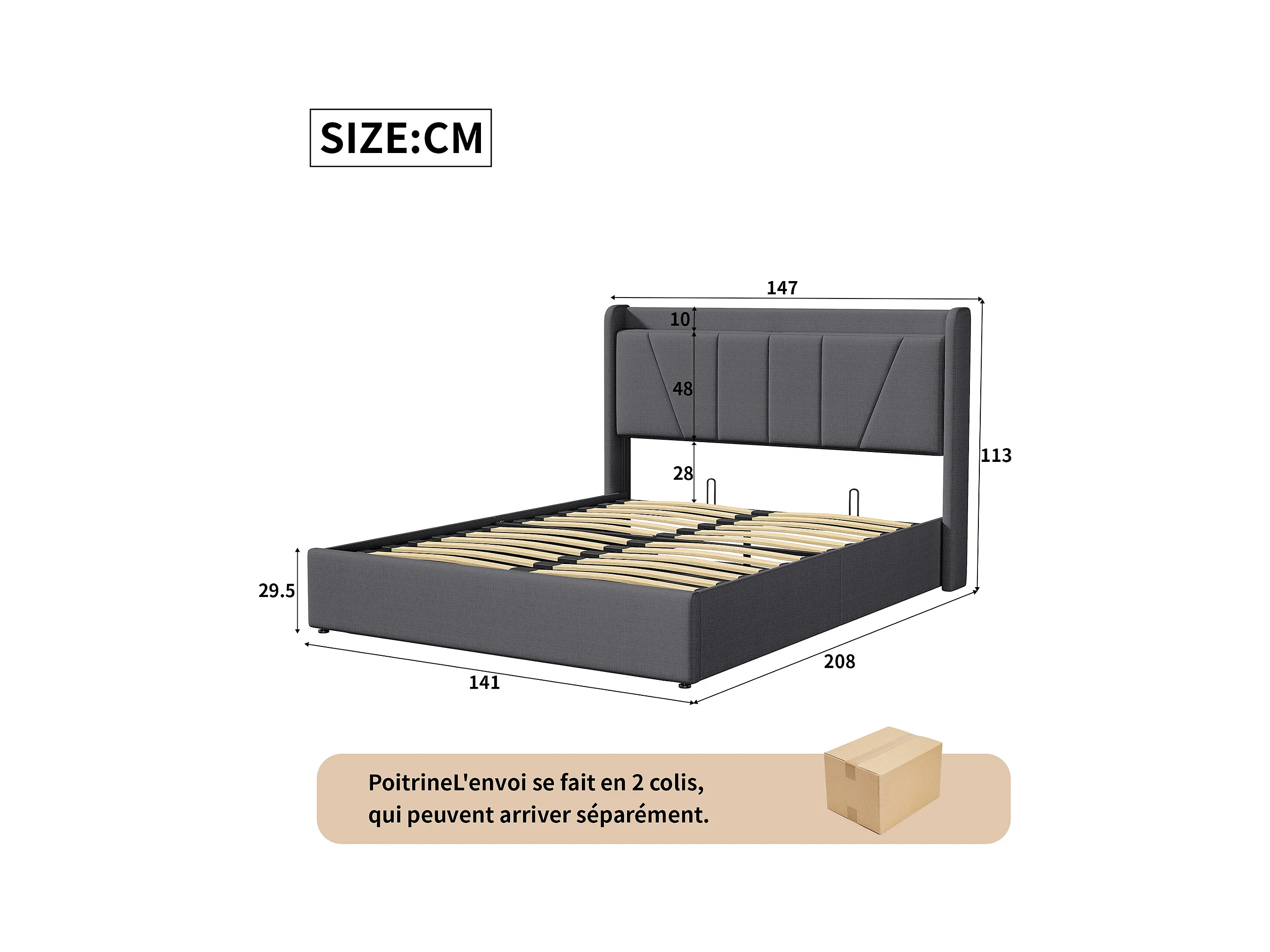 Lit 140x200 cm - NEXU - USB - cadre de lit coffre  Rangement Hydraulique - lit adutle 140x200 cm avec sommier à lattes - lit 140x200 cm tissu en lin - gris