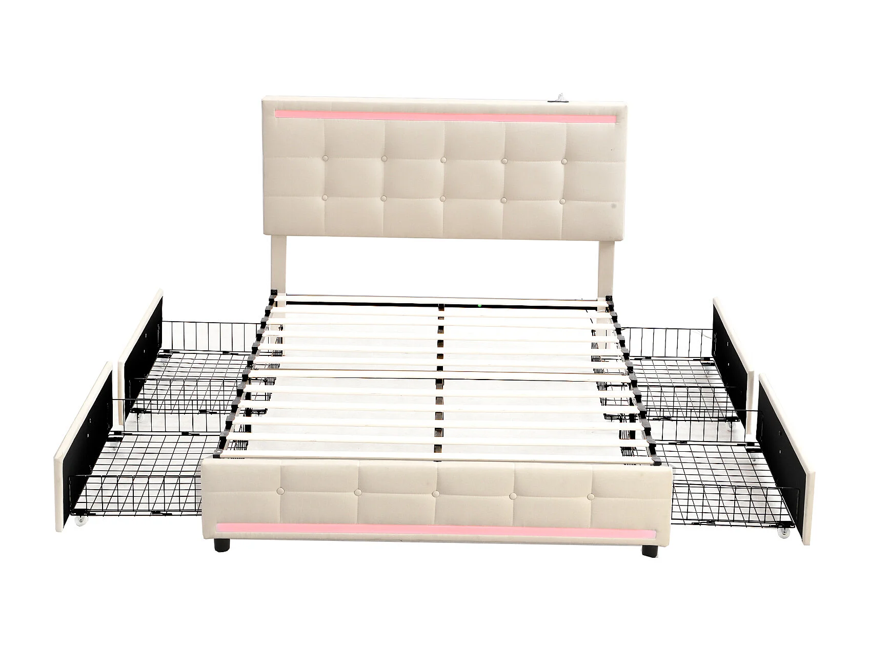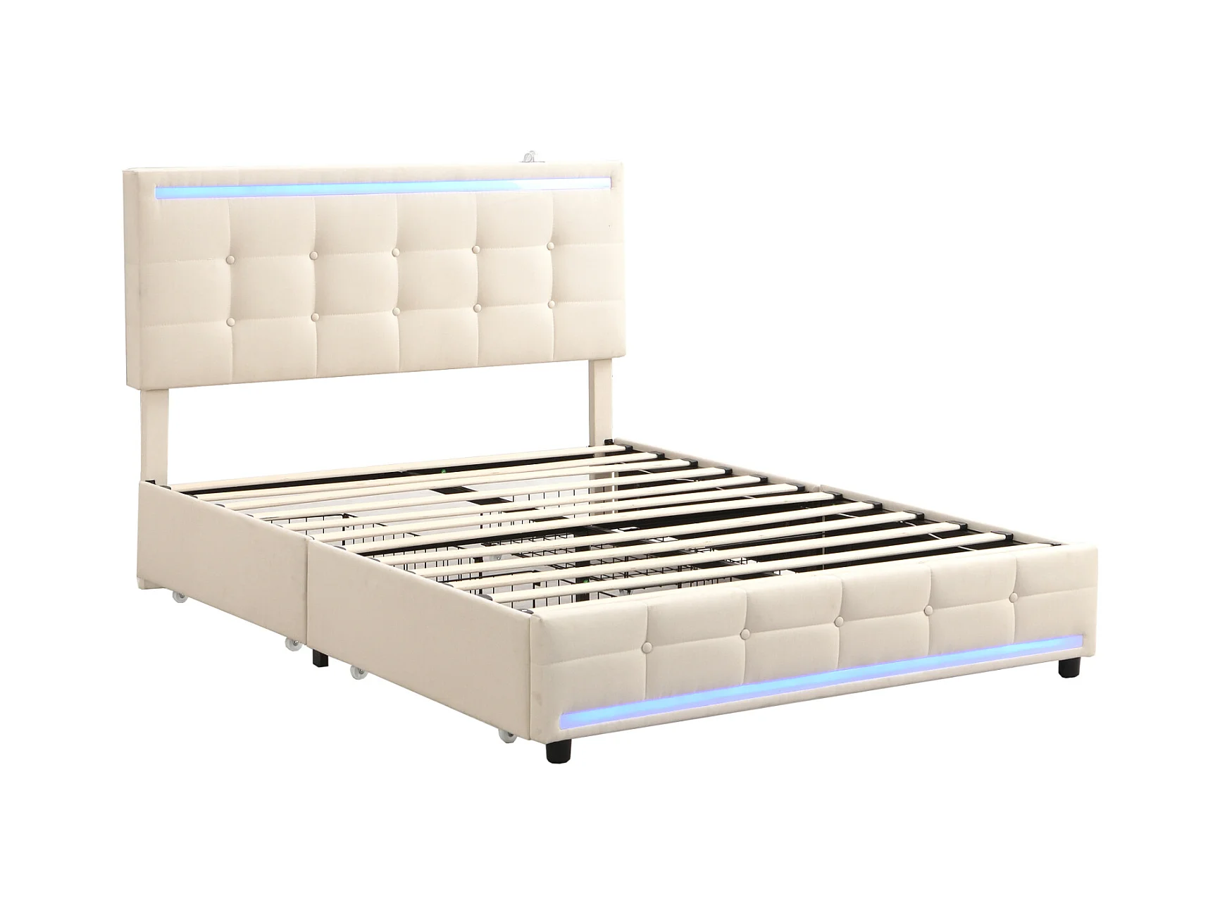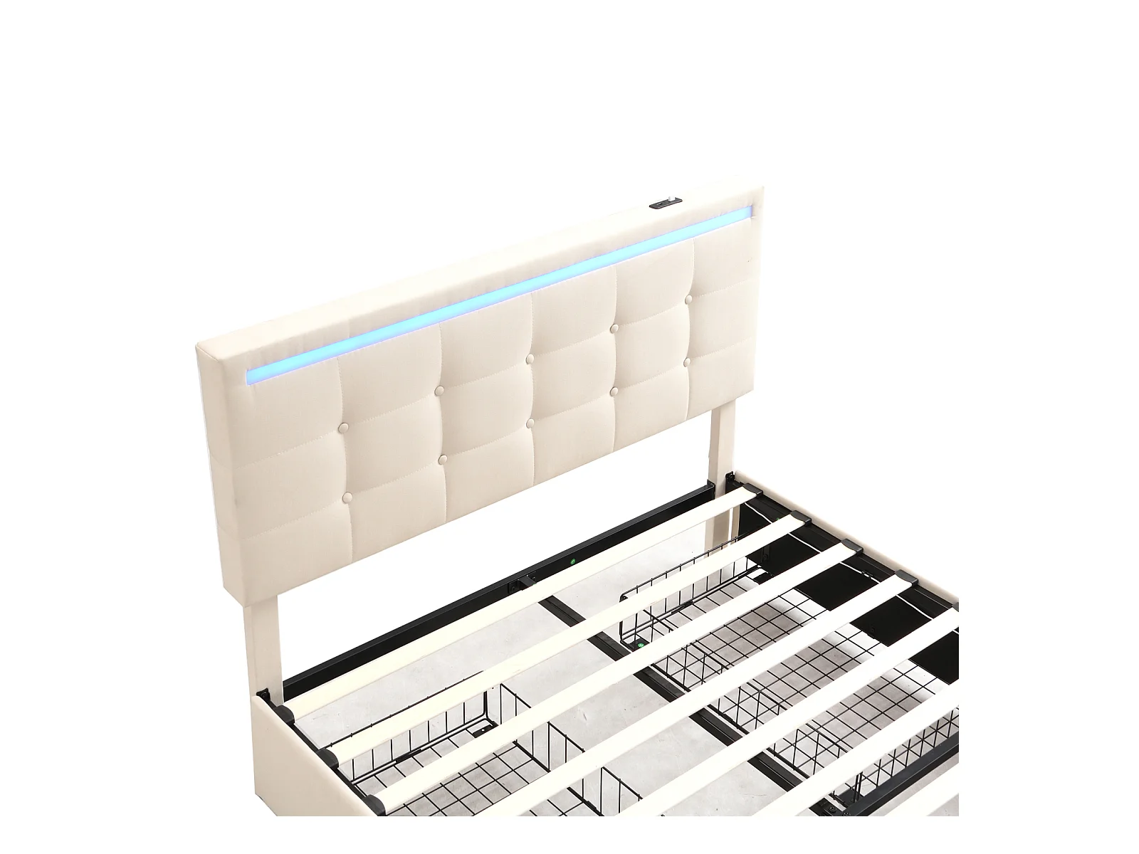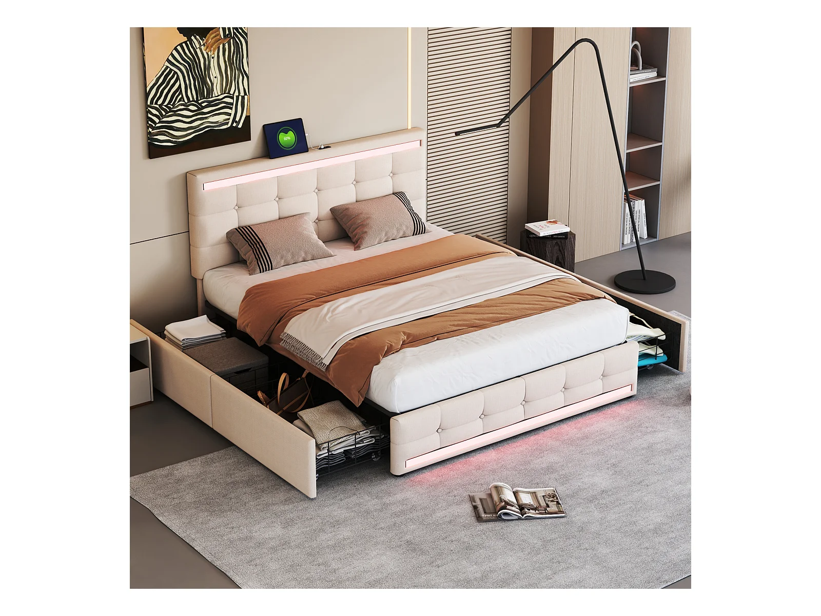 Lit 140x200cm avec tiroirs, Lit double capitonné avec rangement, éclairage LED, beige