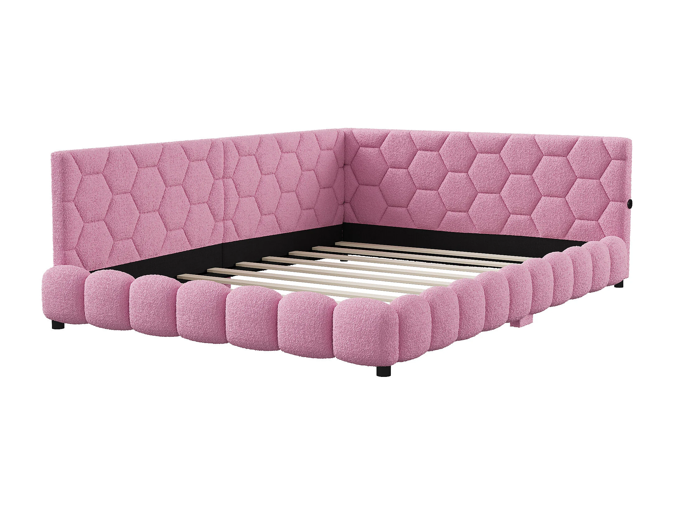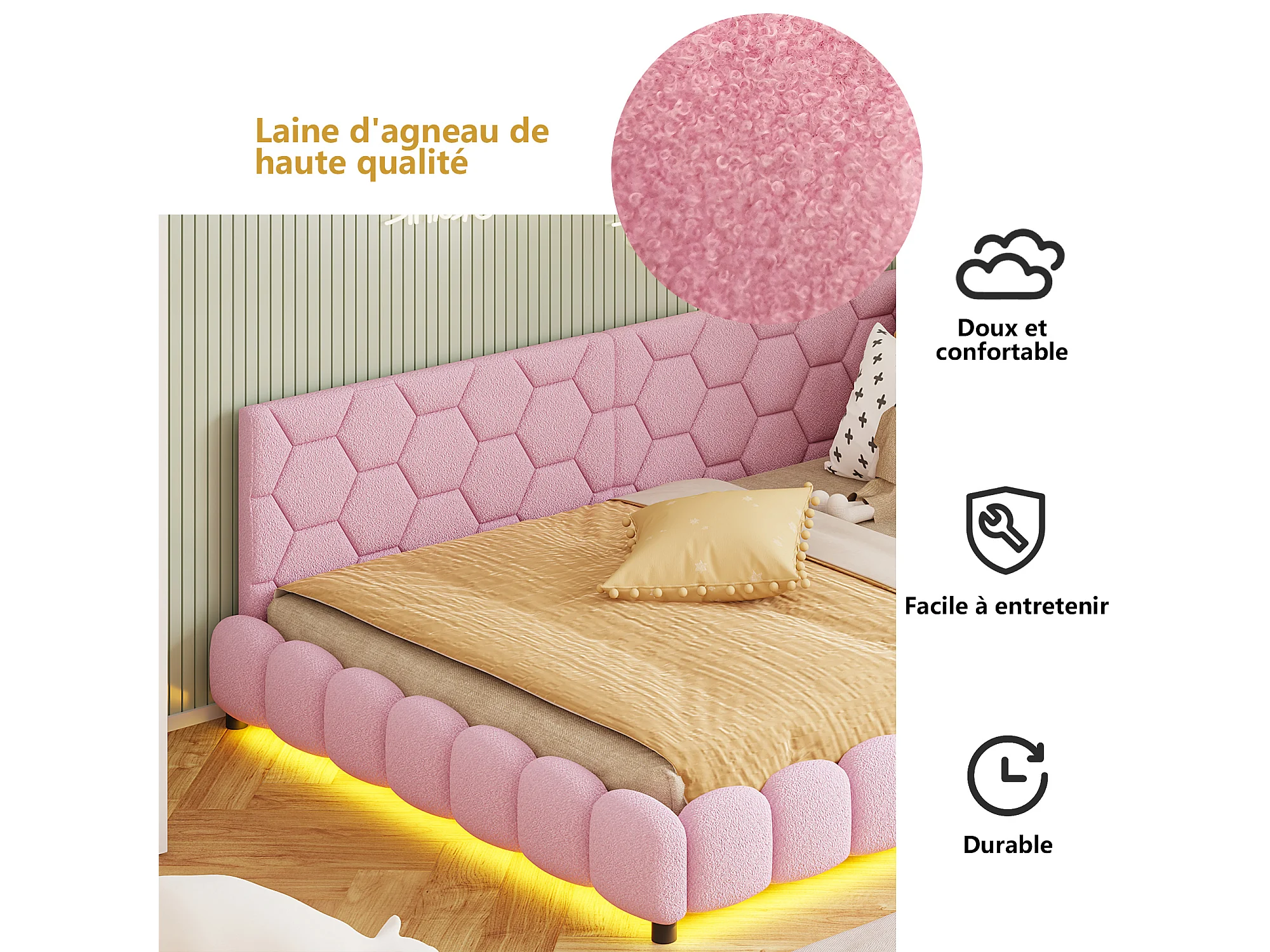 Lit 140x200cm, Lit Double Avec LED, Port USB, Matériau Tissu En Peluche, Canapé-lit, Rose