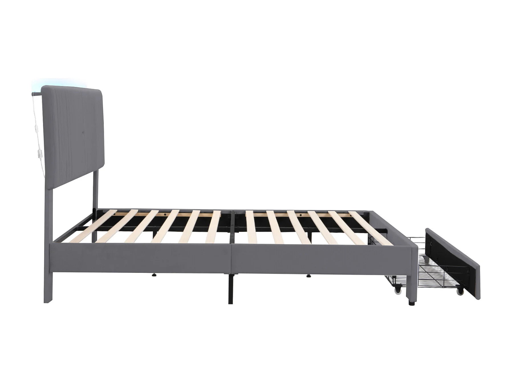 Lit 160 x 200 cm avec Éclairage, USB, Tête de Lit et Grand Tiroir, en Velours Gris