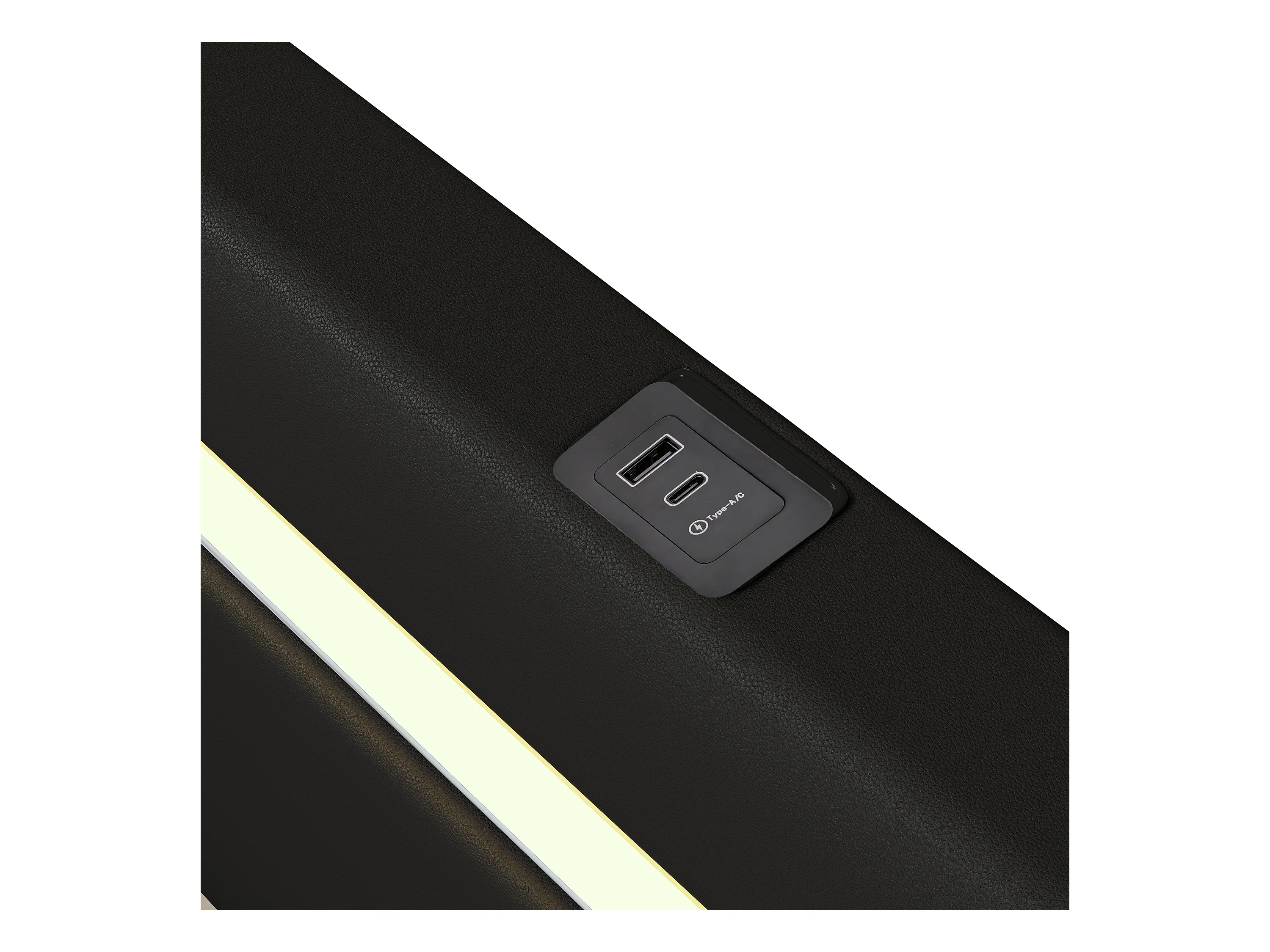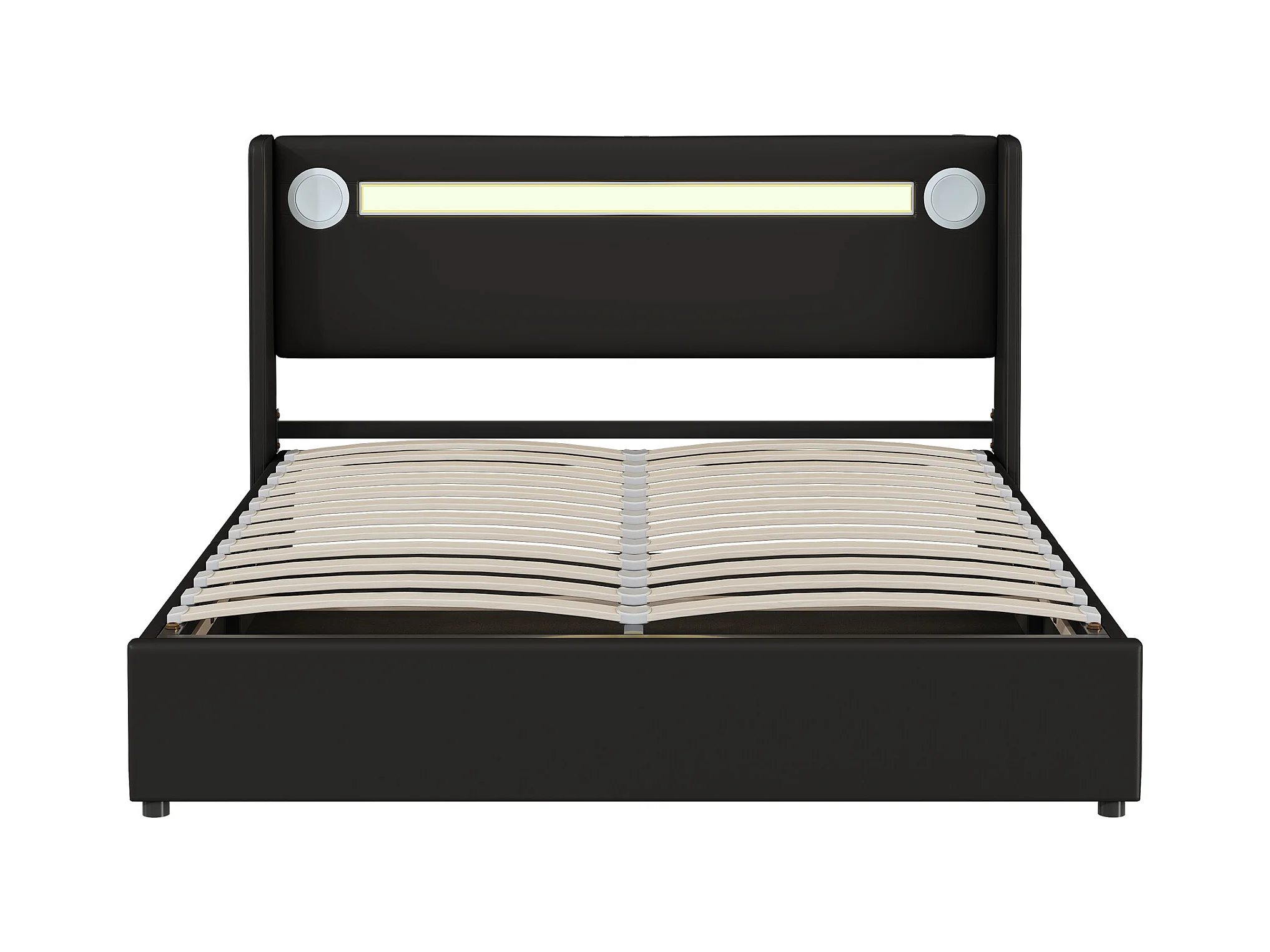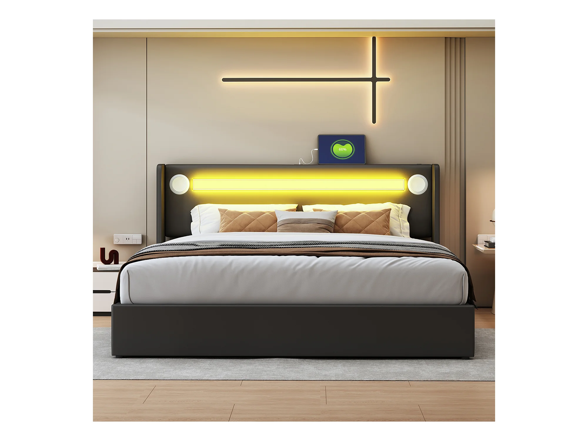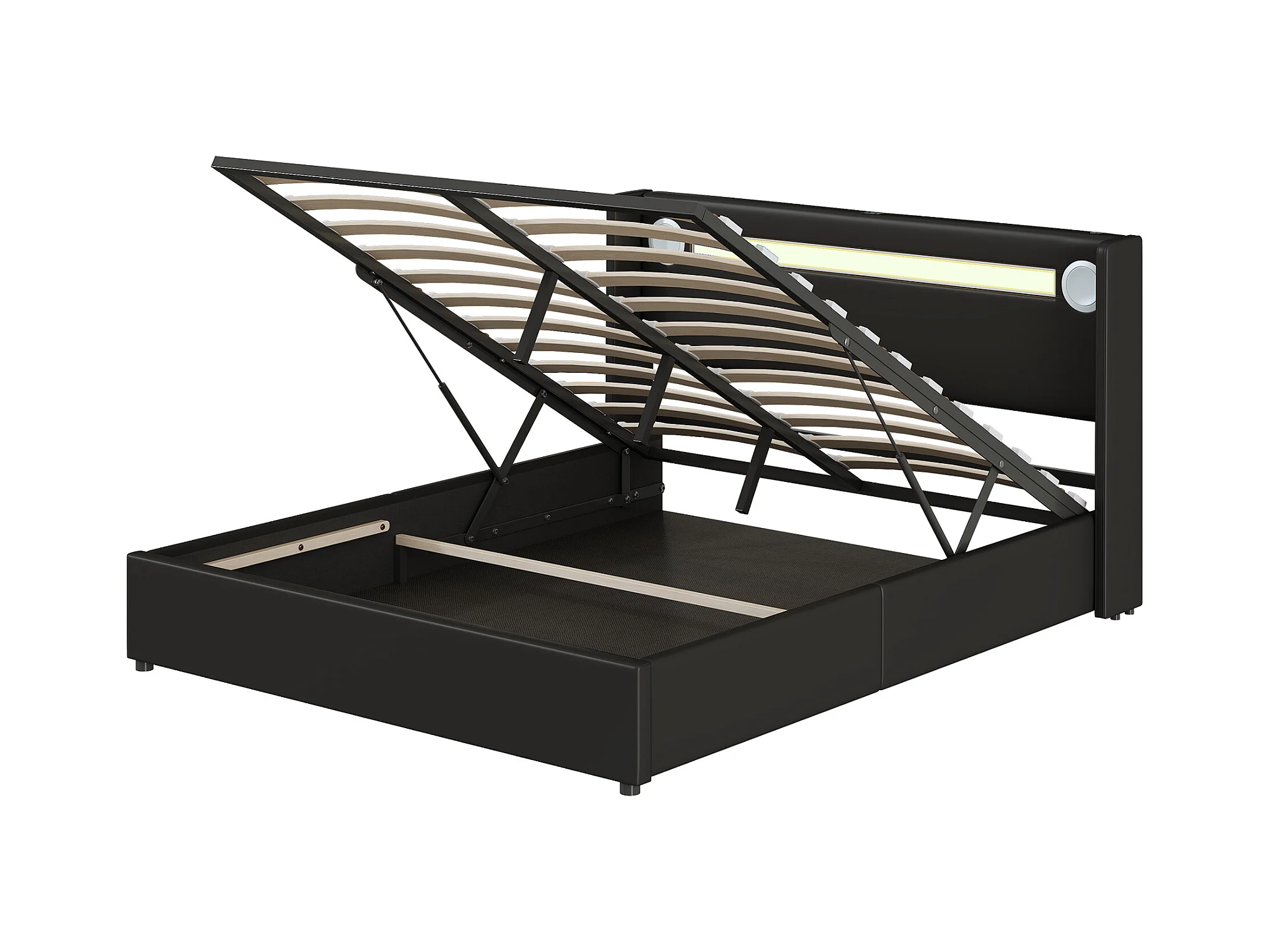 Lit 160 x 200 cm avec LED, Bluetooth et USB, en Cuir PU avec Rangement et Sommier, Noir
