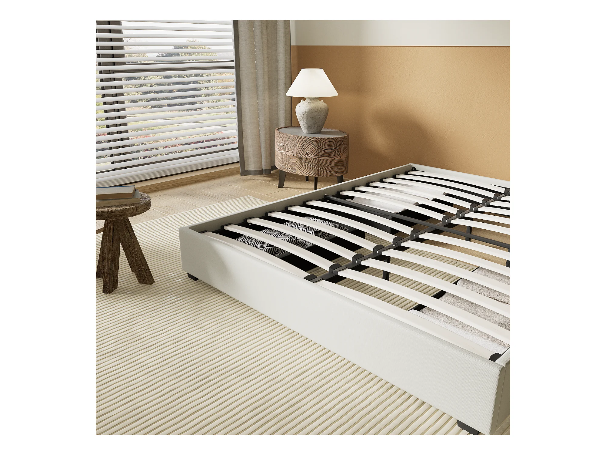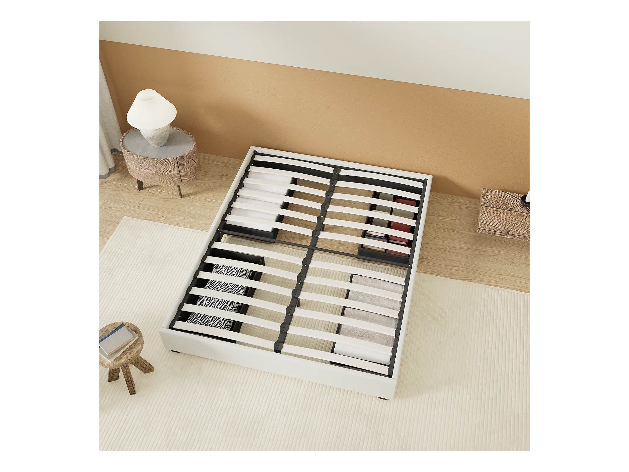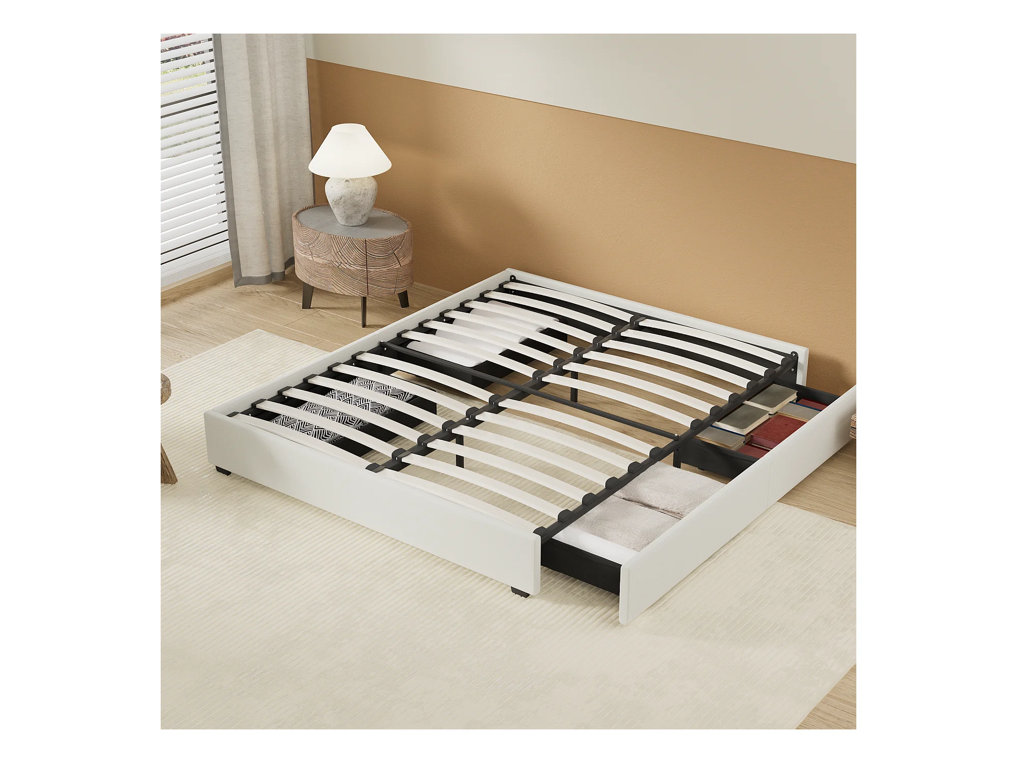 Lit 160 x 200 cm avec tiroirs, sommier à lattes en bois, cadre en tissu blanc