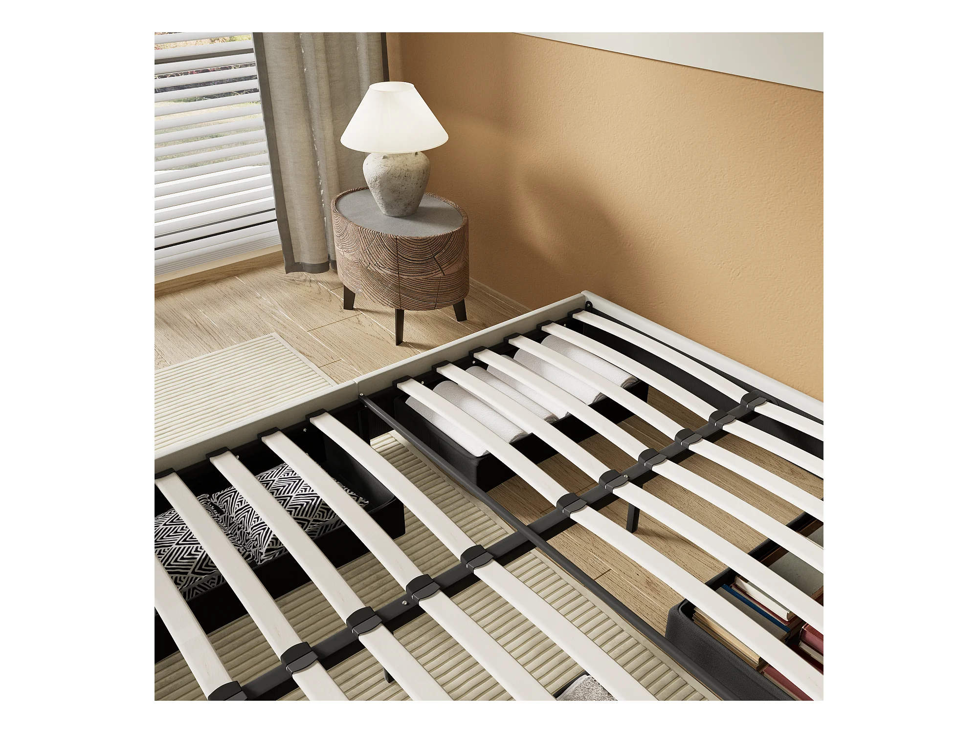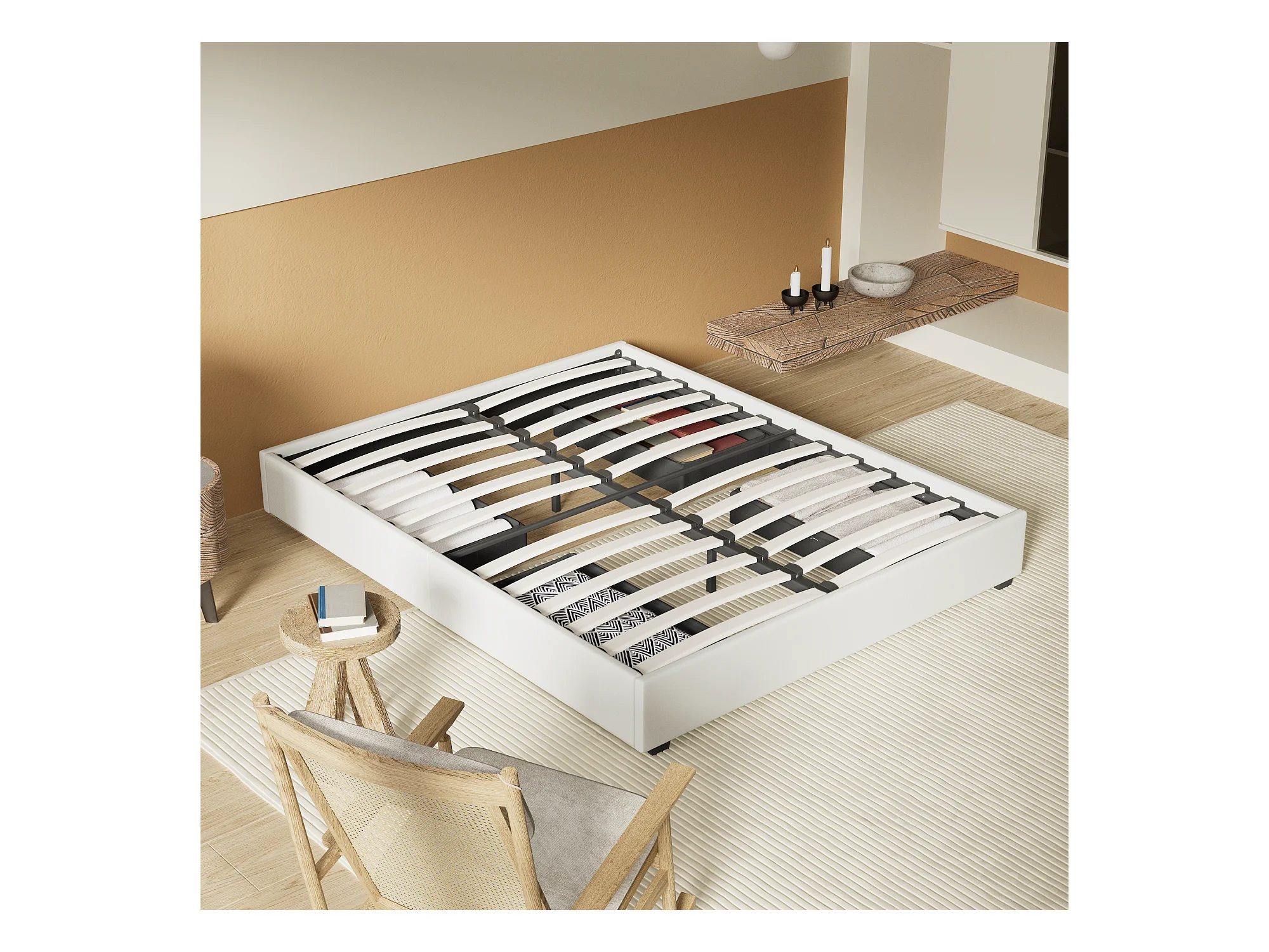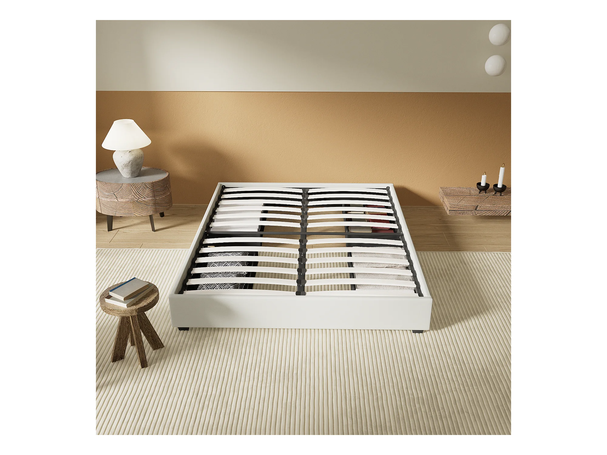 Lit 160 x 200 cm avec tiroirs, sommier à lattes en bois, cadre en tissu blanc