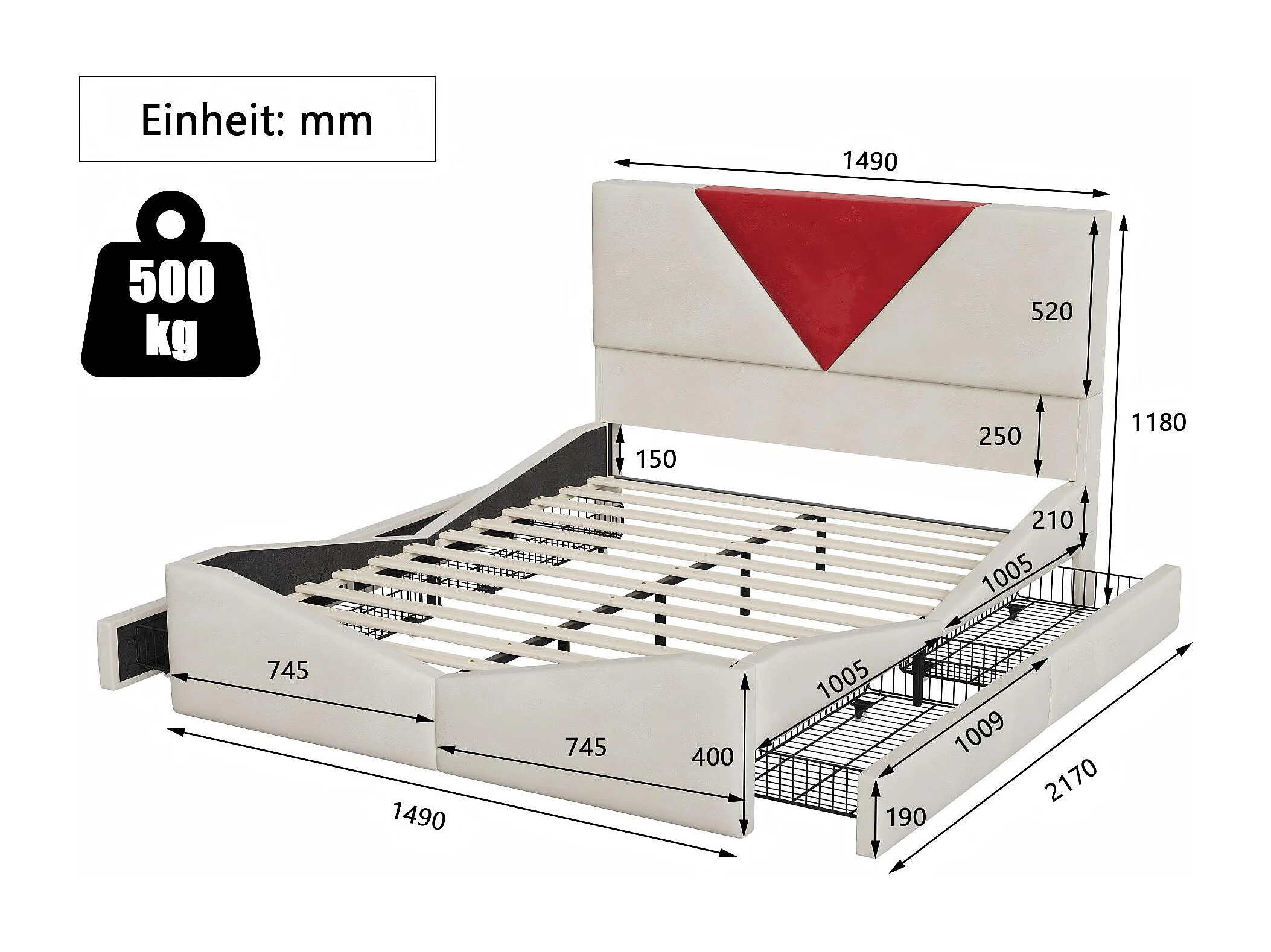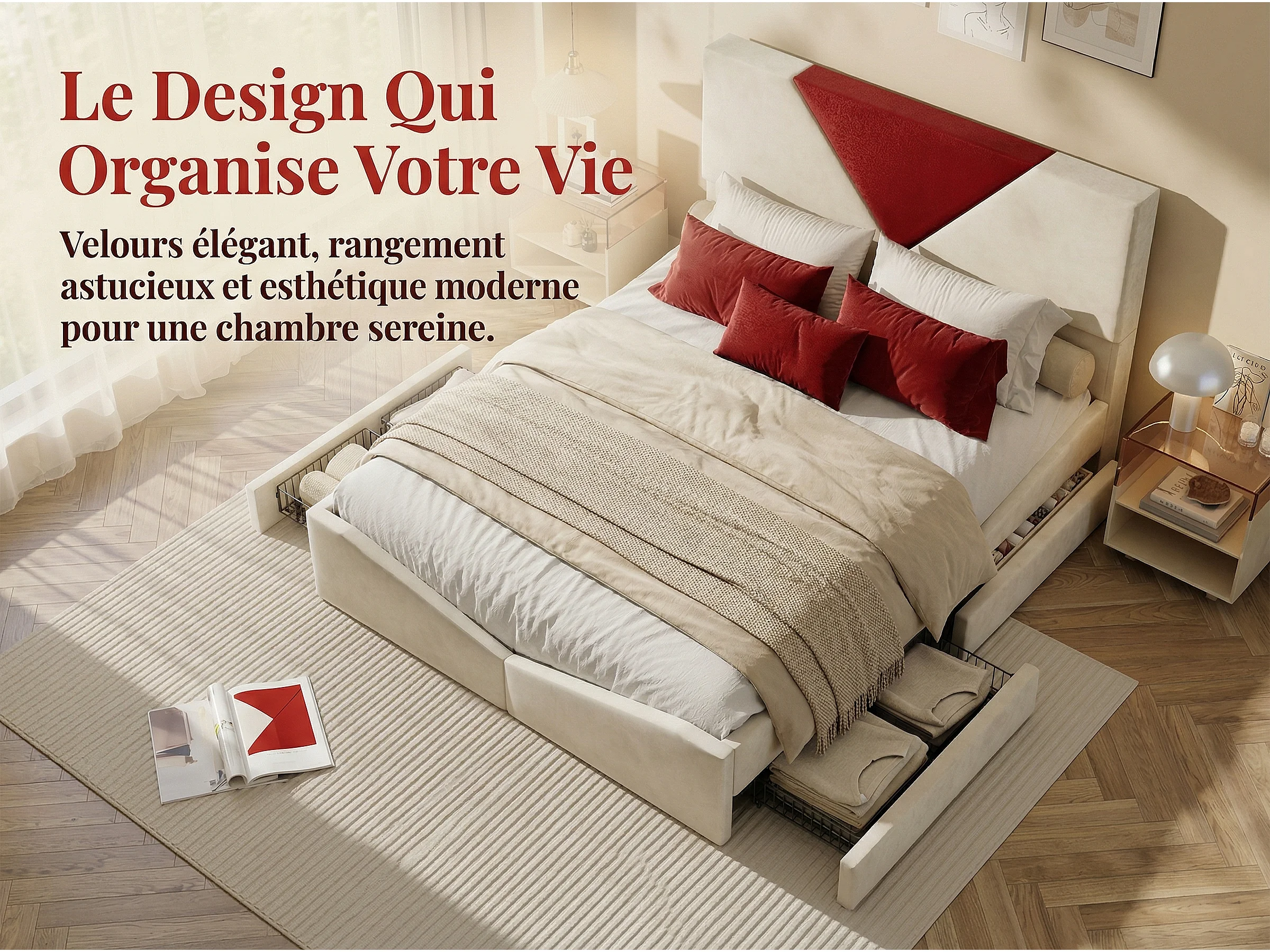 Lit 160x200 avec rangement, lit coffre tissu, tête de lit rembourrée bicolore, cadre avec sommier à lattes