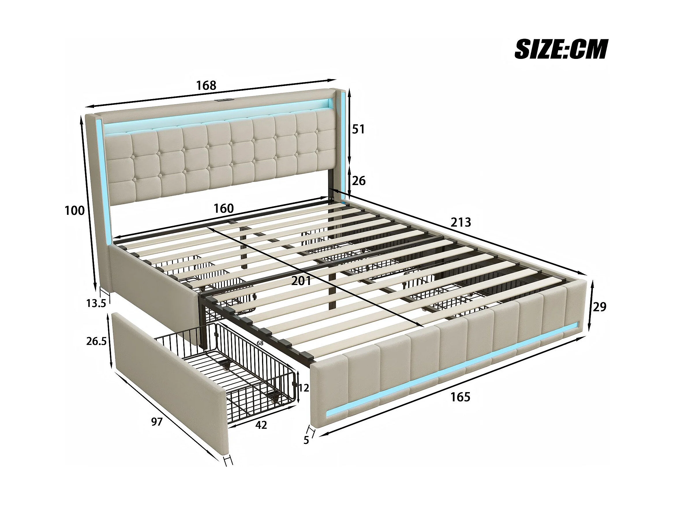 Lit 160x200 avec tiroirs, LED, USB Type-C, lit rangement avec roulettes, cadre de lit en tissu lin