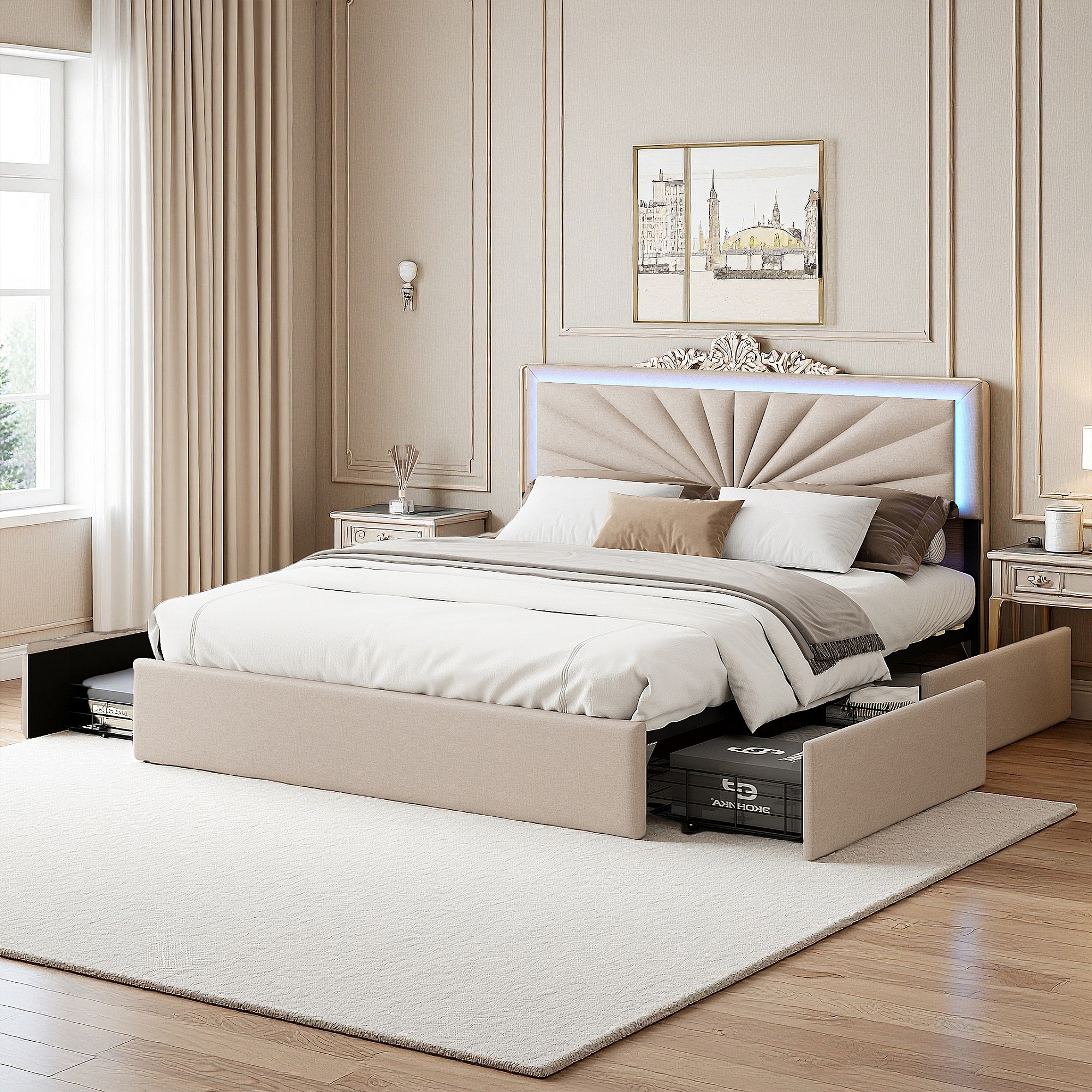 Lit 160x200 cm avec LED et 4 tiroirs - lit adulte 160x200 cm avec sommier à lattes - tissu en lin - beige
