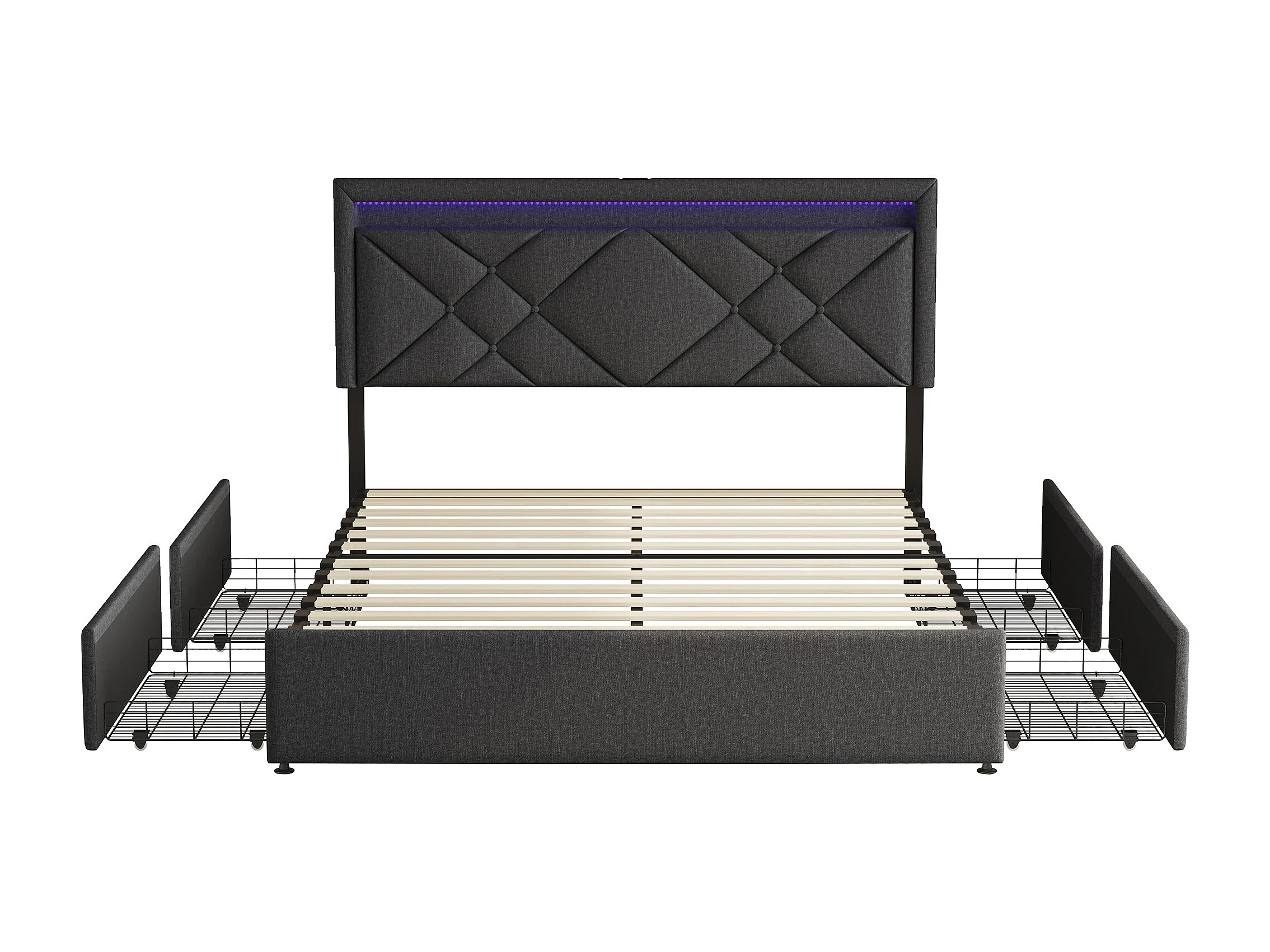 Lit 160x200 cm avec LED - lit adulte 160x200 cm avec tiroirs rembourré - cadre de lit double 160x200 cm avec sommier à lattes - tissu en lin - gris