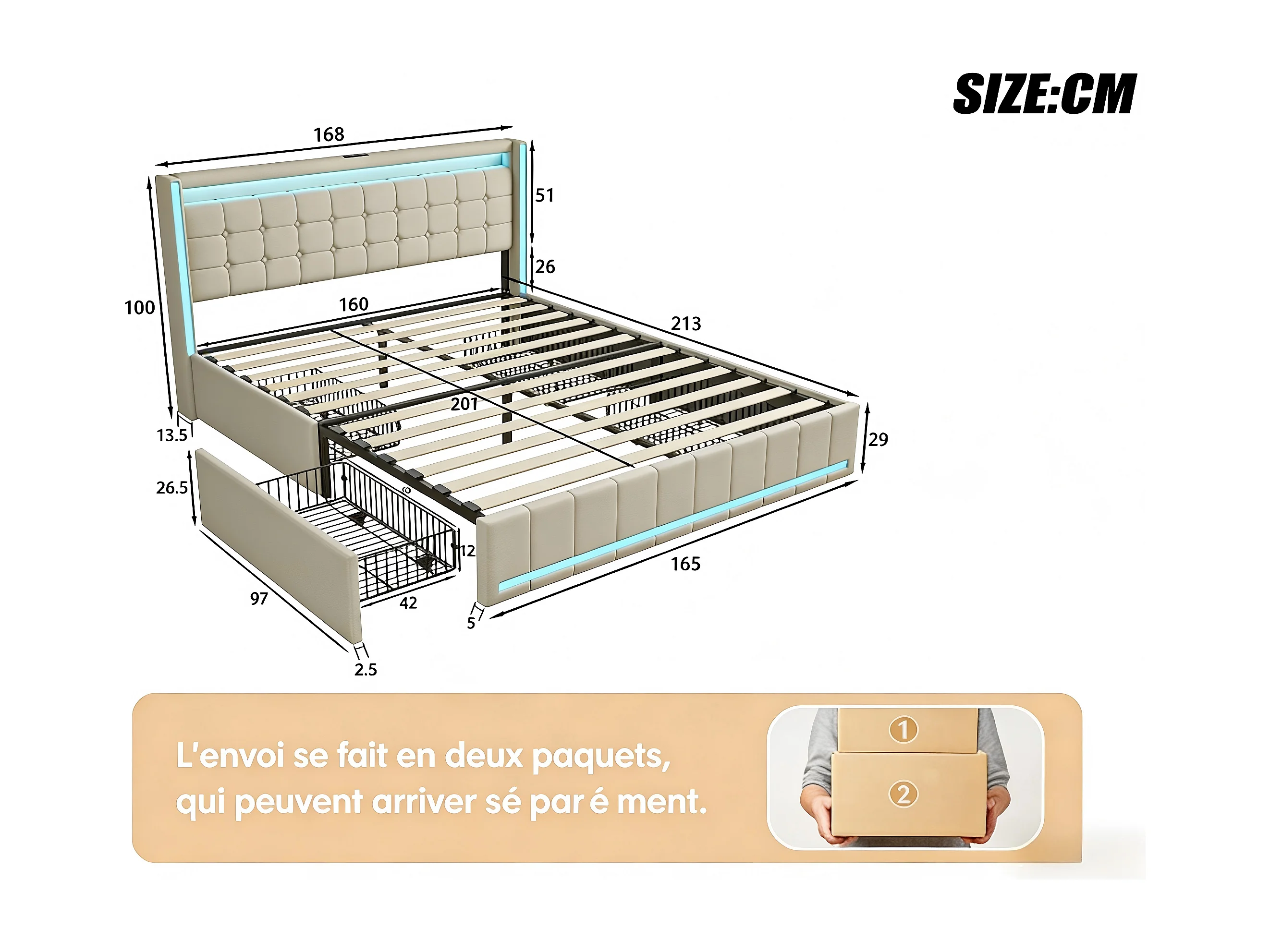 Lit coffre 160x200 cm en tissu lin avec LED, USB et Type-C - tête de lit avec étagères - sommier à lattes - beige
