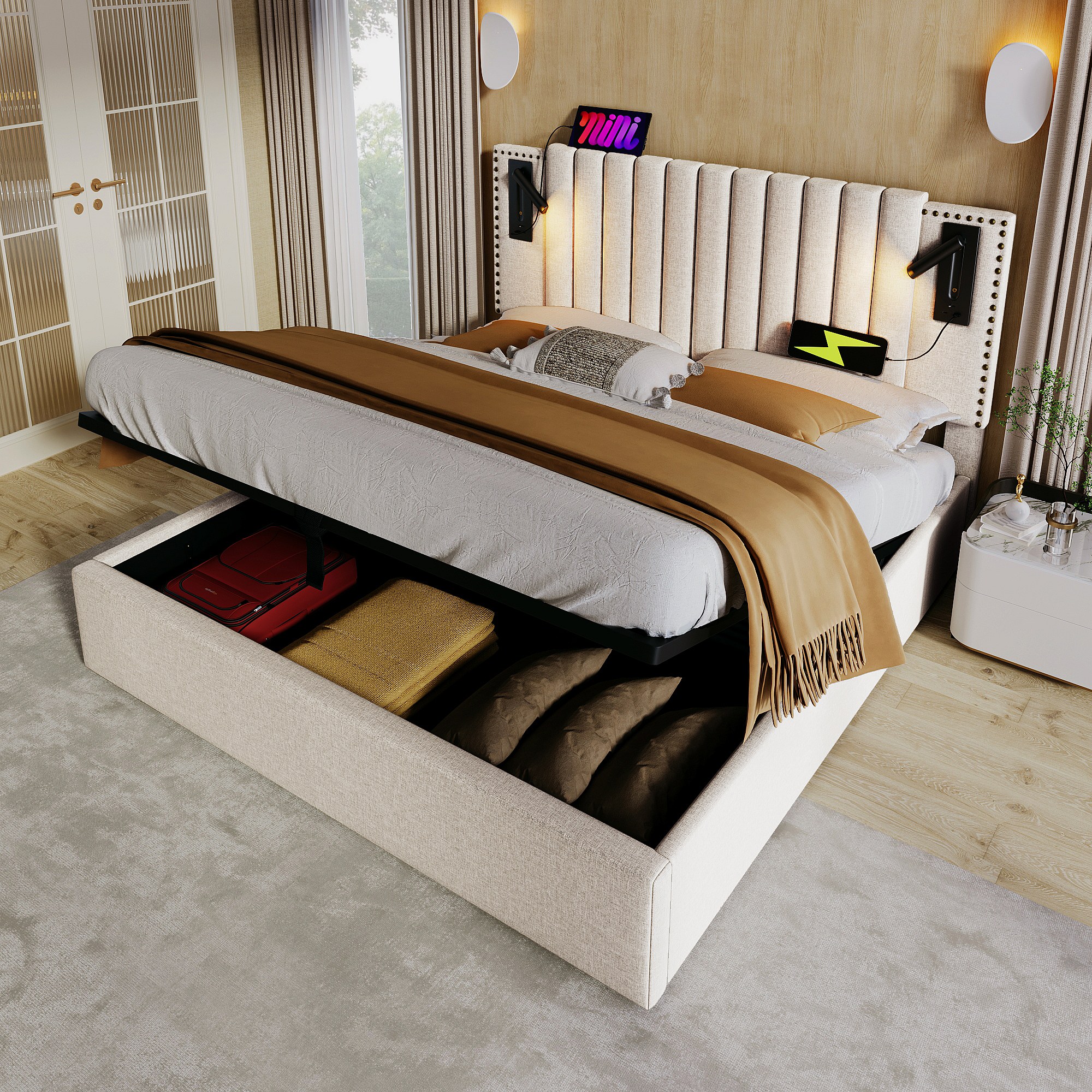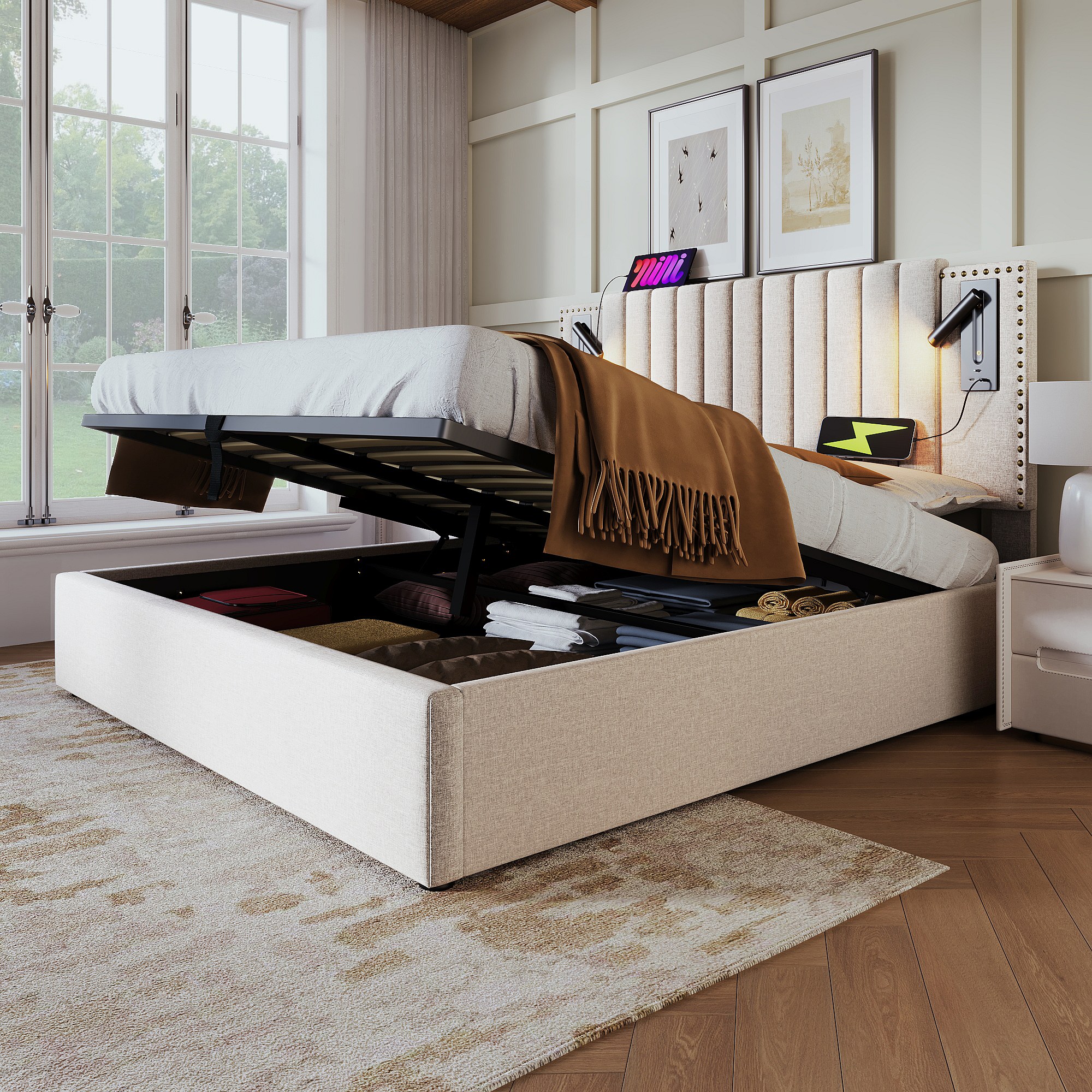 Lit 160x200 cm, lit double avec espace de rangement, éclairage de lecture avec USB, tête de lit réglable