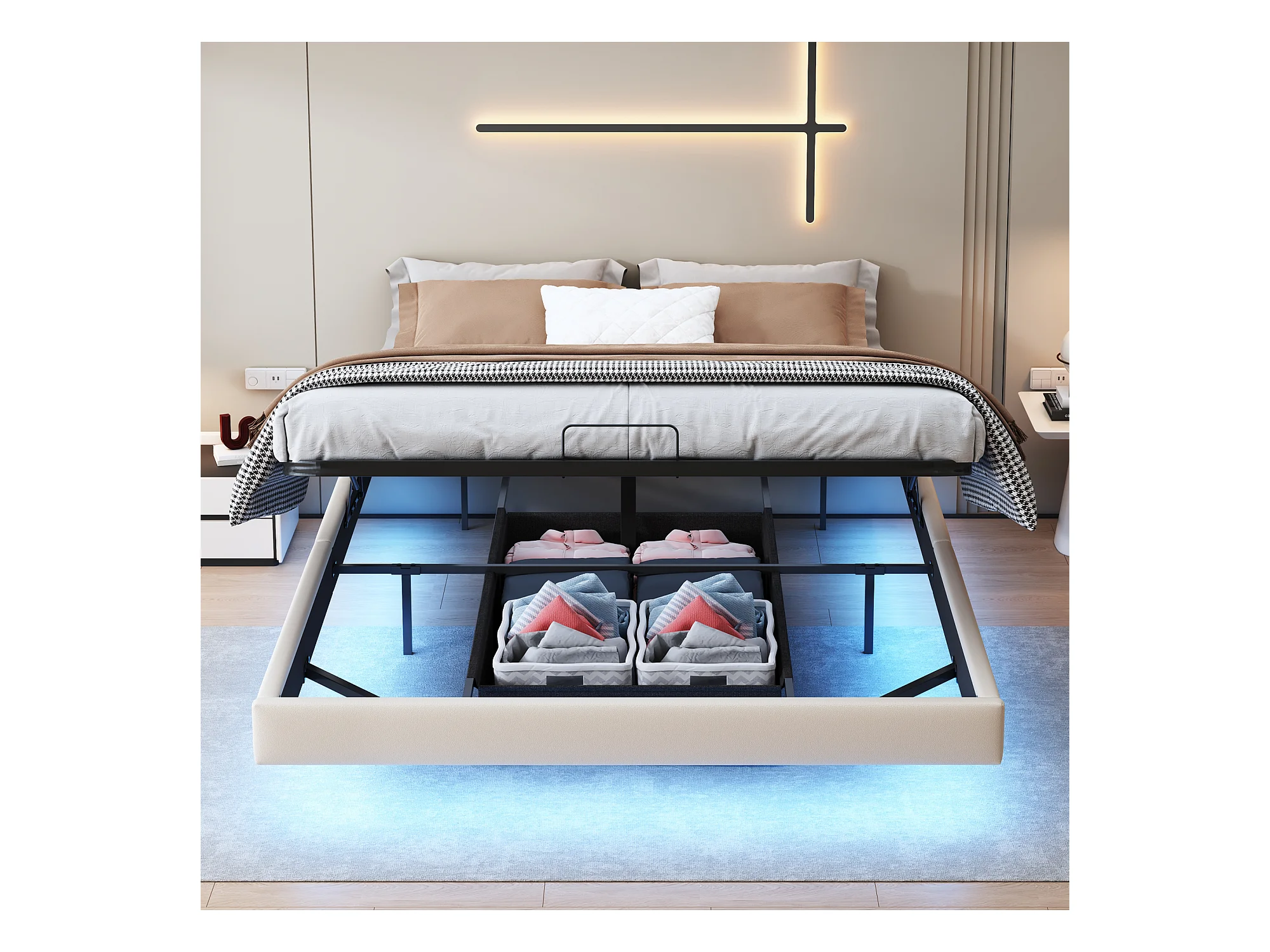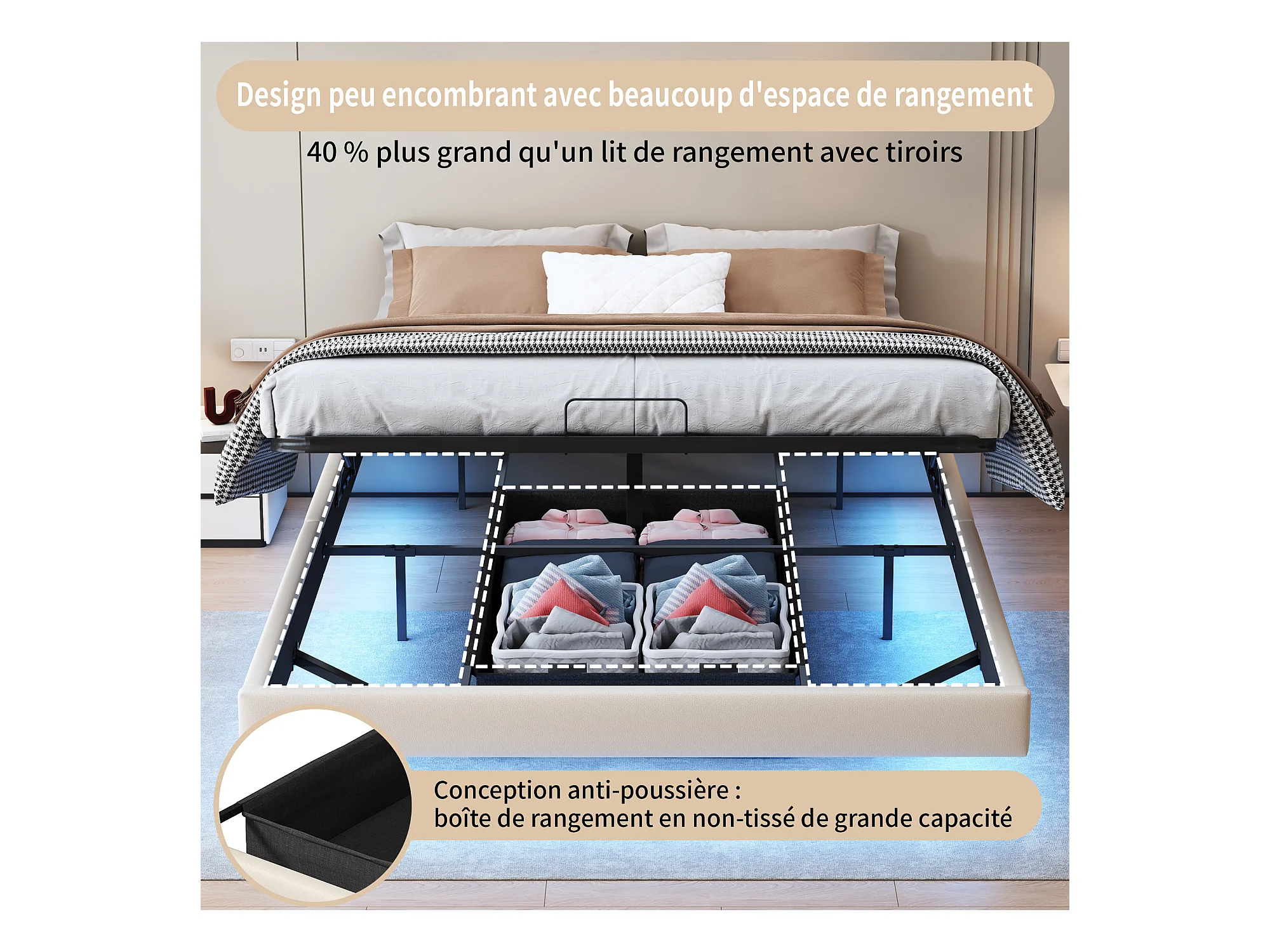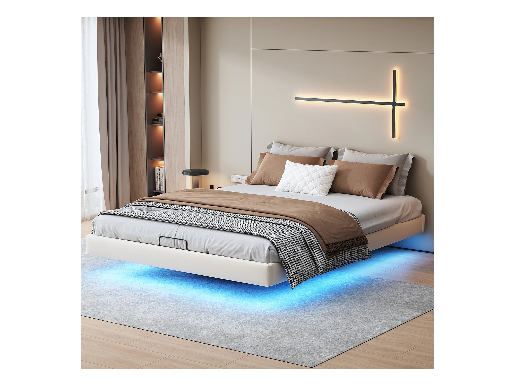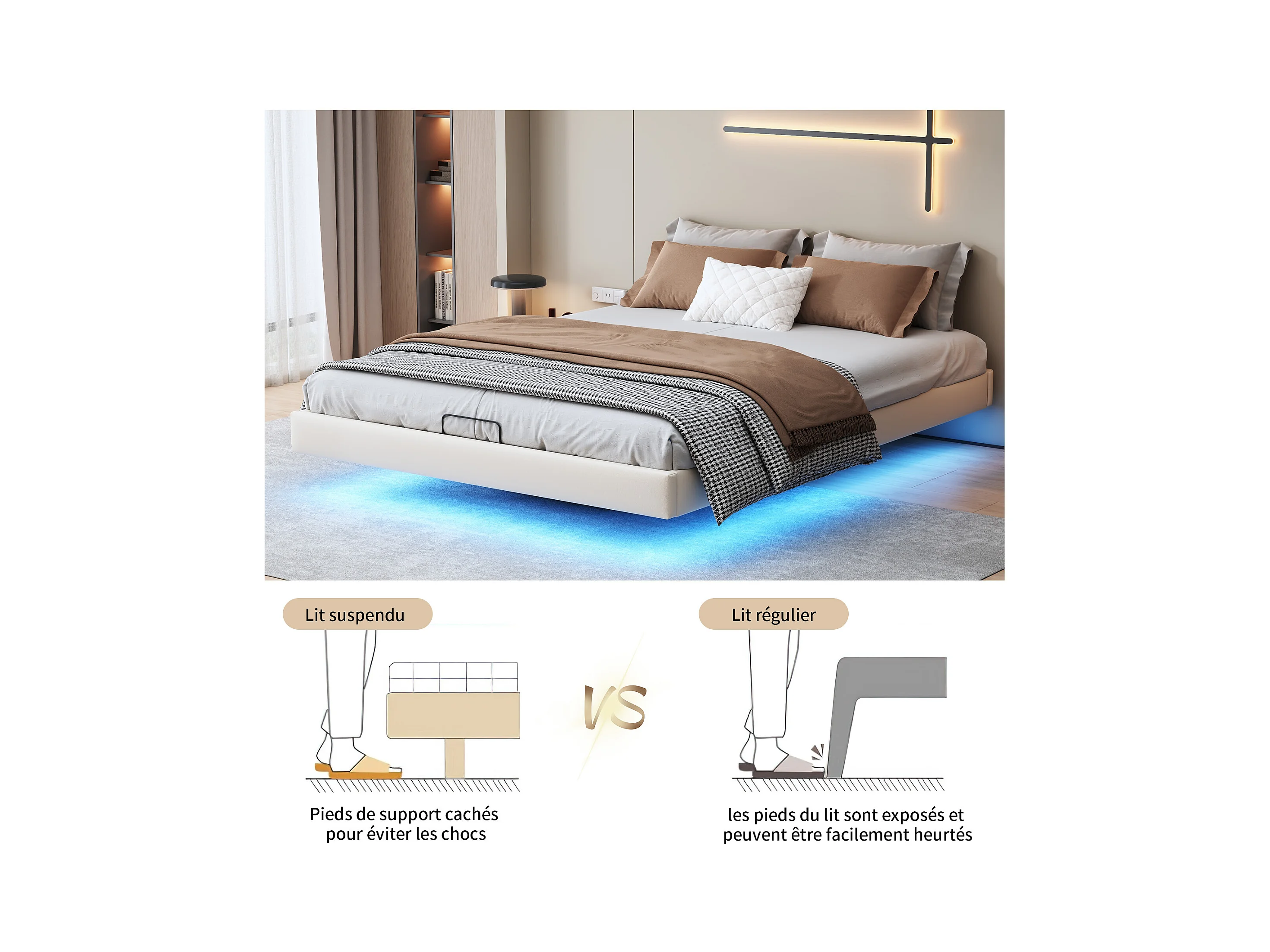 Lit 160x200 cm, Lit Flottant avec LED et Espace de Rangement, Cadre de Lit sans Tête de Lit,Beige