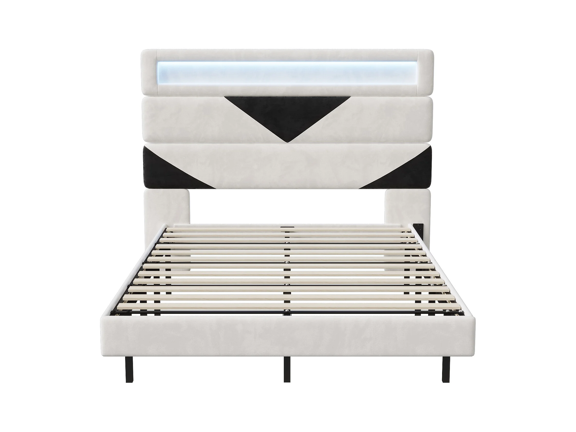 Lit 160x200 cm, MDF, avec USB et éclairage LED, Cadre de lit, lit flottant avec Tête de lit triangle, - Blanc