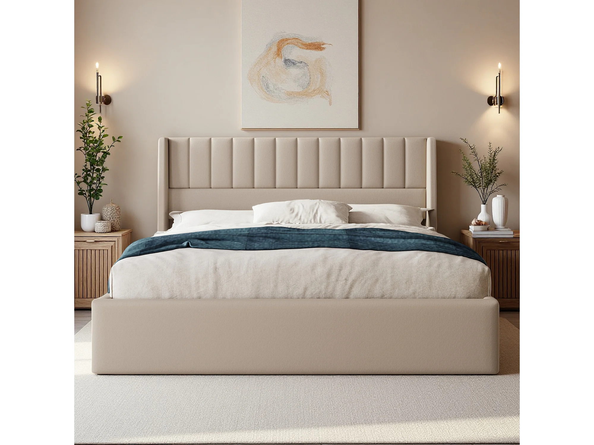 Lit coffre adulte 160x200 cm - sommier à lattes - rembourré tête de lit - ​lit tissu en in 160x200 -beige