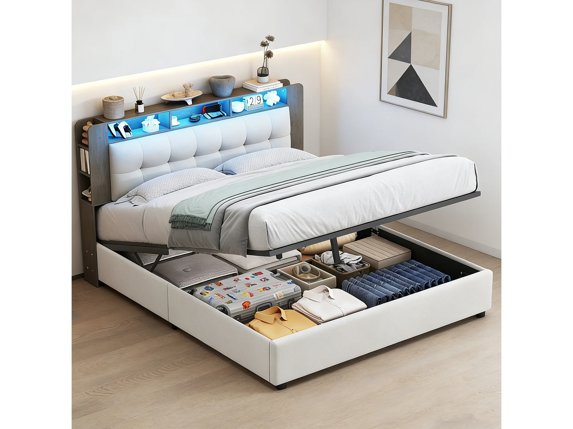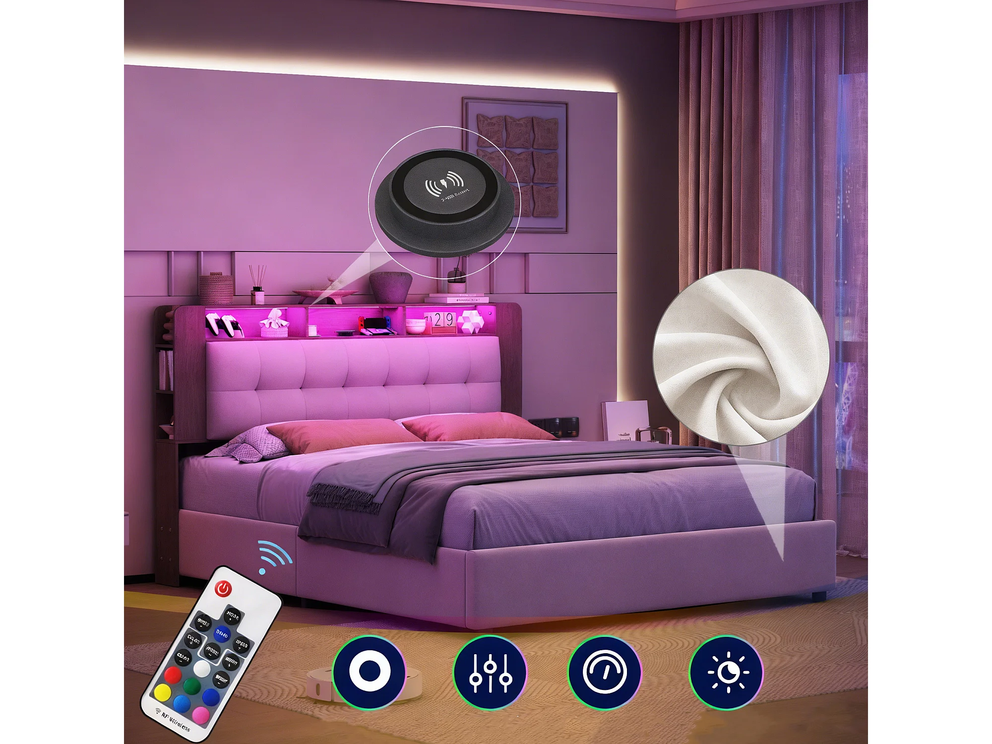 Lit coffre 160x200 cm avec sommier à latte - rembourré - Led et Chargement sans fil - tissu en velours - blanc cassé