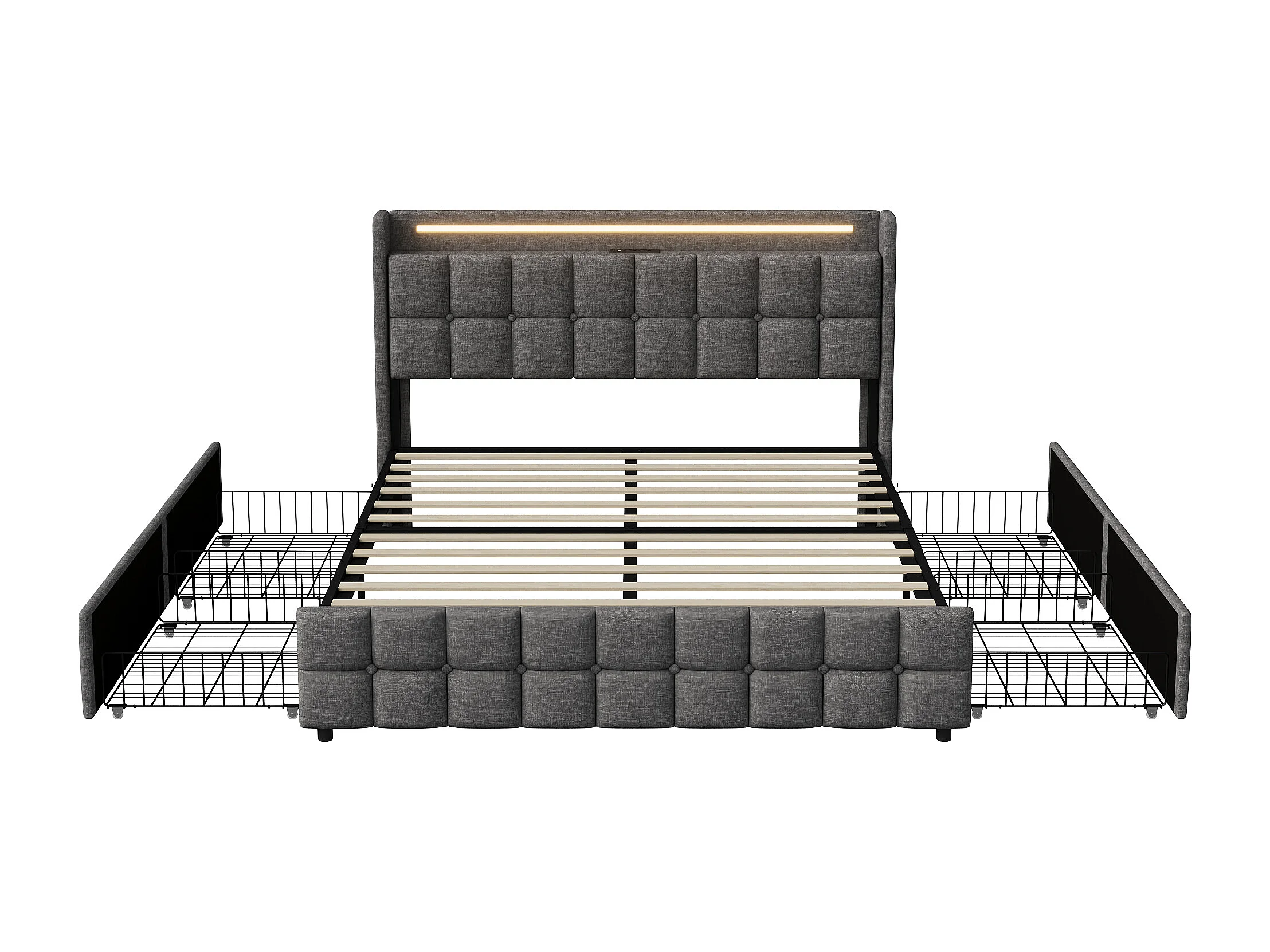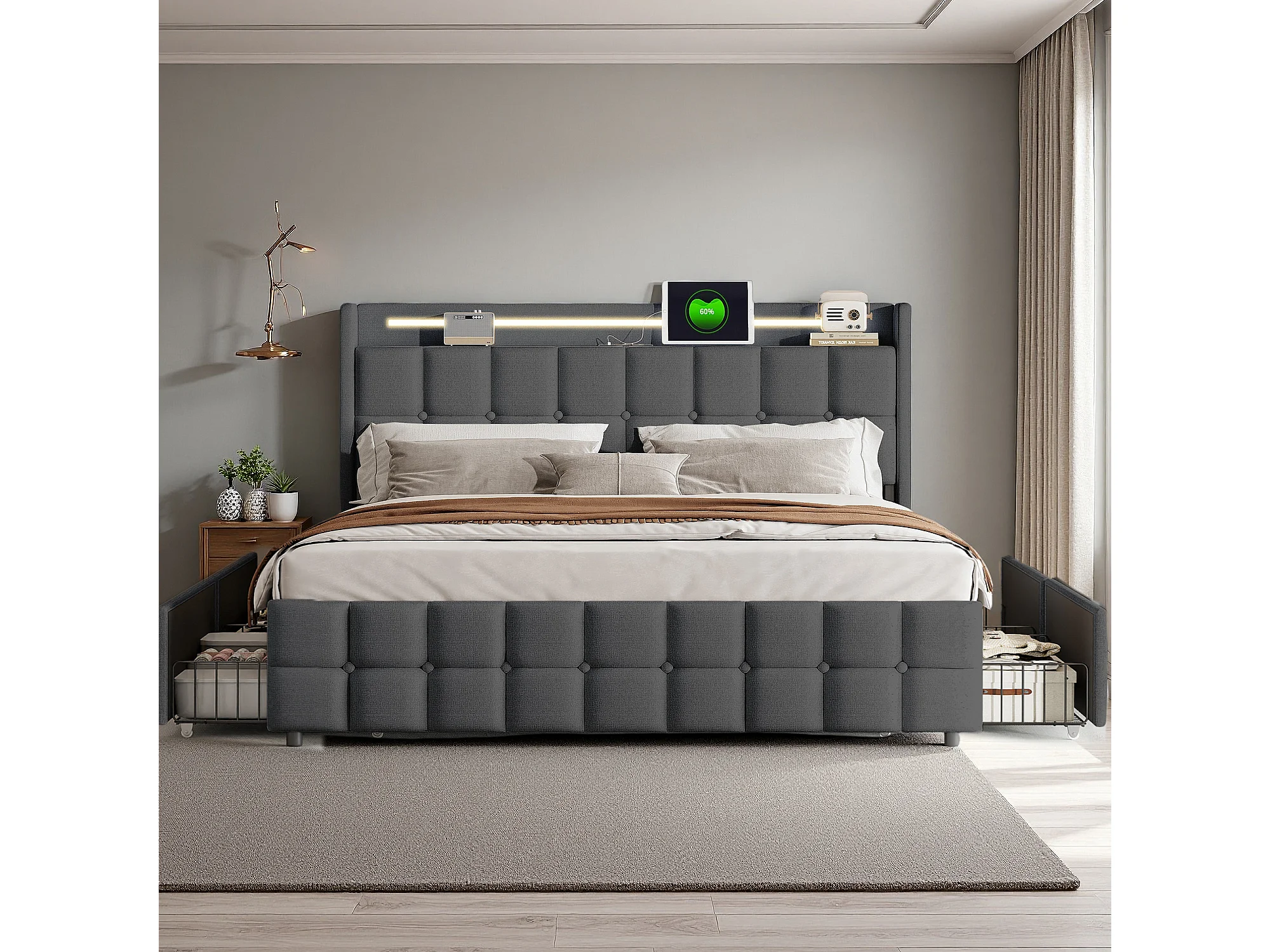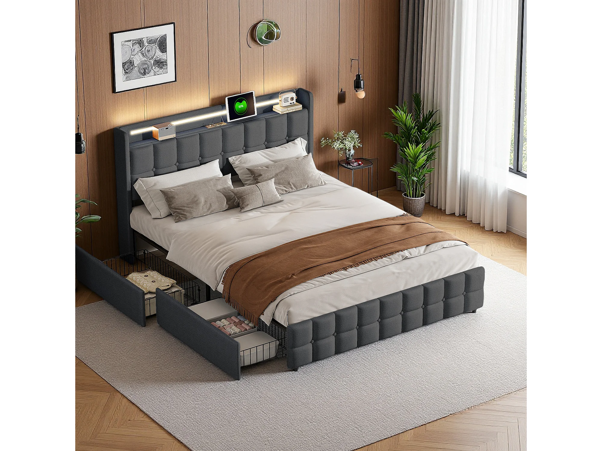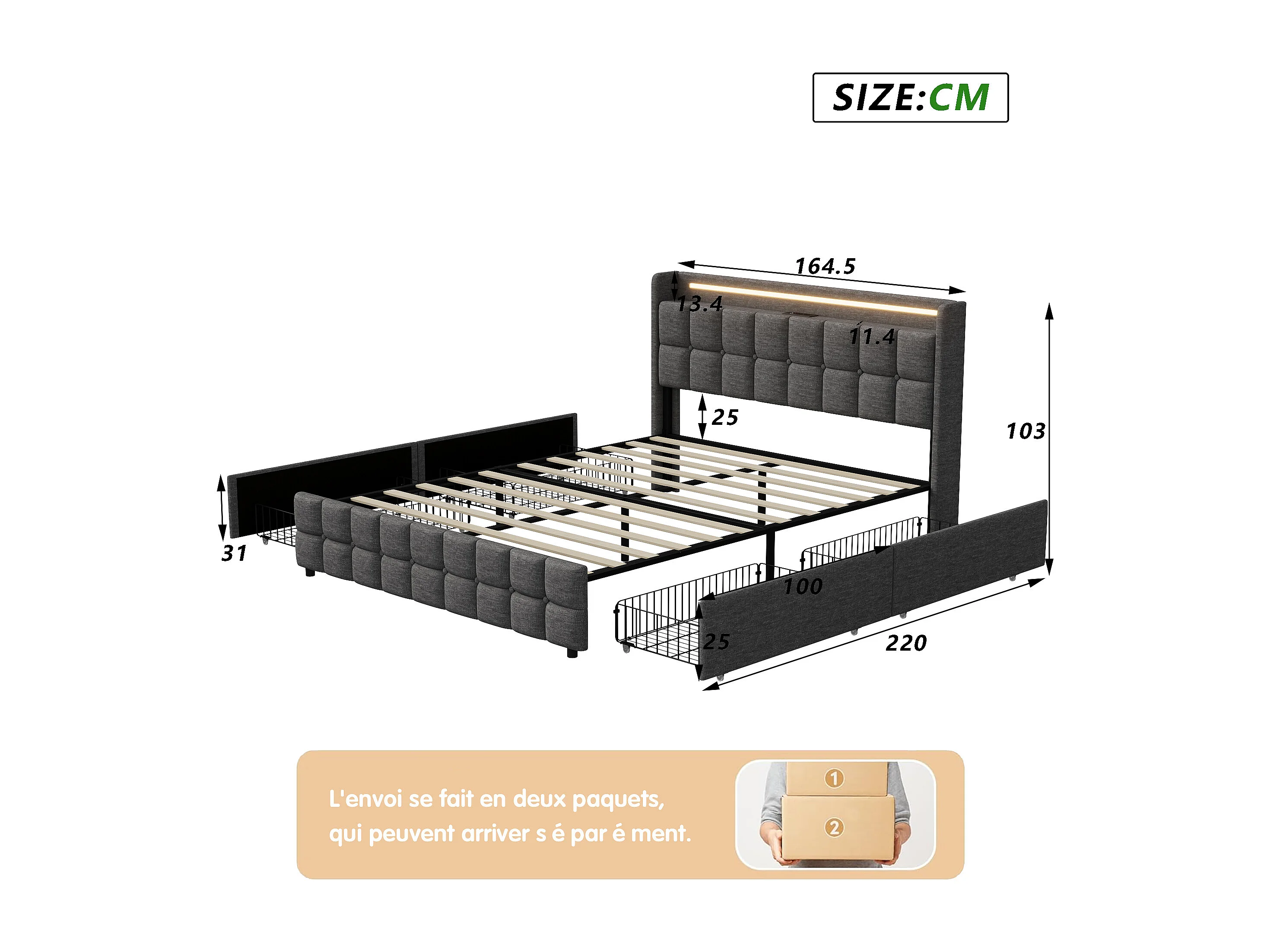 Lit 160x200 cm - NEXU - LED - USB - 4 tiroirs - tissu en lin - cadre de lit adulte 160x200 cm avec sommier à lattes - gris