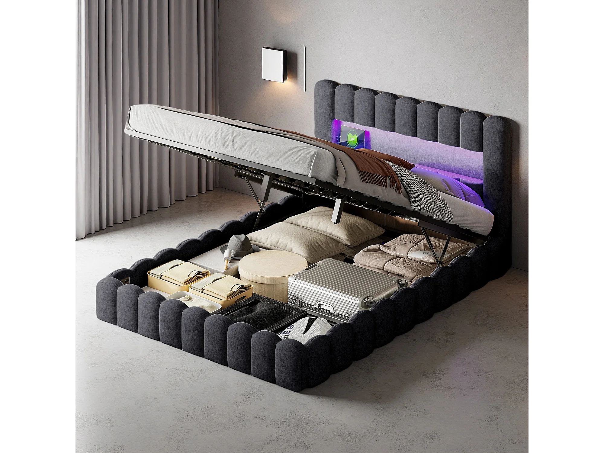 Lit coffre hydraulique 160x200 cm -rangement soldes - lit adulte avec sommier à lattes - LED et USB - lit à tête de lit rembourrée - tissu lin - gris