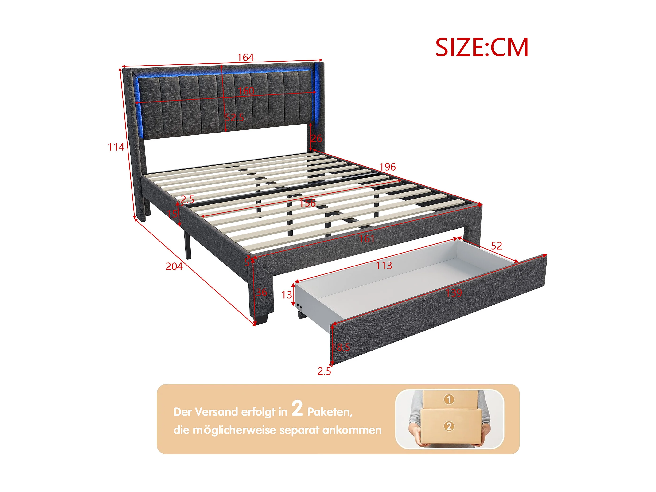 Lit 160x200 cm avec sommier à lattes - cadre de lit double- NEXU - lit tiroir 160x200 cm Avec Rangement - LED - USB - tissu en lin - gris