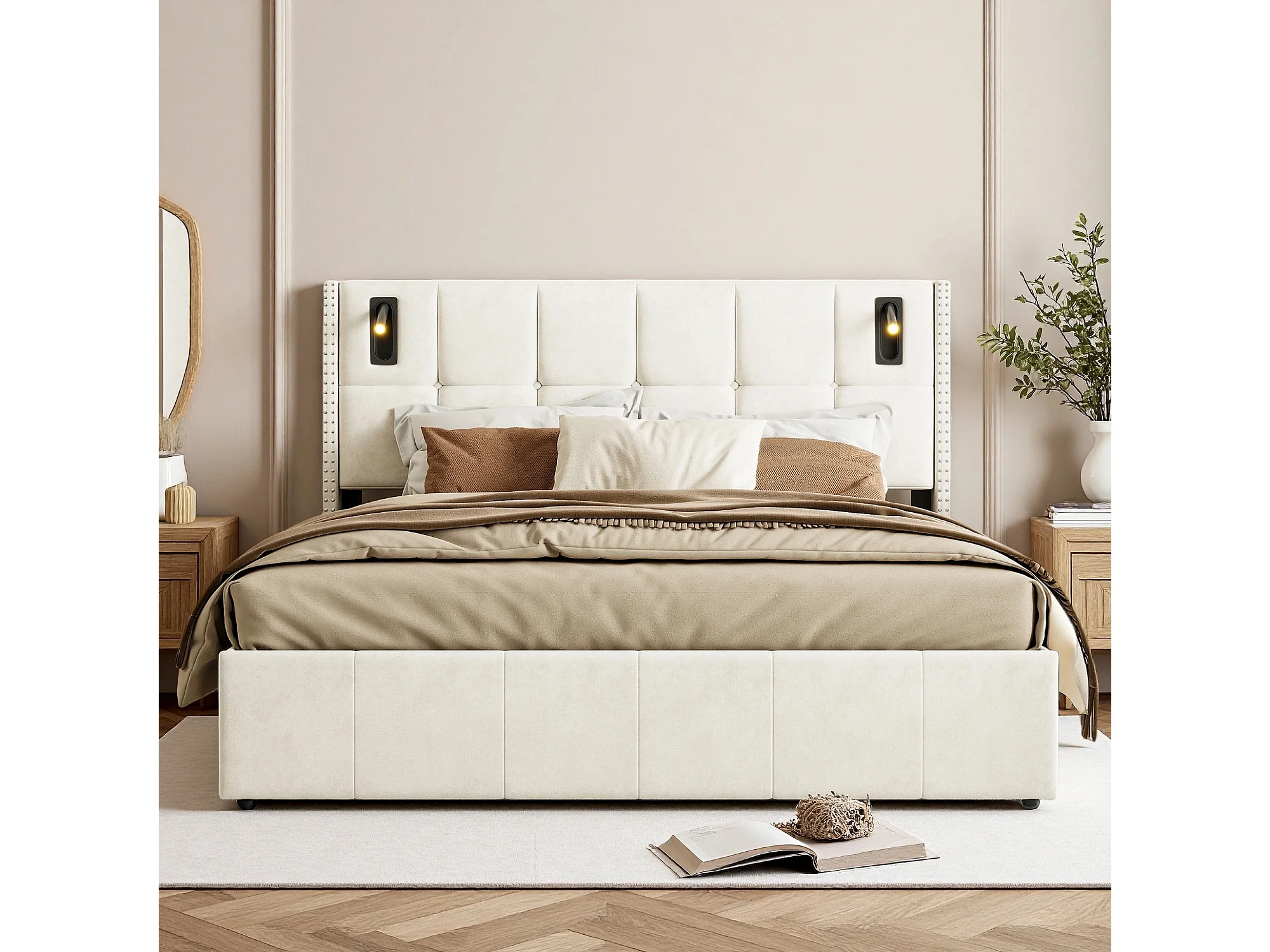 Lit Coffre 160x200 cm en tissu velours avec sommier - lit adulte rembourré - tête de lit USB et Type-c - LED - Beige