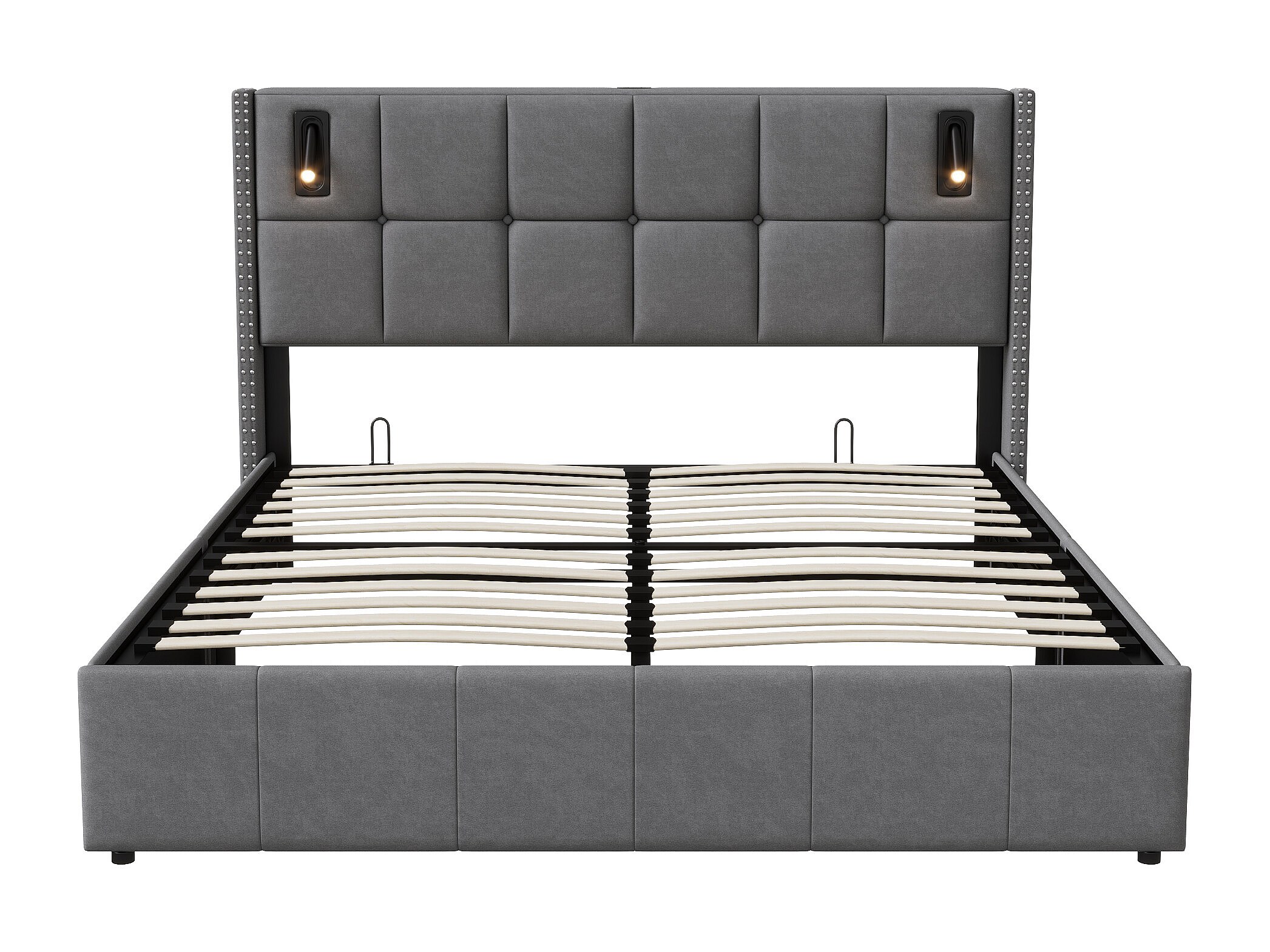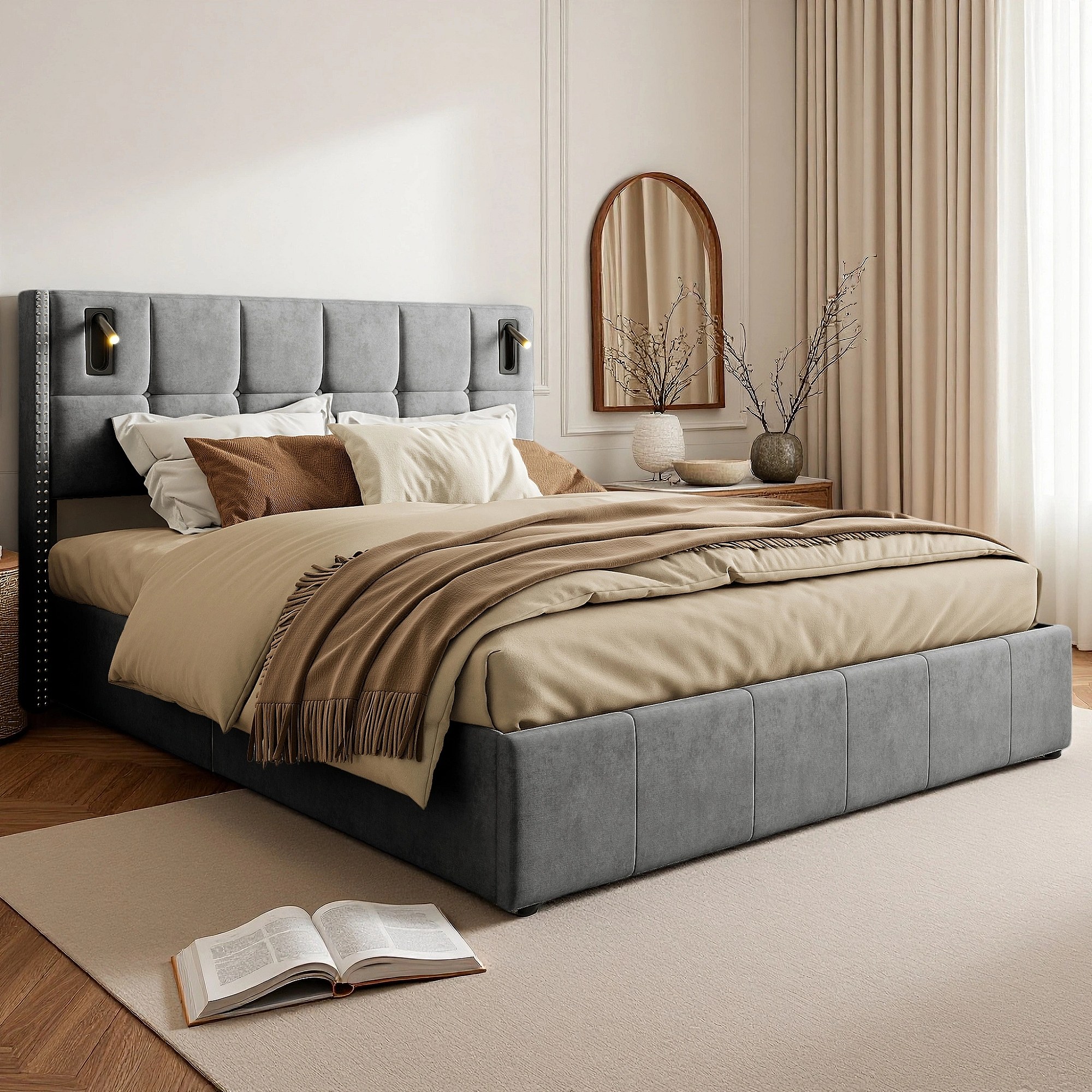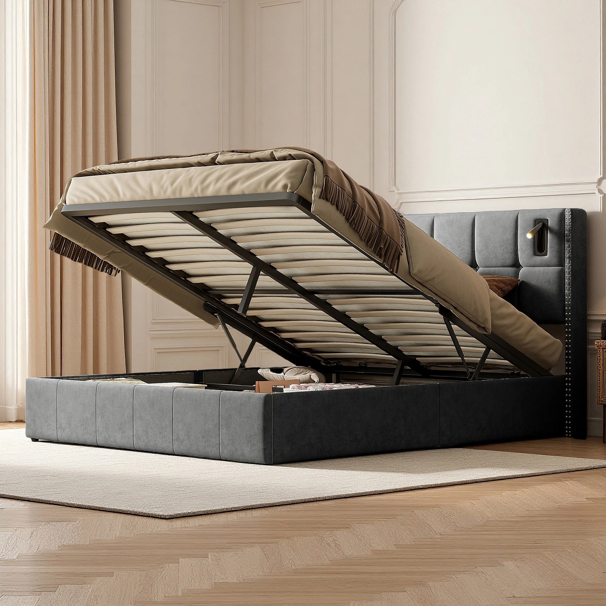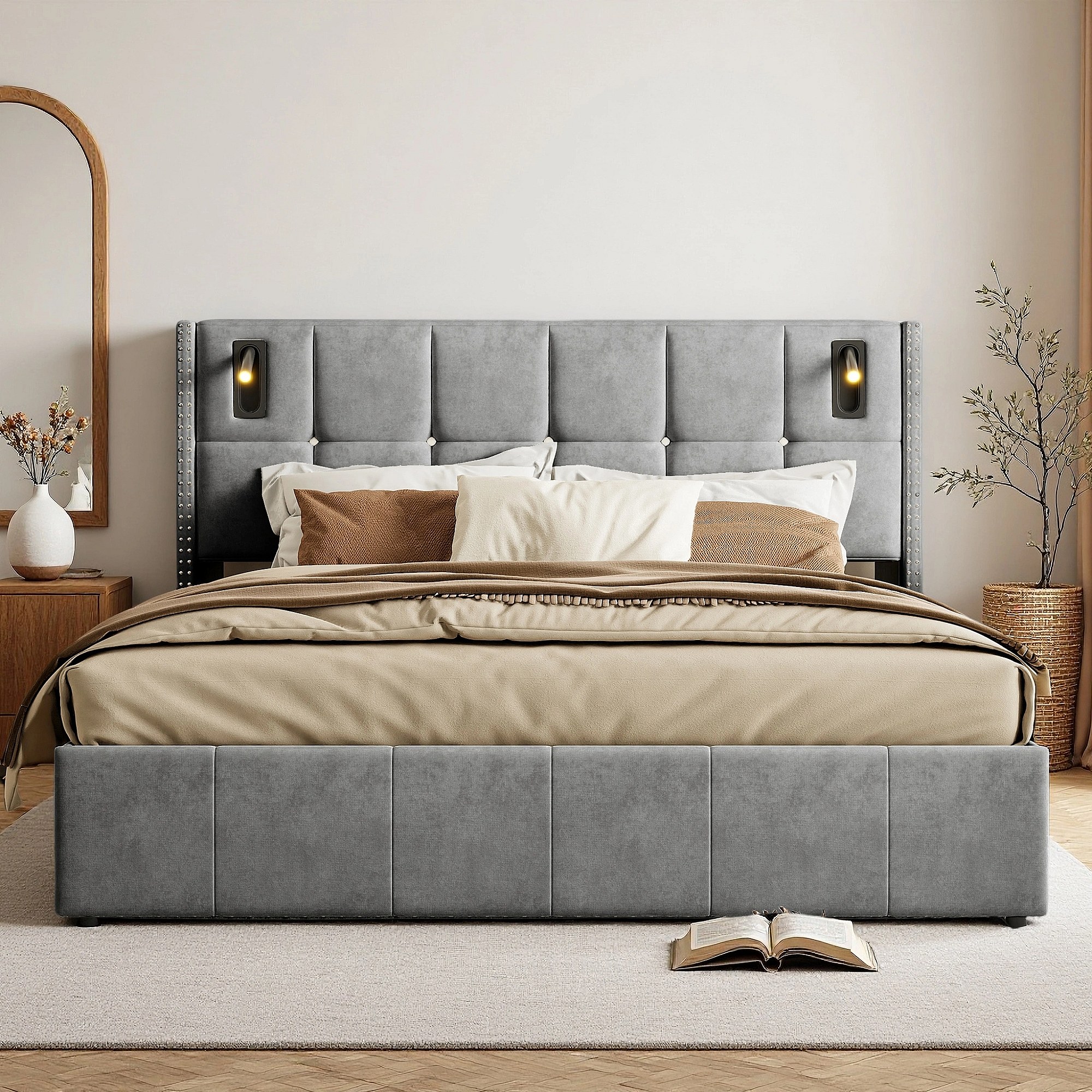 Lit 160x200 cm - NEXU - lit 160x200 cm Capitonné avec tiroir et lampe de lecture - lit 160x200 cm tissu en Velours - gris