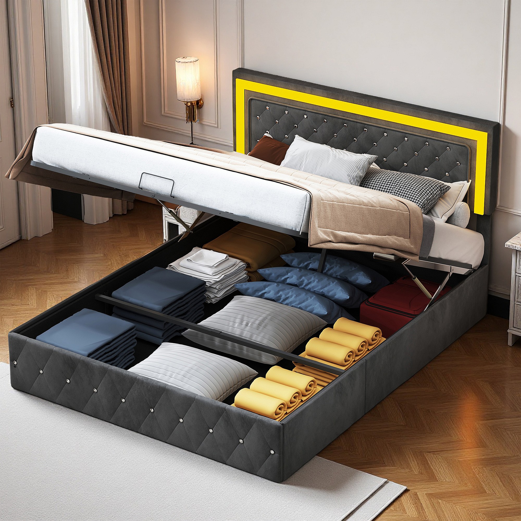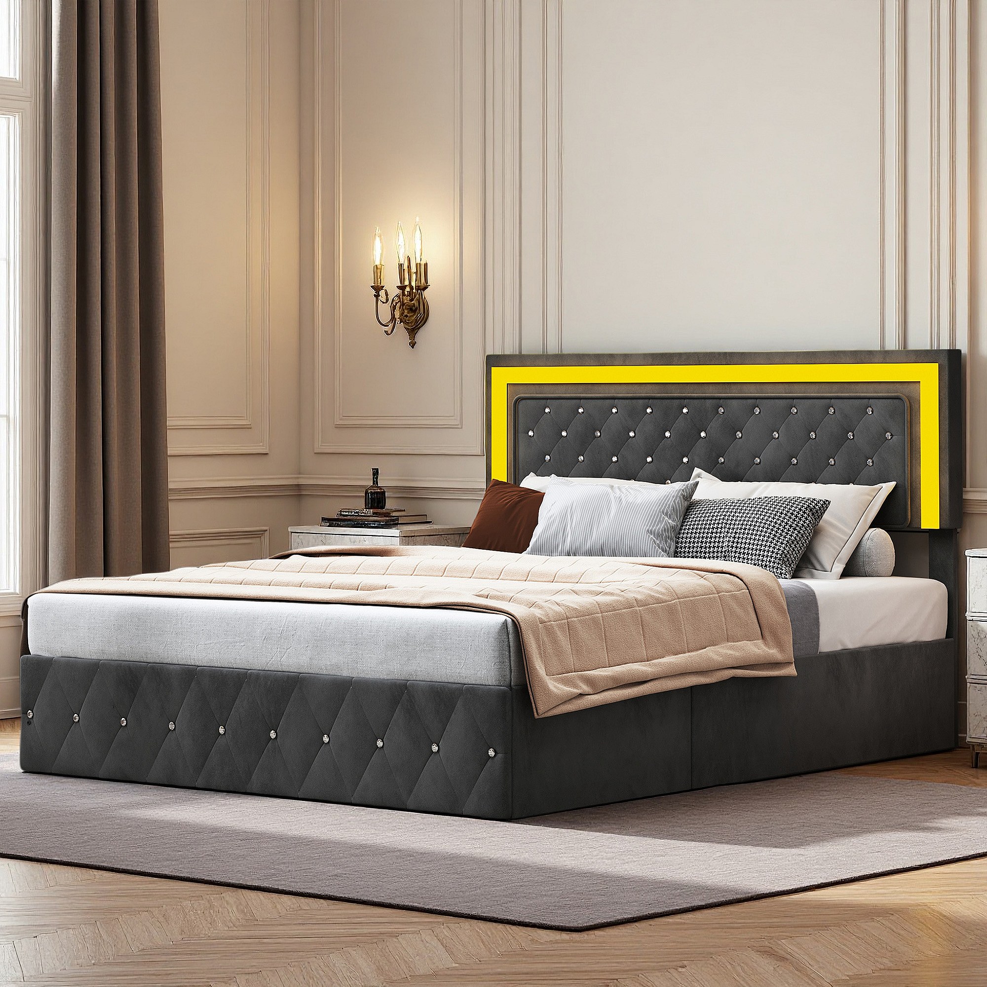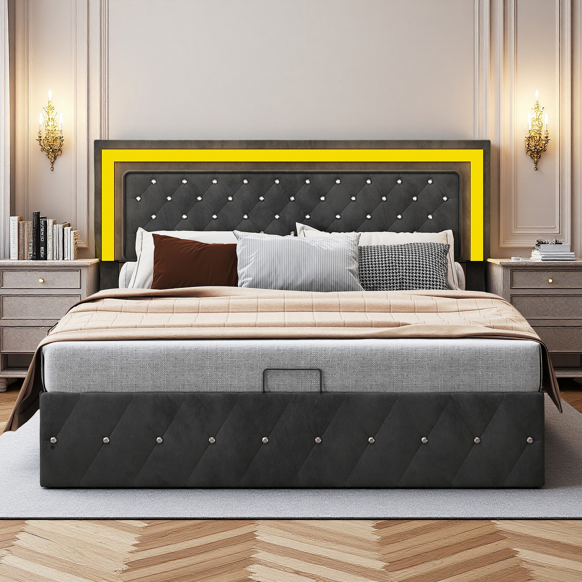 Lit 160x200 cm - NEXU - lit coffre 160x200 cm avec LED - cadre de lit adulte 160x200 cm avec sommier à lattes - tissu en velours - noir