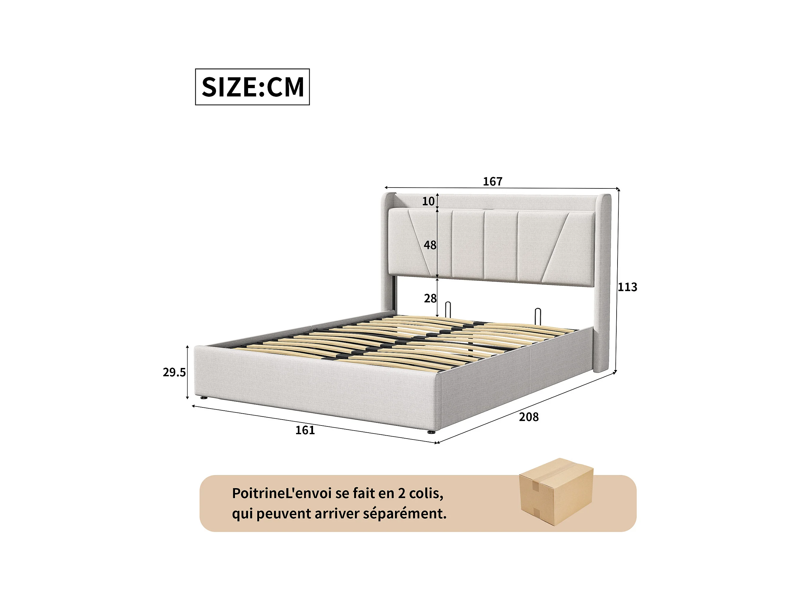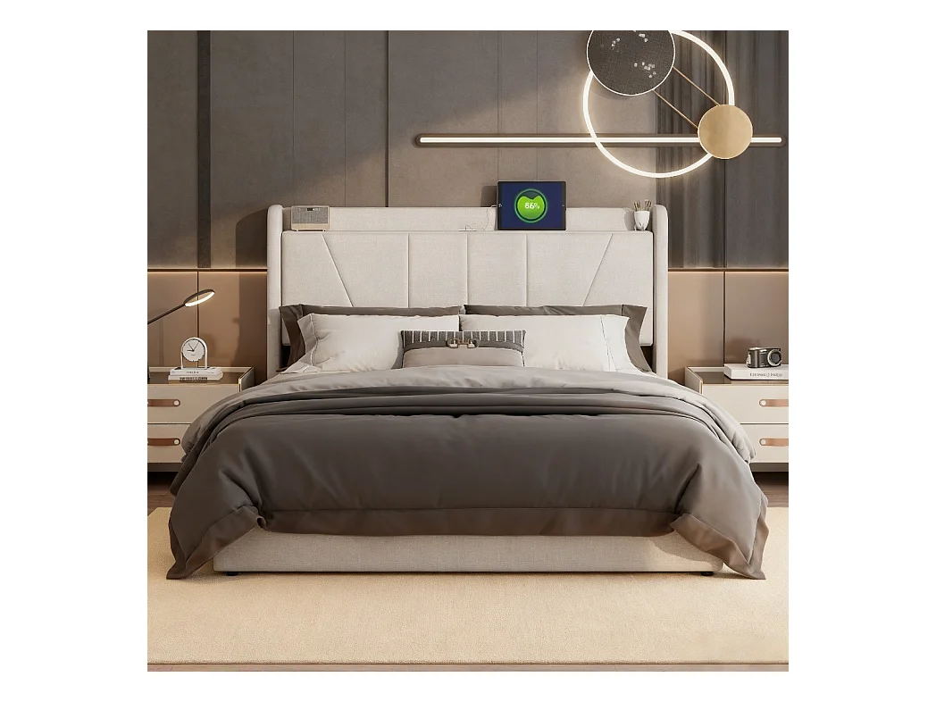 Lit 160x200 cm - NEXU - USB - cadre de lit coffre  Rangement Hydraulique - lit adutle 160x200 cm avec sommier à lattes - lit double 160x200 cm tissu en lin - beige