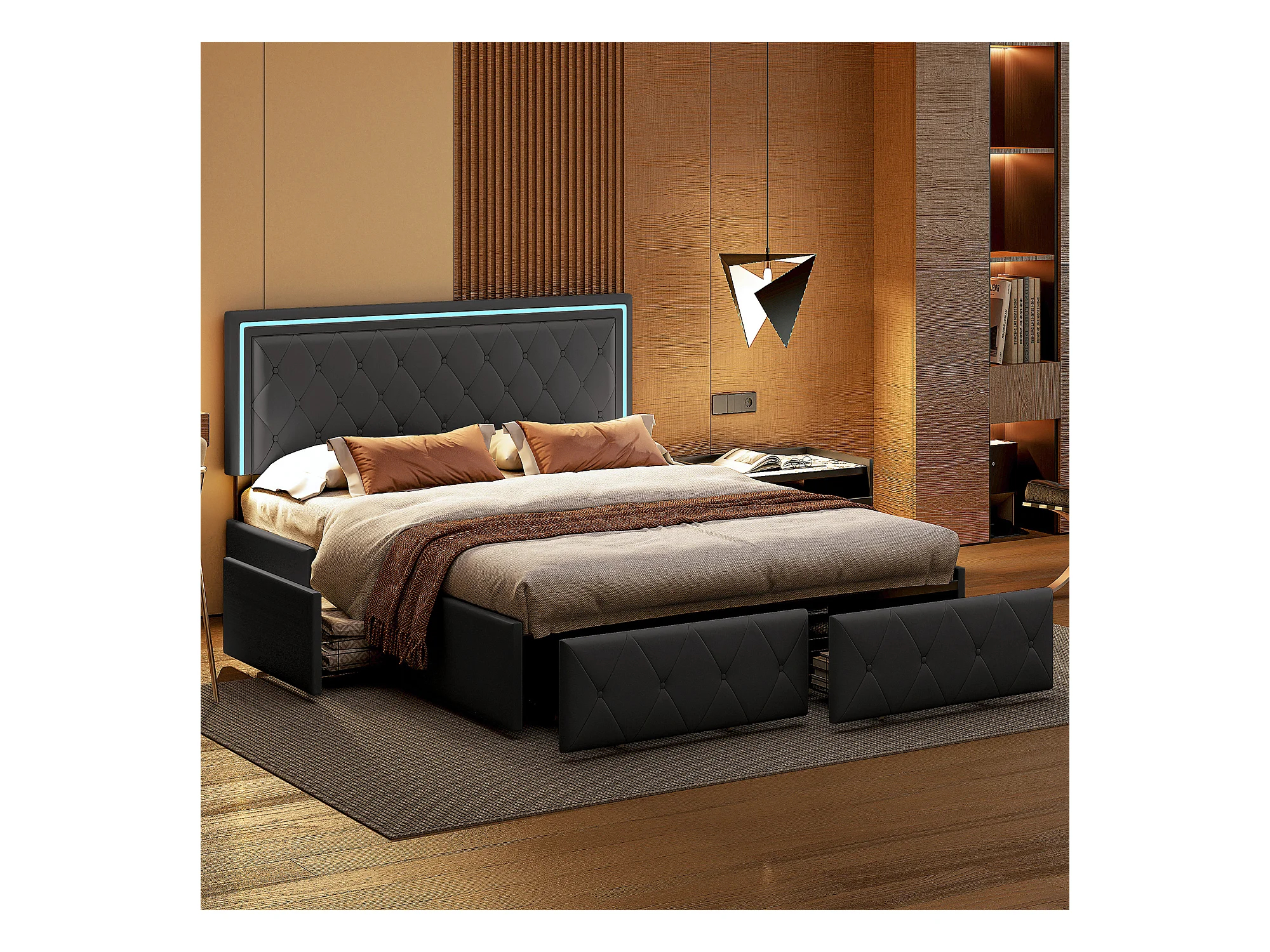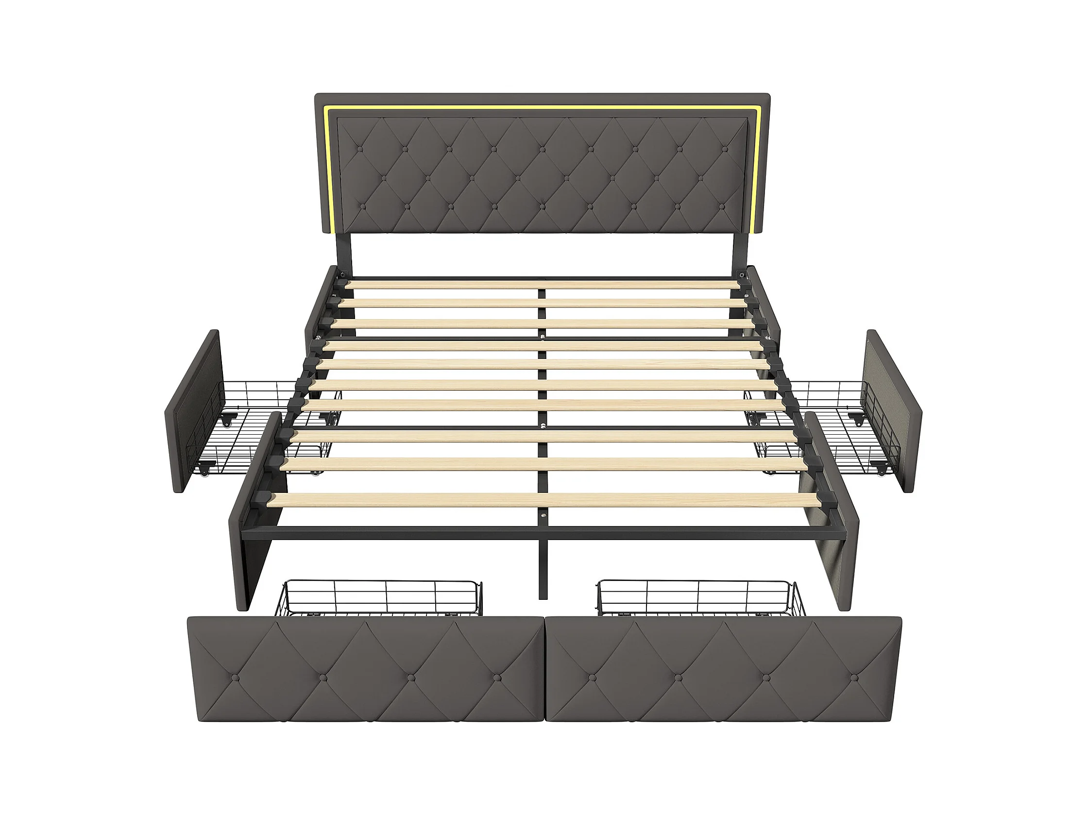 Lit 160x200cm Avec LED Tête De Lit Relevable, Lit Capitonné Avec 4 Tiroirs Et Rangement Lit, Gris