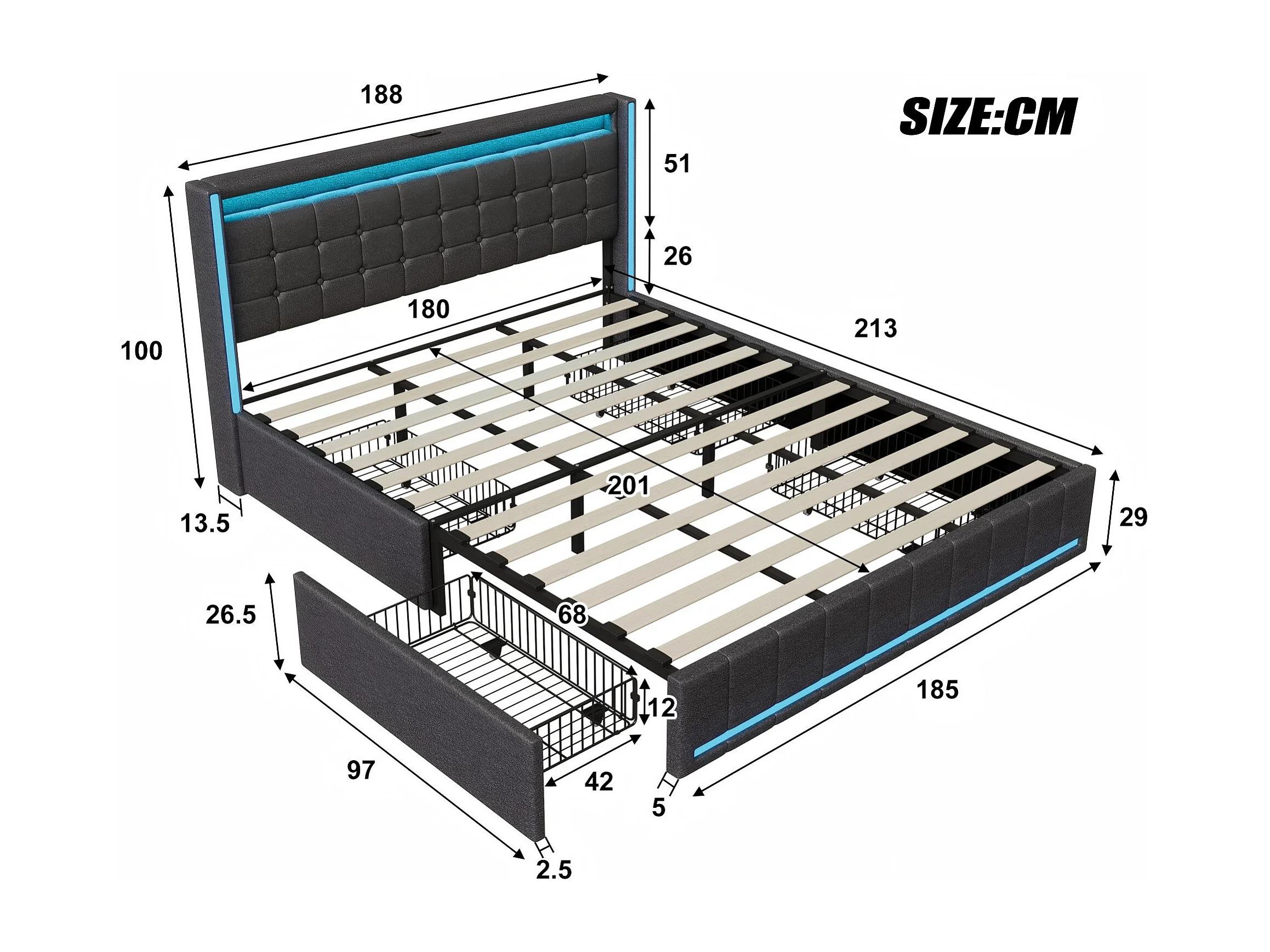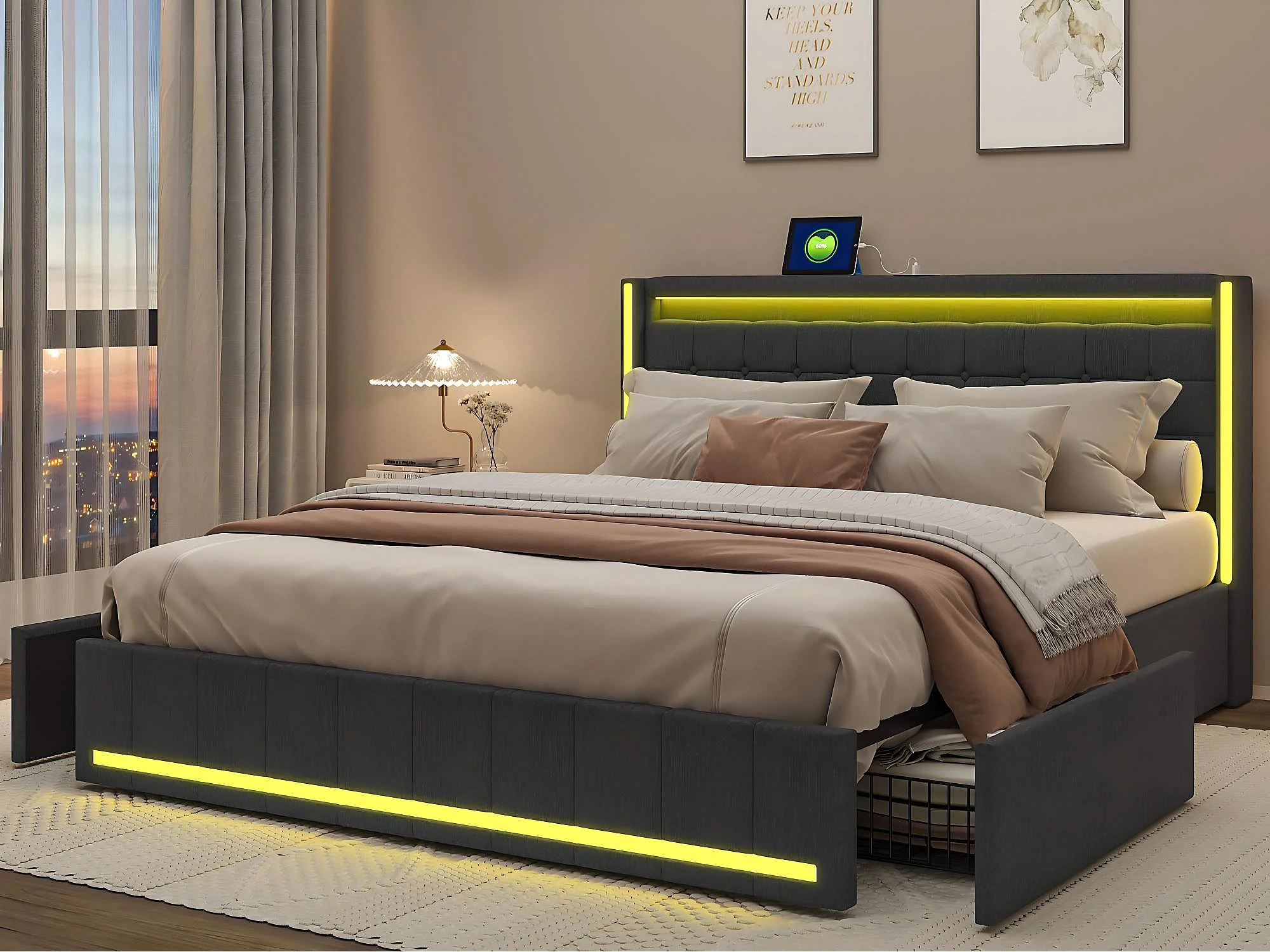Lit 180x200 avec tiroirs, LED, USB Type-C, lit rangement avec roulettes, cadre de lit en tissu lin