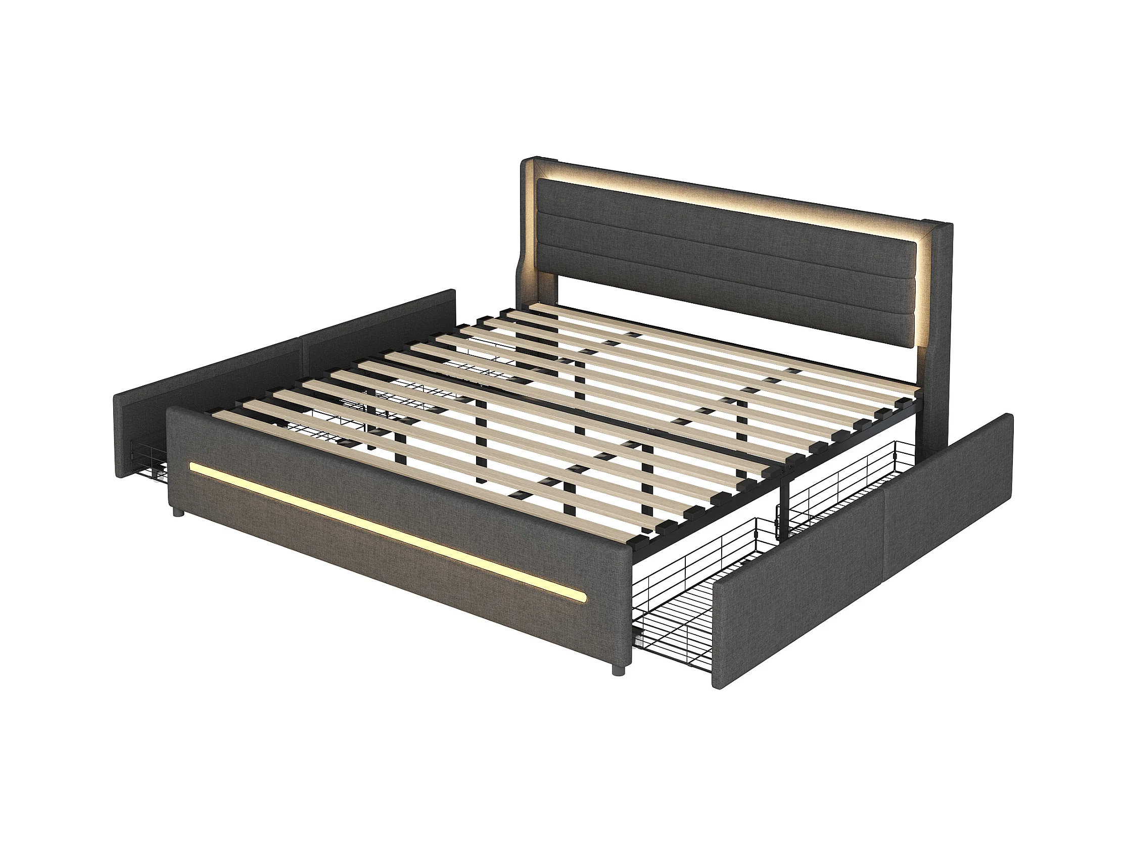 Lit 180x200 cm gris en lin avec LED multicolores, 4 étagères, sommier inclus, sans matelas
