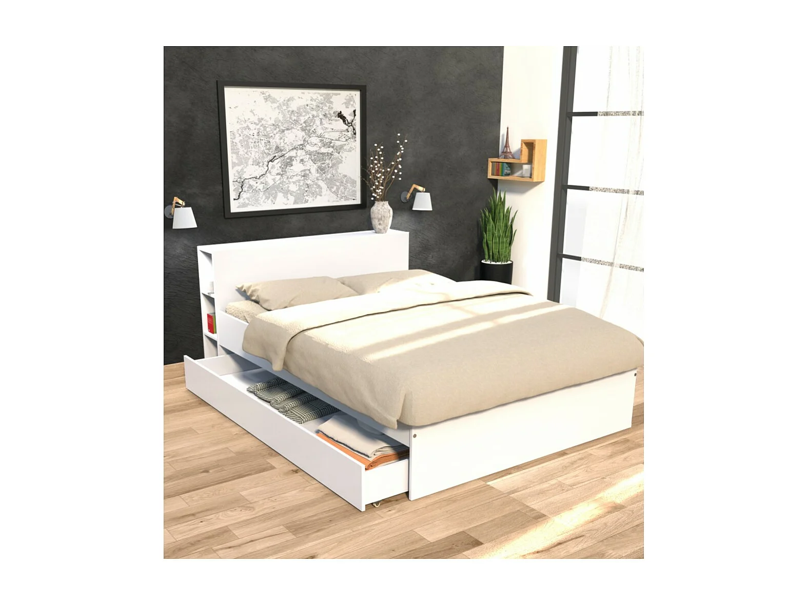 Lit 2 places 140x190cm Blanc ROGO inclus sommier et tete de lit avec étageres et 1 tiroir