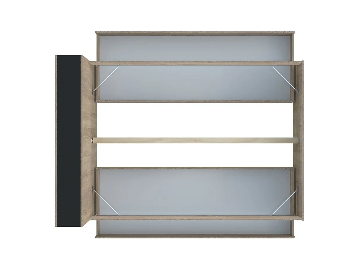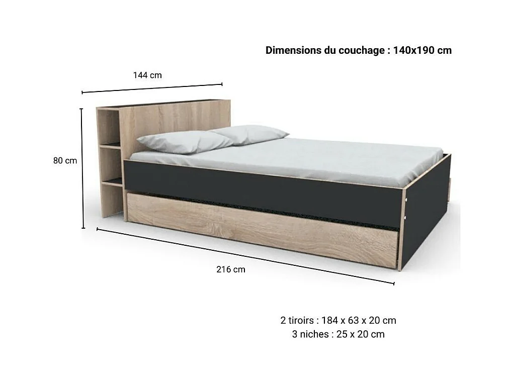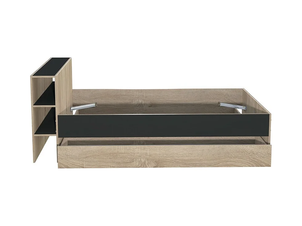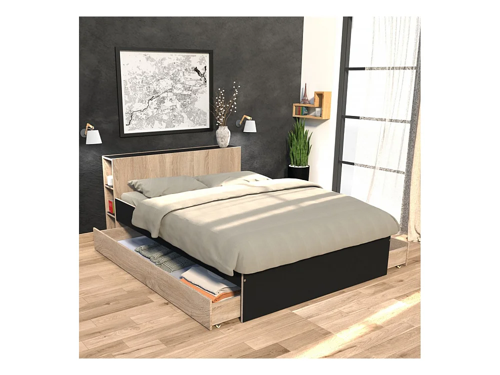 Lit 2 places 140x190cm Noir et chêne ROGO inclus sommier et tete de lit avec étageres et 2 tiroirs