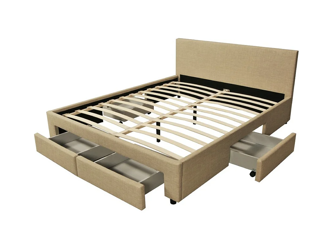 Lit 2 places 140x190cm Tissu Beige LOUGNE inclus sommier et 4 tiroirs