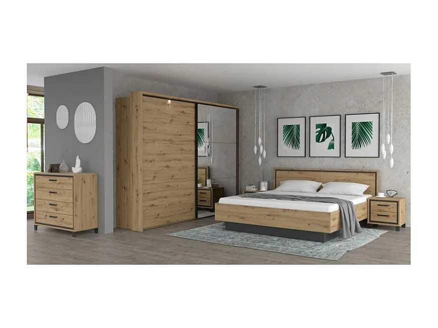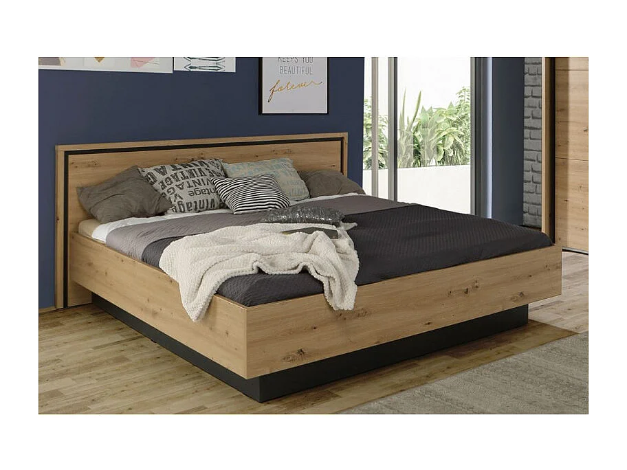 Lit 160 x 200 cm tête de lit décor chêne naturel et noir mat - ALIA