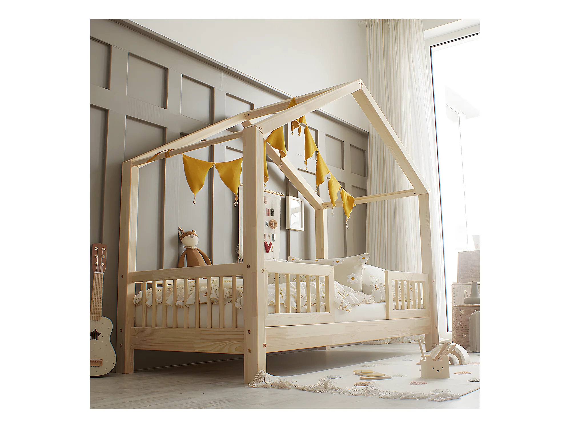 Lit cabane 90x190 barrières et sommier inclus pieds 10 cm Iris Bois