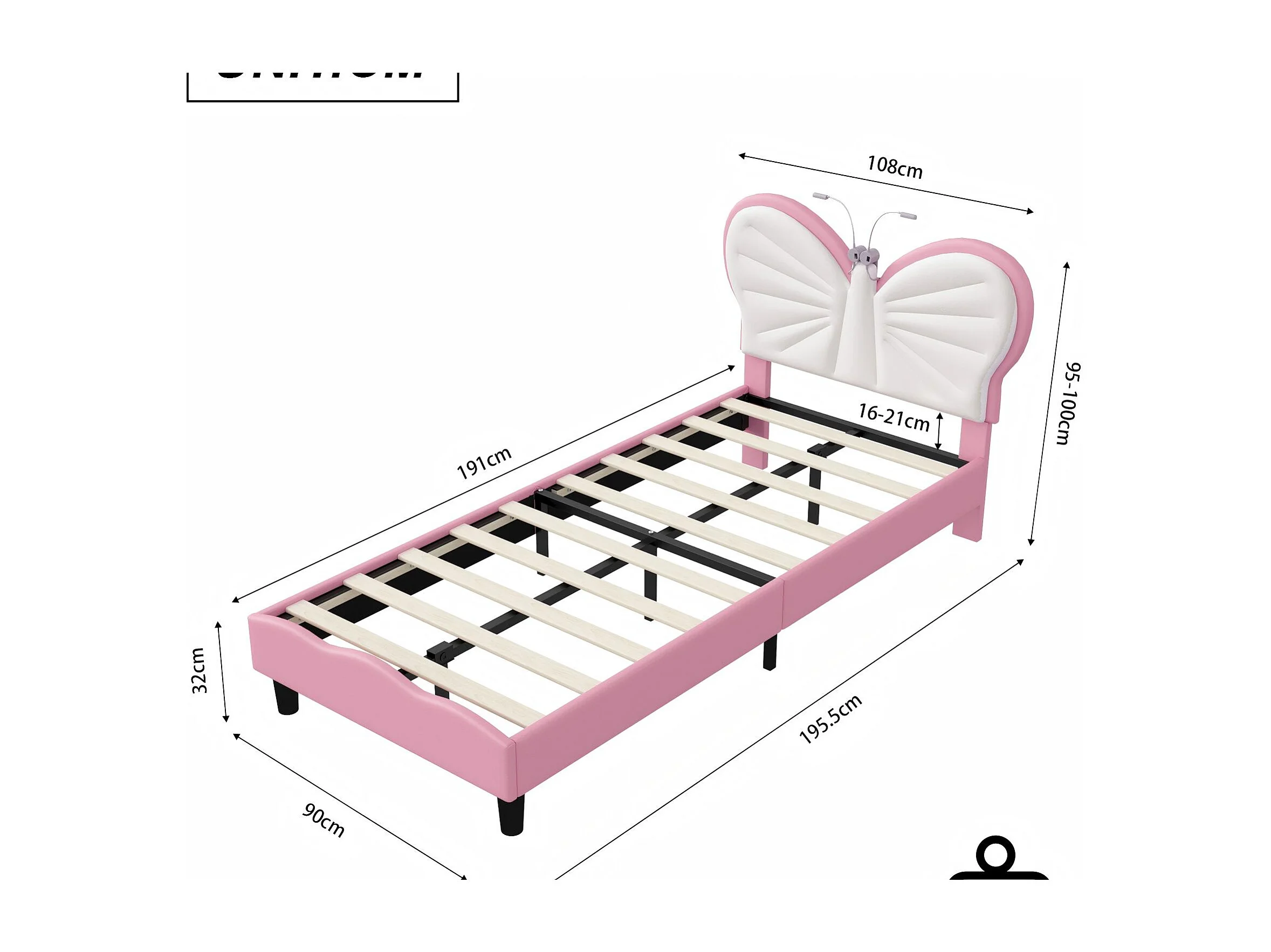 Lit 90x190 enfant avec LED, lit rembourré velours, tête de lit papillon réglable, sommier à lattes