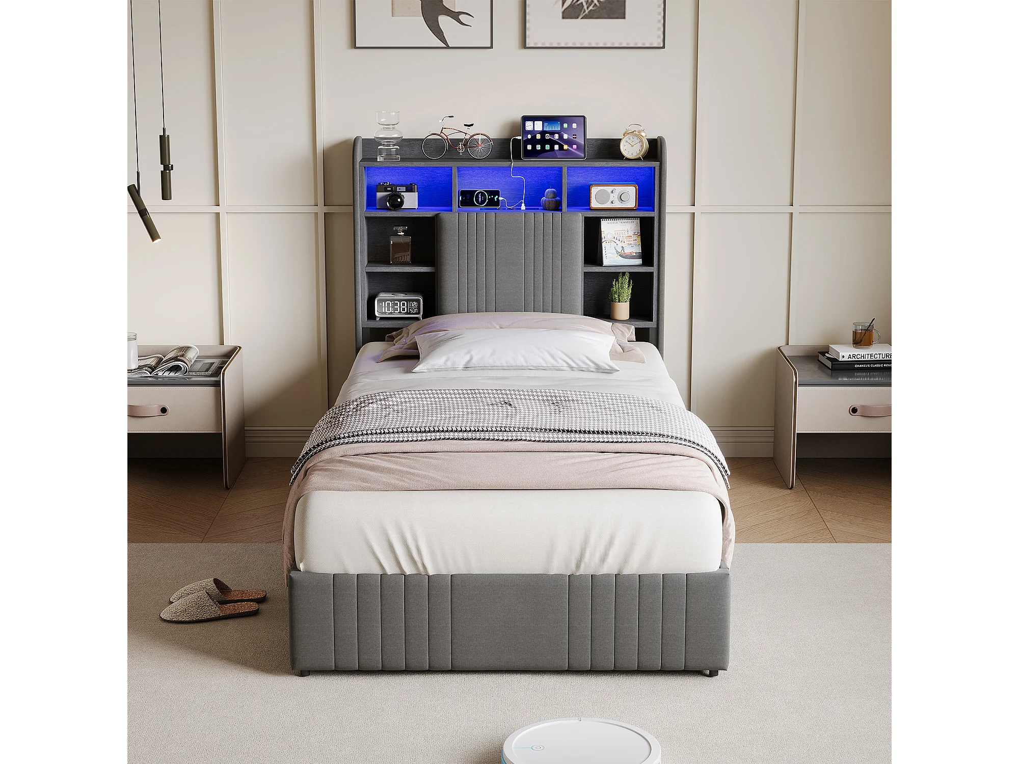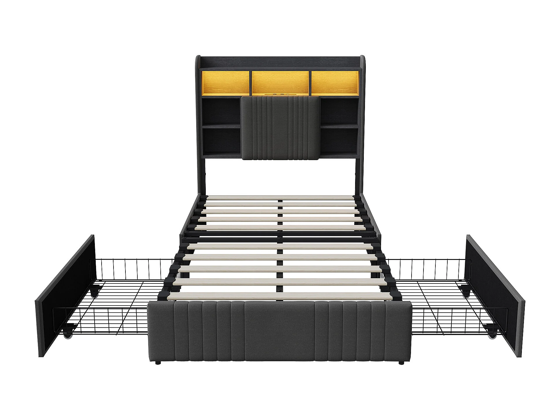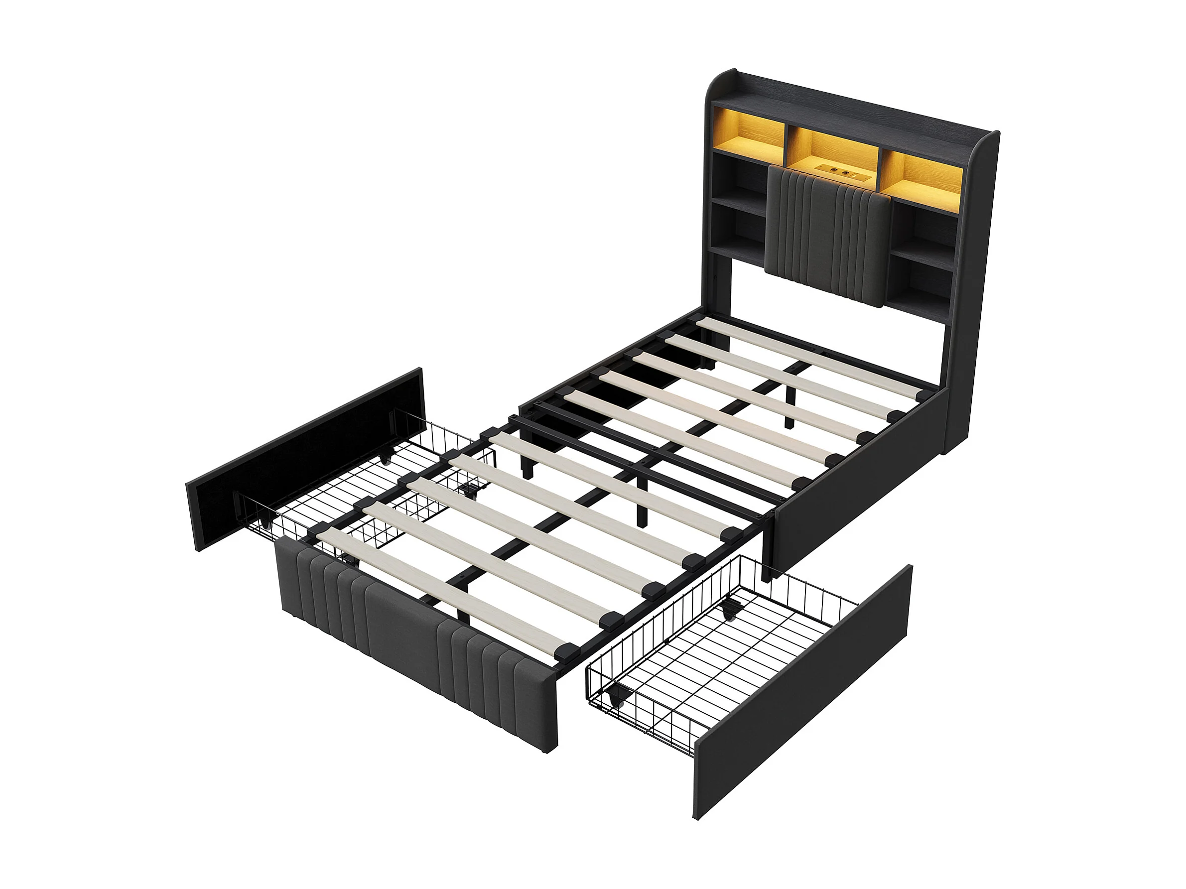 Lit 90x200 cm - avec 2 tiroirs - chargement USB et Type-C - éclairage LED - tables de chevet avec rangement - cloisons ouvertes - sommier à lattes - Gris