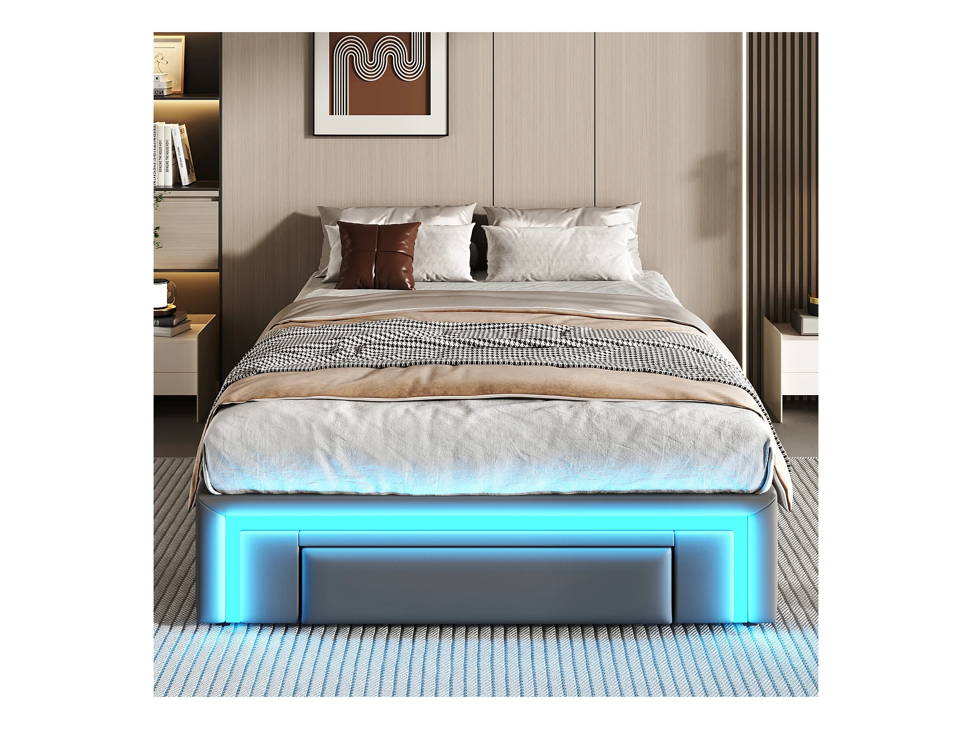 Lit 90×200 cm en PU cuir gris avec tiroirs, sans tête de lit, cadre en métal avec éclairage LED