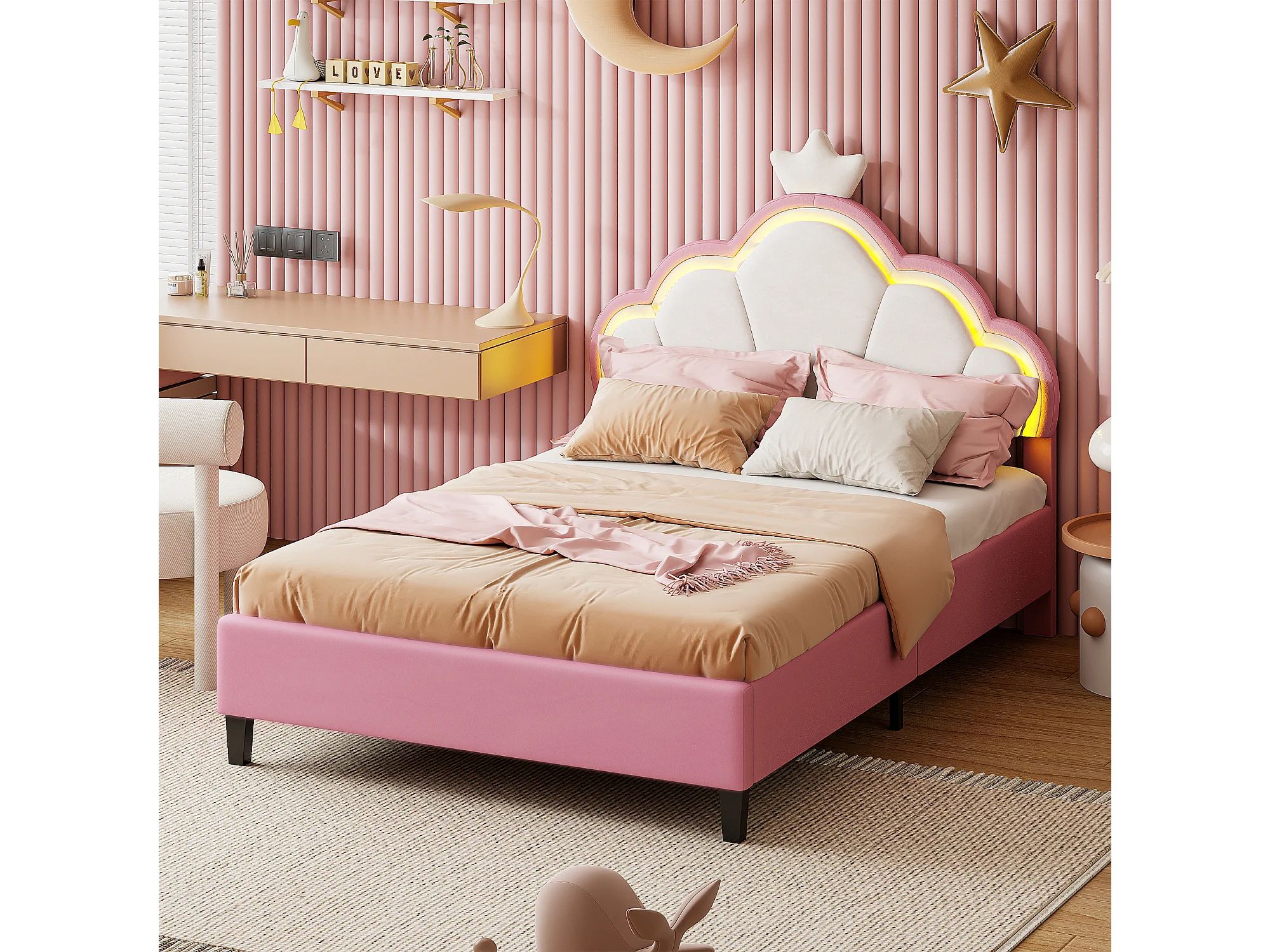 Lit 90x200 cm en Velours Rose et Blanc avec Éclairage LED, Design Couronne, Télécommande et Modes Personnalisables