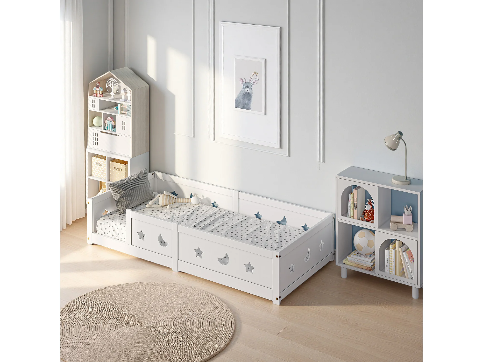 Lit bois 90x200 cm pin - lit enfant 90x200 cm - lit bébé avec barrières 90x200 cm - étoile lune cadre de lit 90x200 cm - blanc