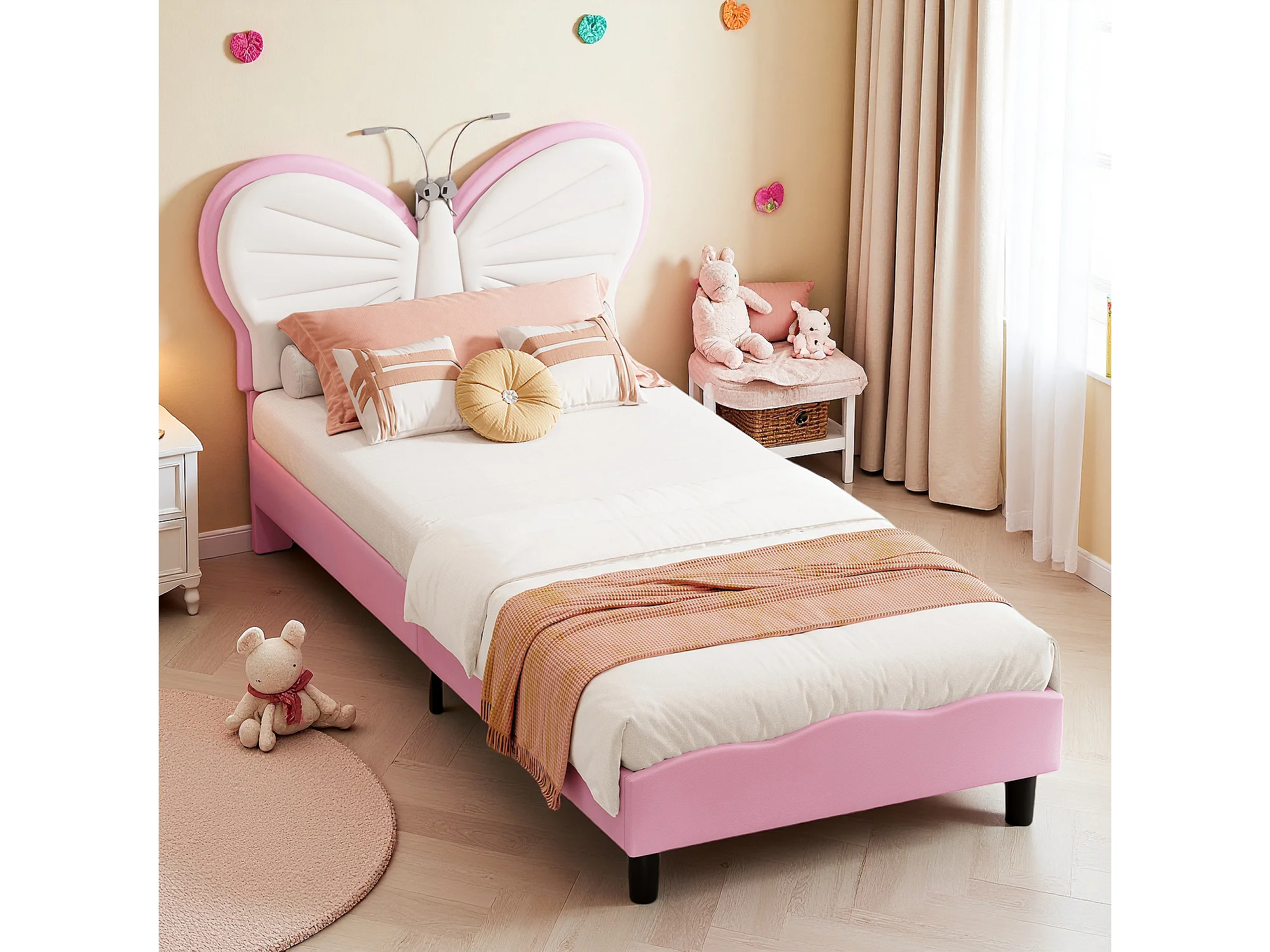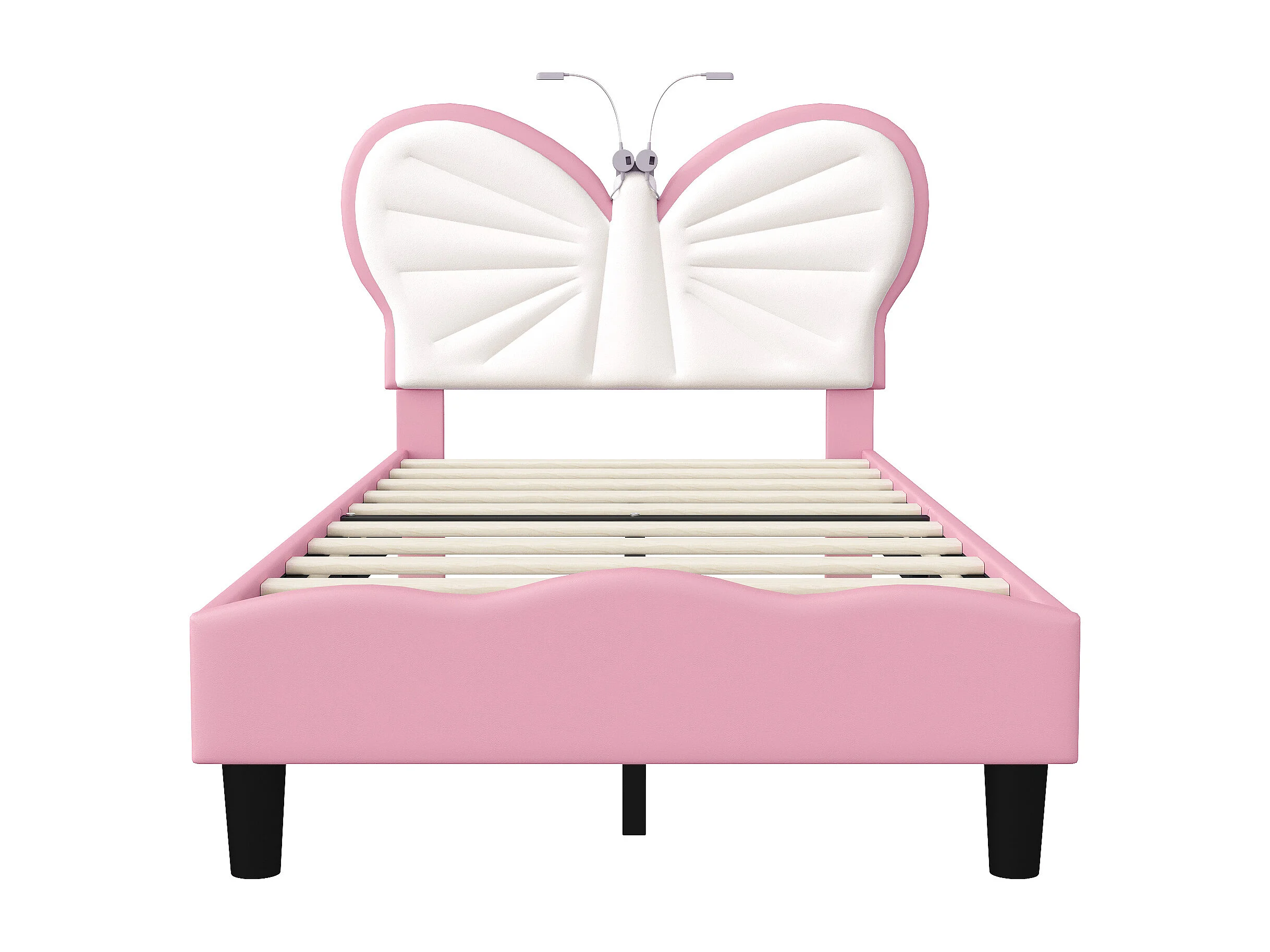 Lit rembourré en enfant 90x200 cm,sommier à lattes de bois, tissu en PU, forme papillon avec LED,cadre de lit fille, rose