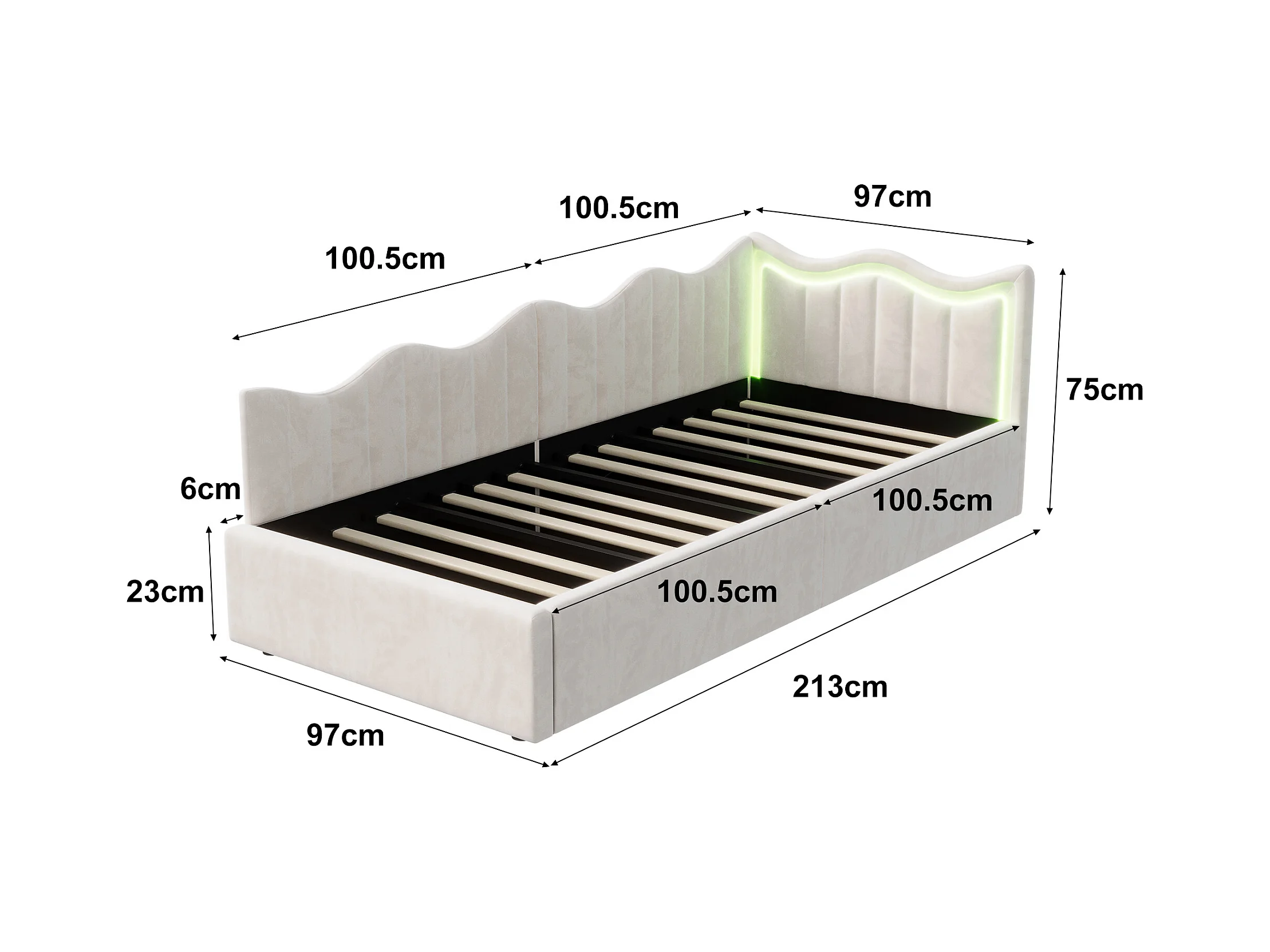 Lit simple 90x200 cm - NEXU - lit enfant 90x200 cm avec LED - lit coffre 90x200 cm avec sommier à lattes - tissu en velours - blanc cassé