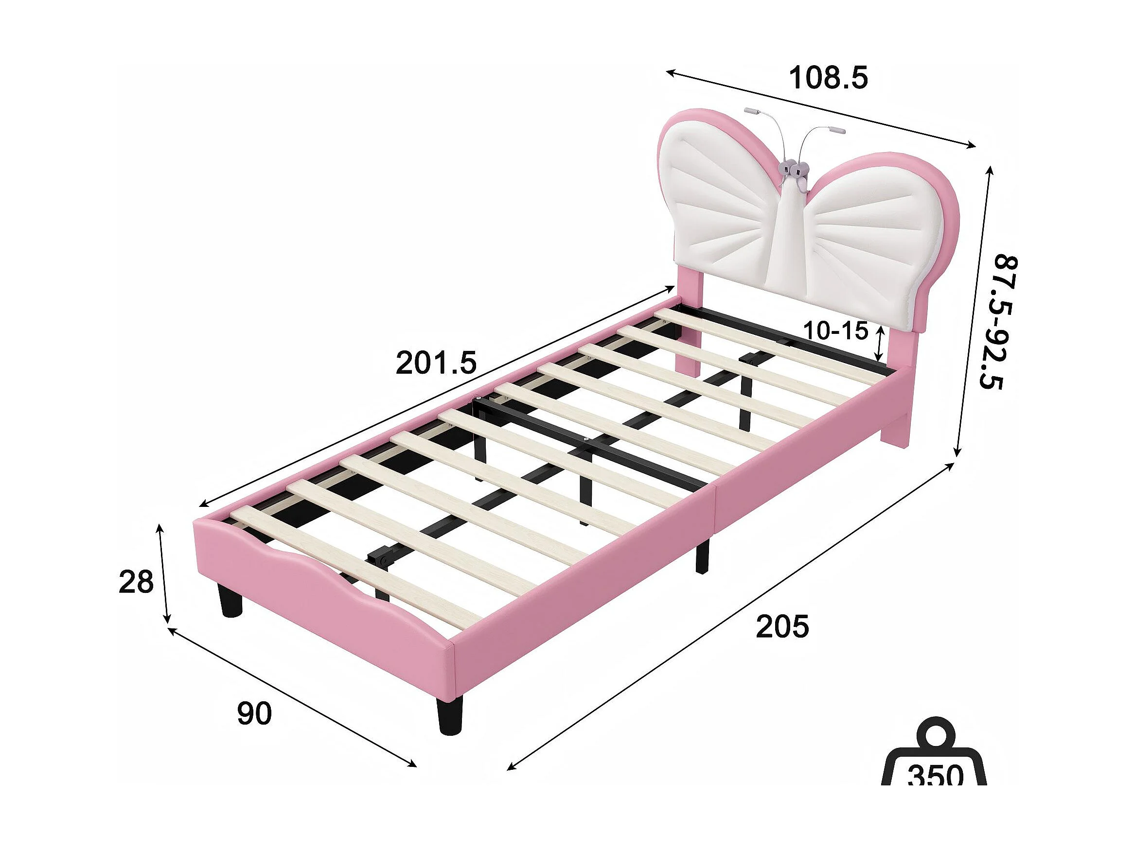 Lit 90x200 enfant avec LED, lit rembourré velours, tête de lit papillon réglable, sommier à lattes