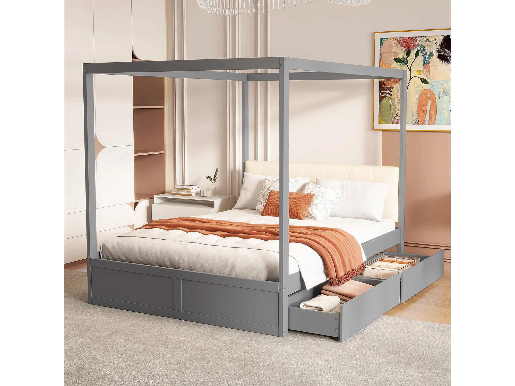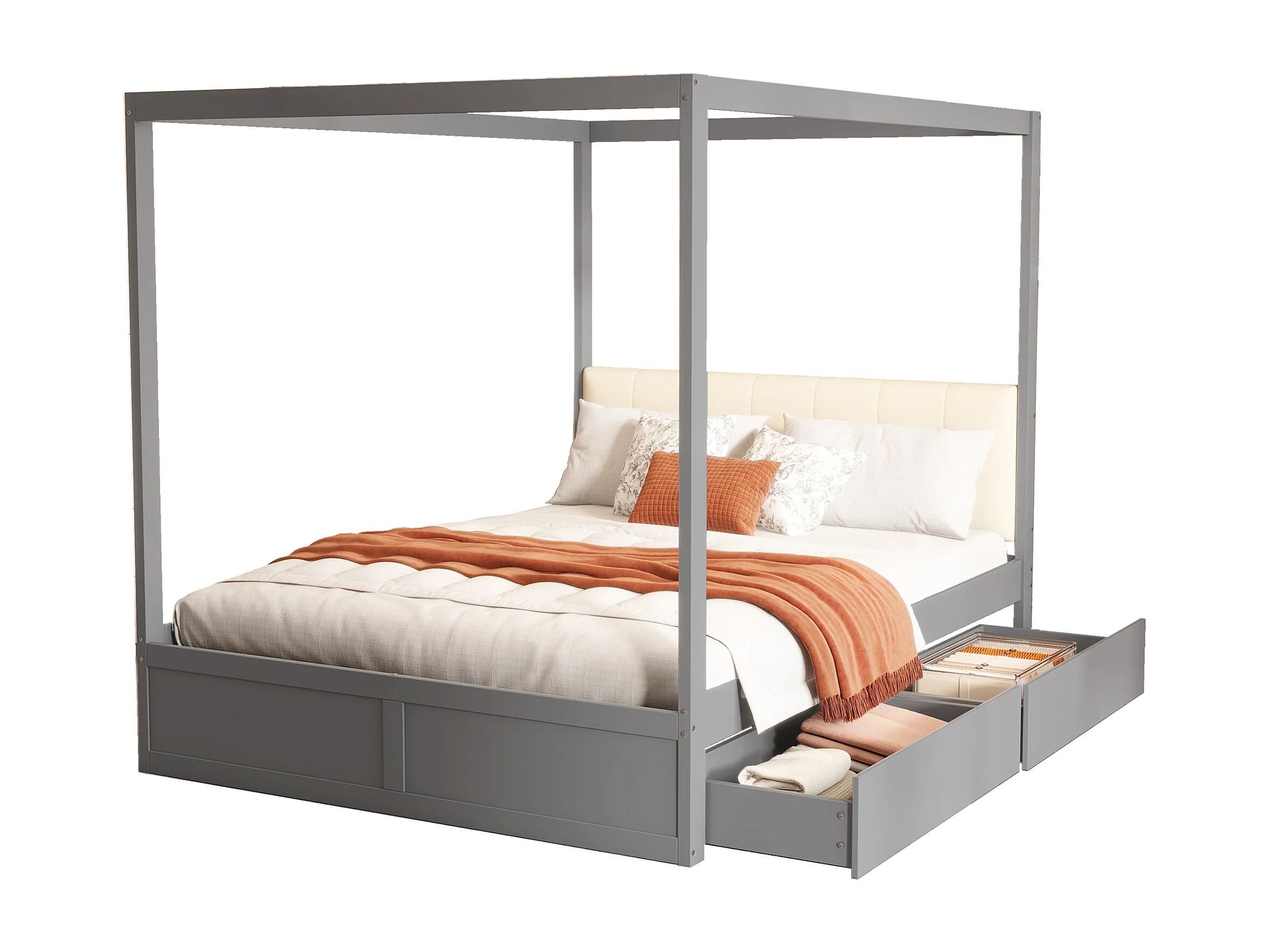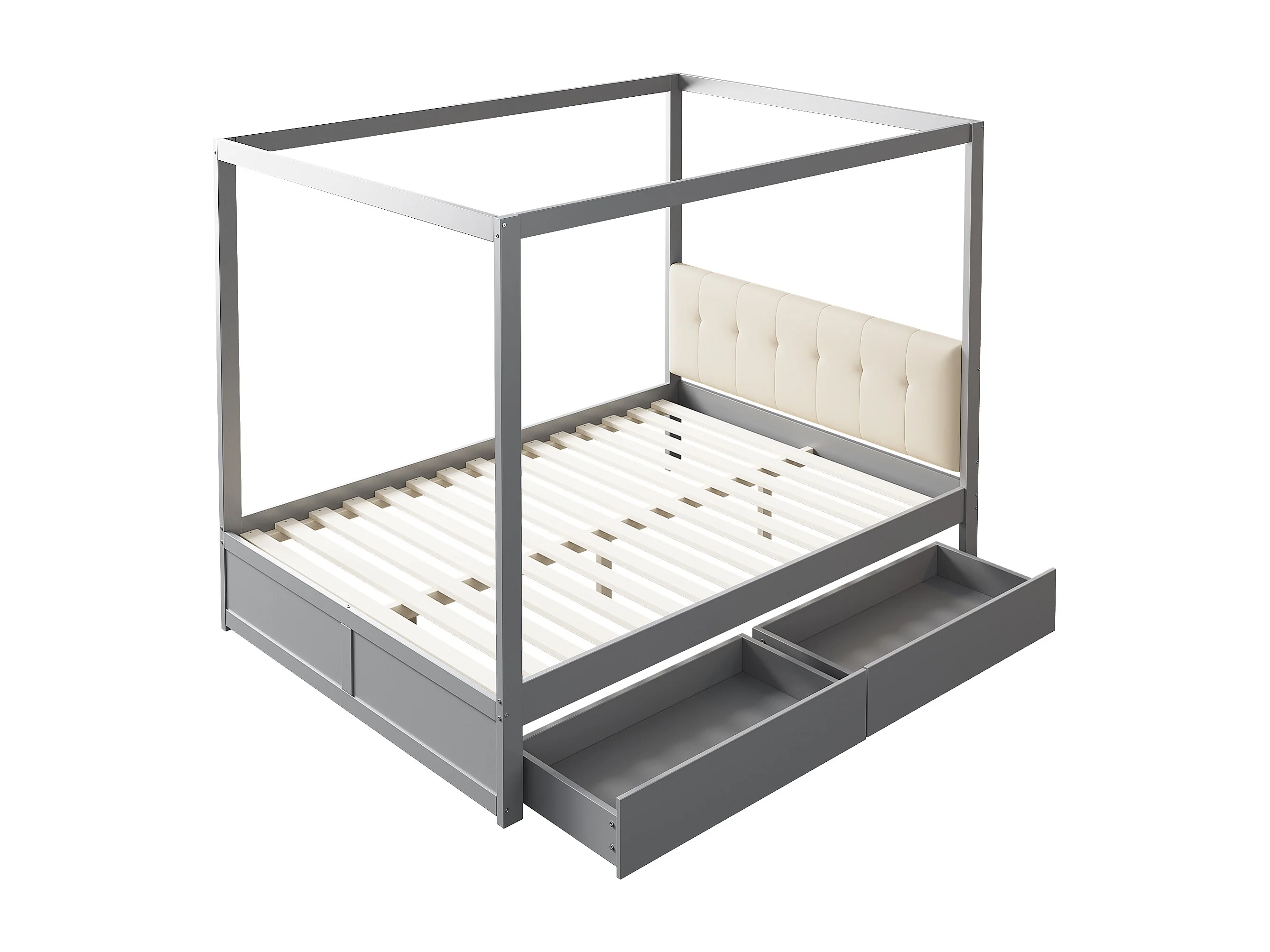 Lit à baldaquin 140x200 cm en bois gris avec grands tiroirs et tête de lit douce, lit double pratique