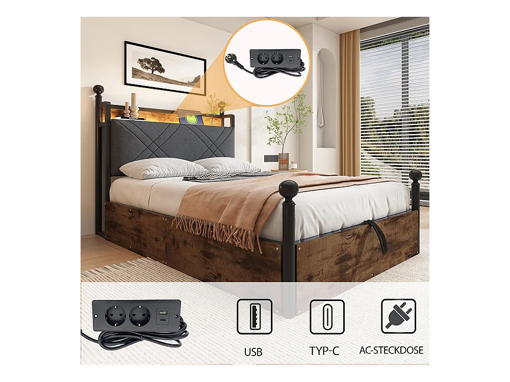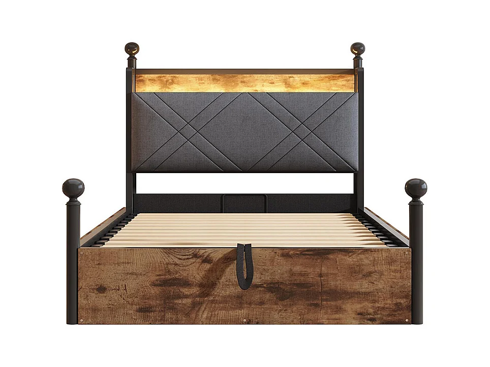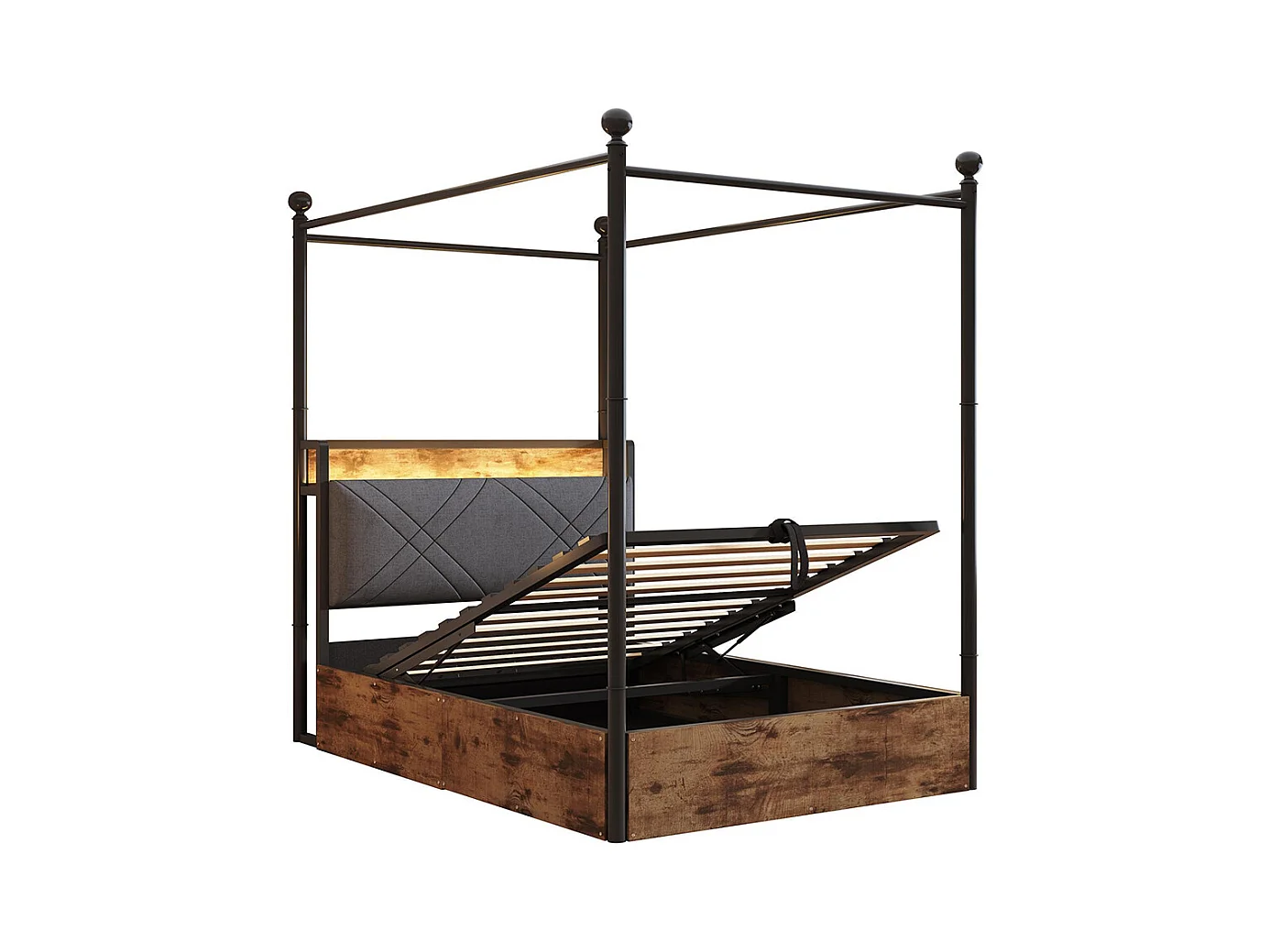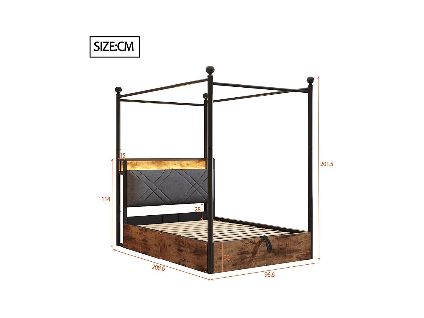 Lit à baldaquin en fer 90x190 avec rangement hydraulique baldaquin fer forgé montants amovibles LED USB Type C pour adolescent noir