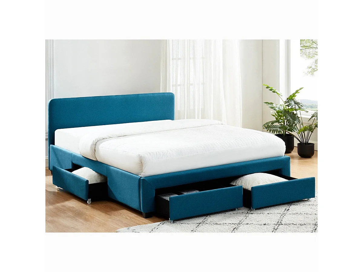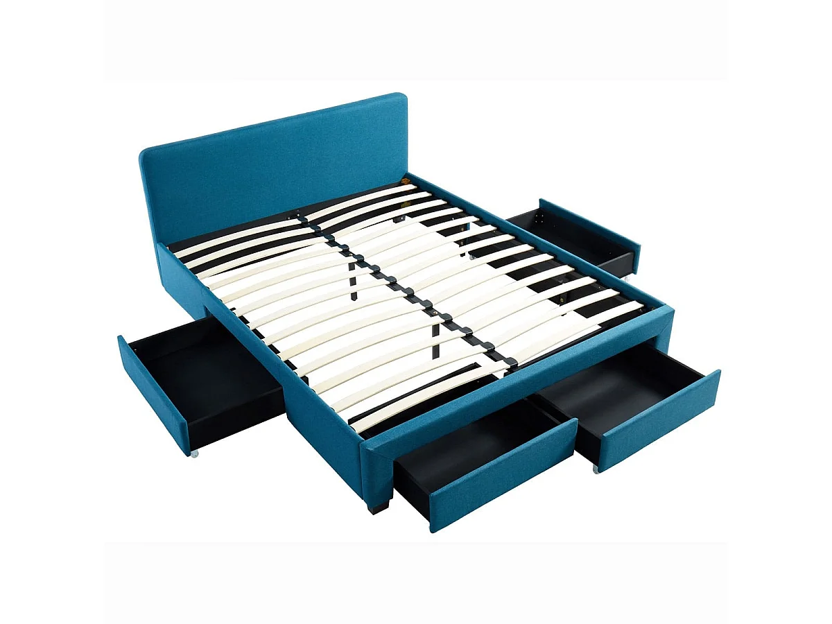 Lit à tiroirs 140x190 en tissu bleu canard avec tête de lit et sommier à lattes - Collection Stan